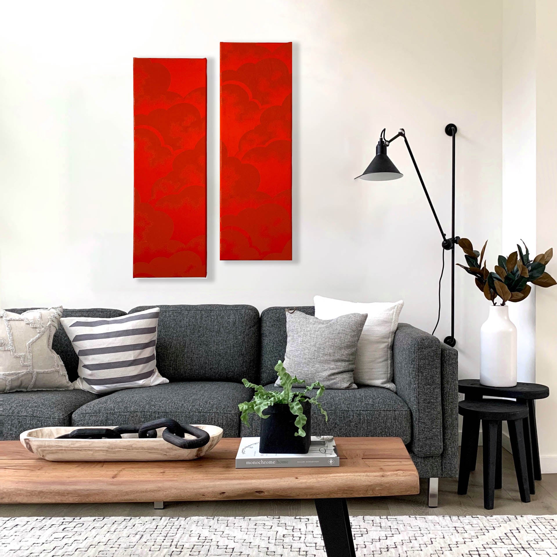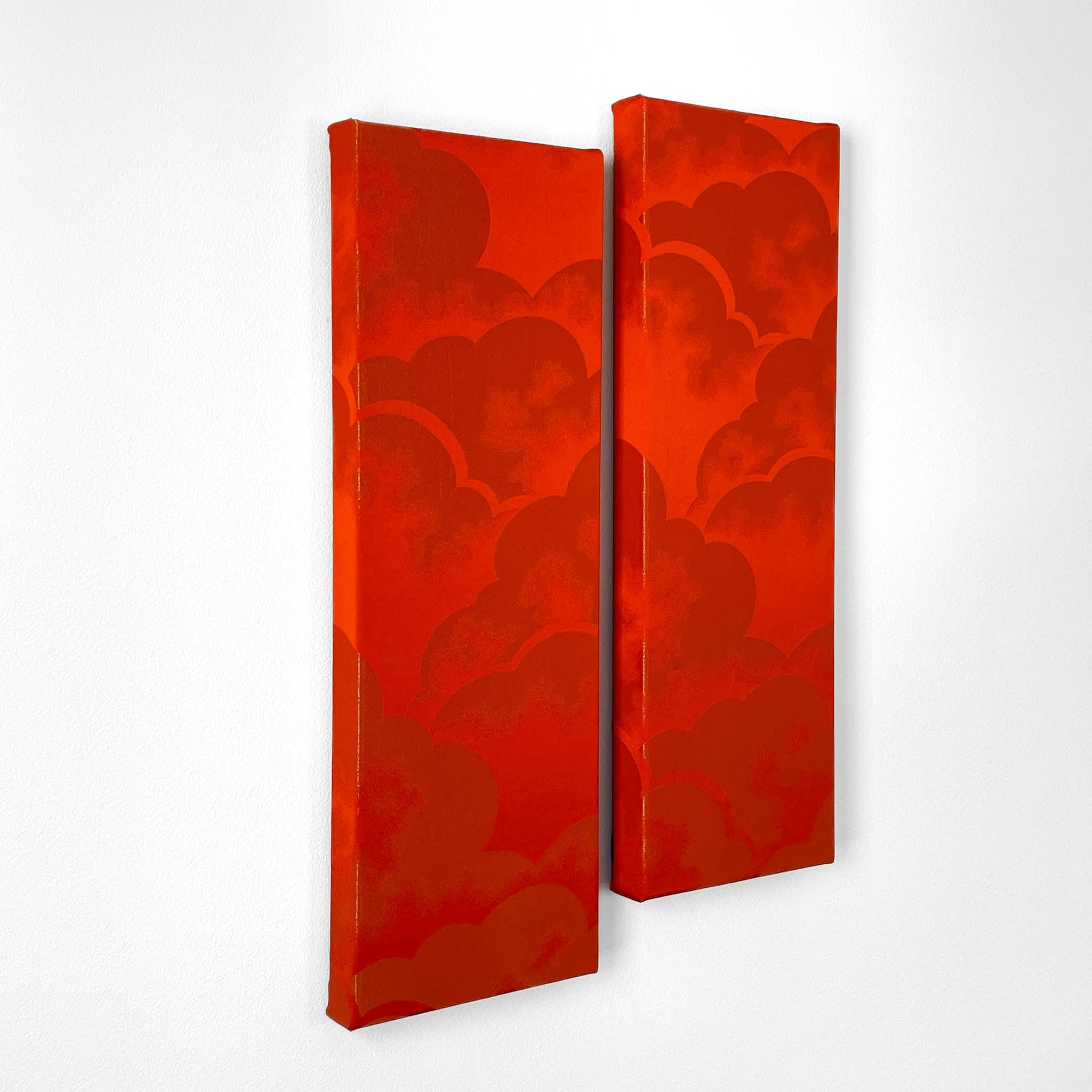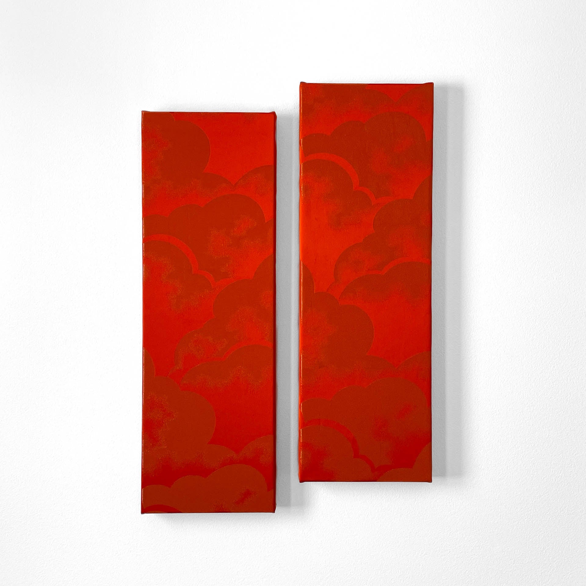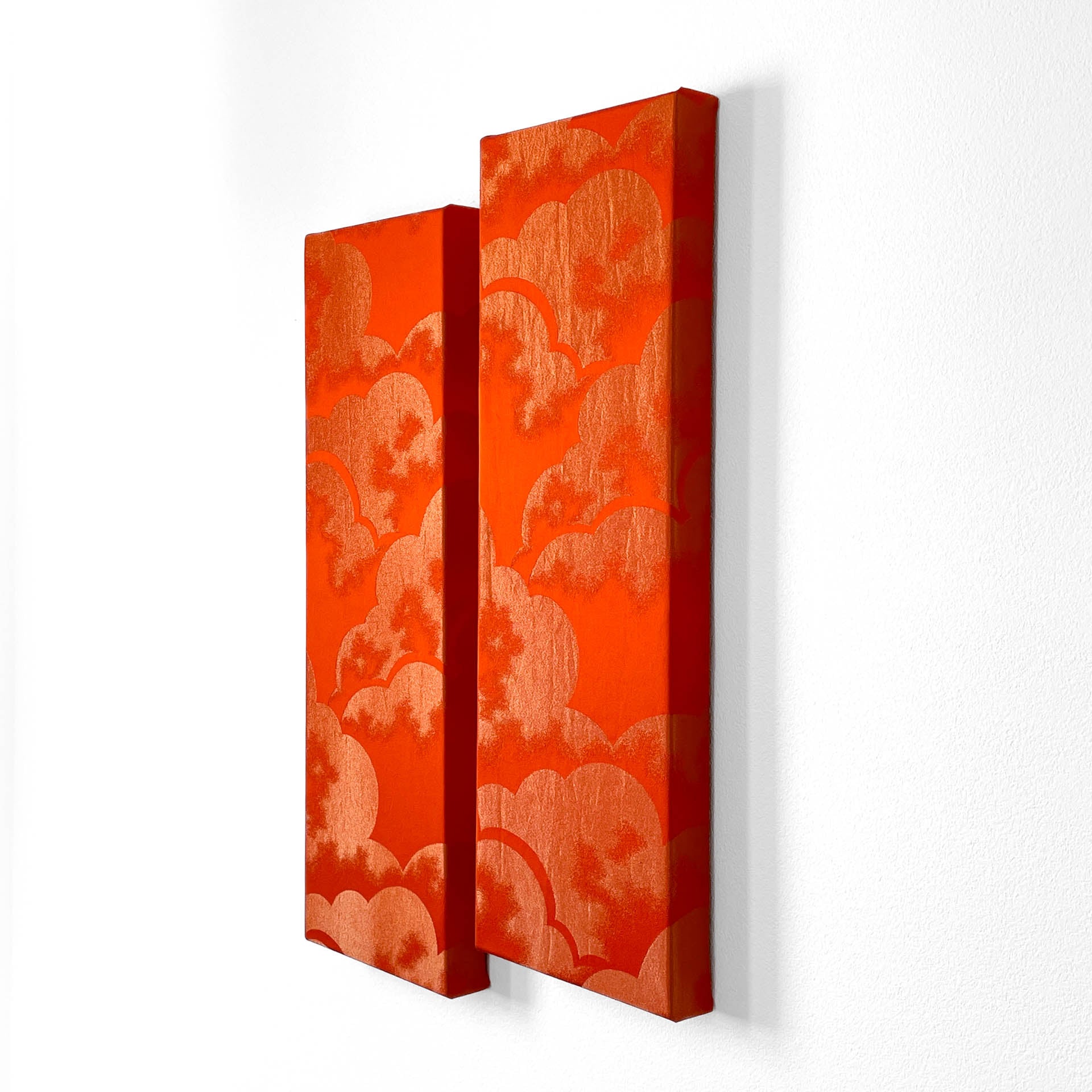 This artwork skillfully captures the interplay of light and shadow in clouds by incorporating both the front and back sides of an obi woven with traditional clouds pattern made of gold threads on a vermilion background. The distinction between how the front and back sides appear contributes to the nuanced portrayal of clouds and their shifting patterns.
