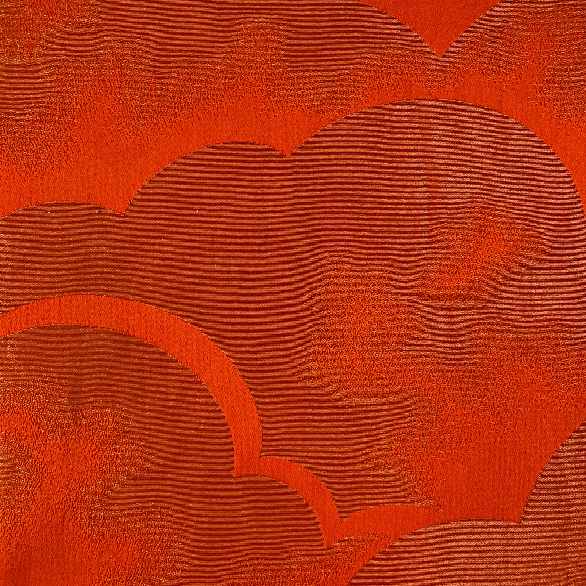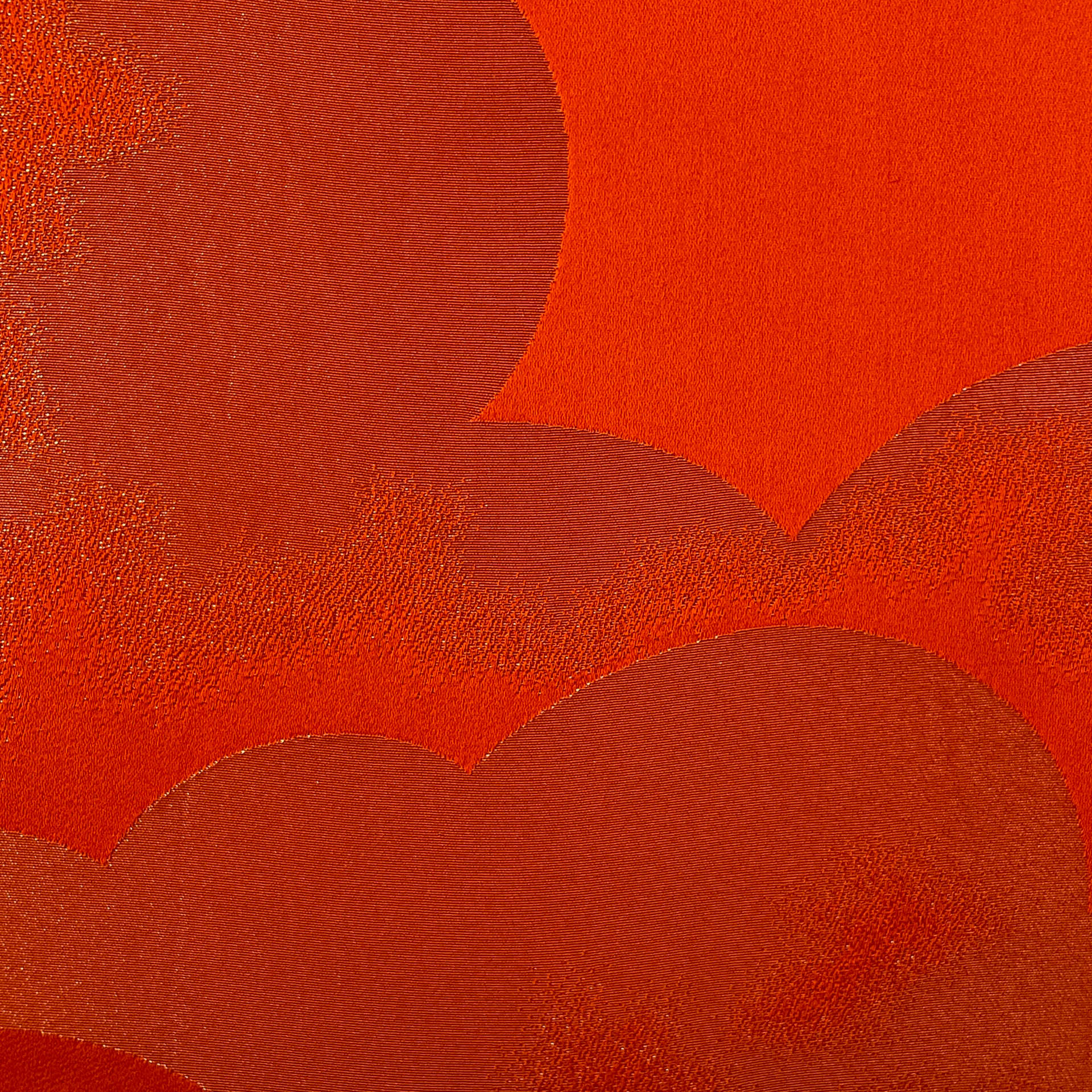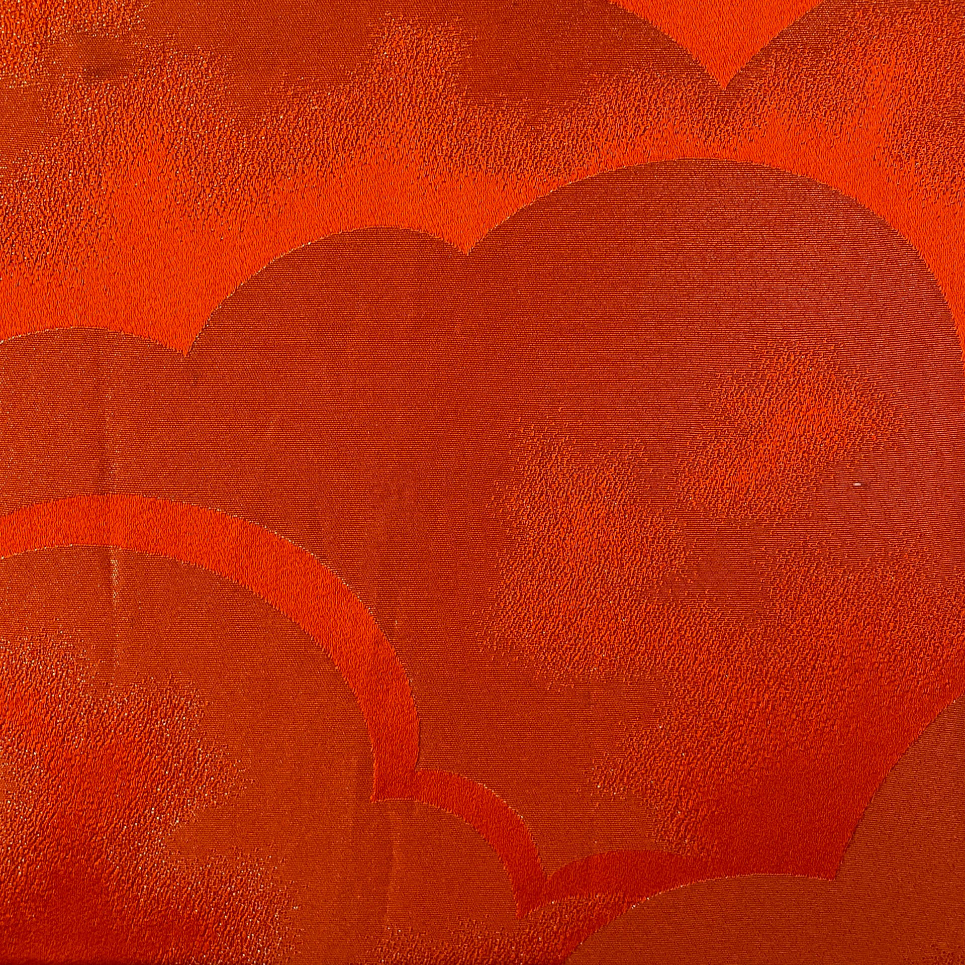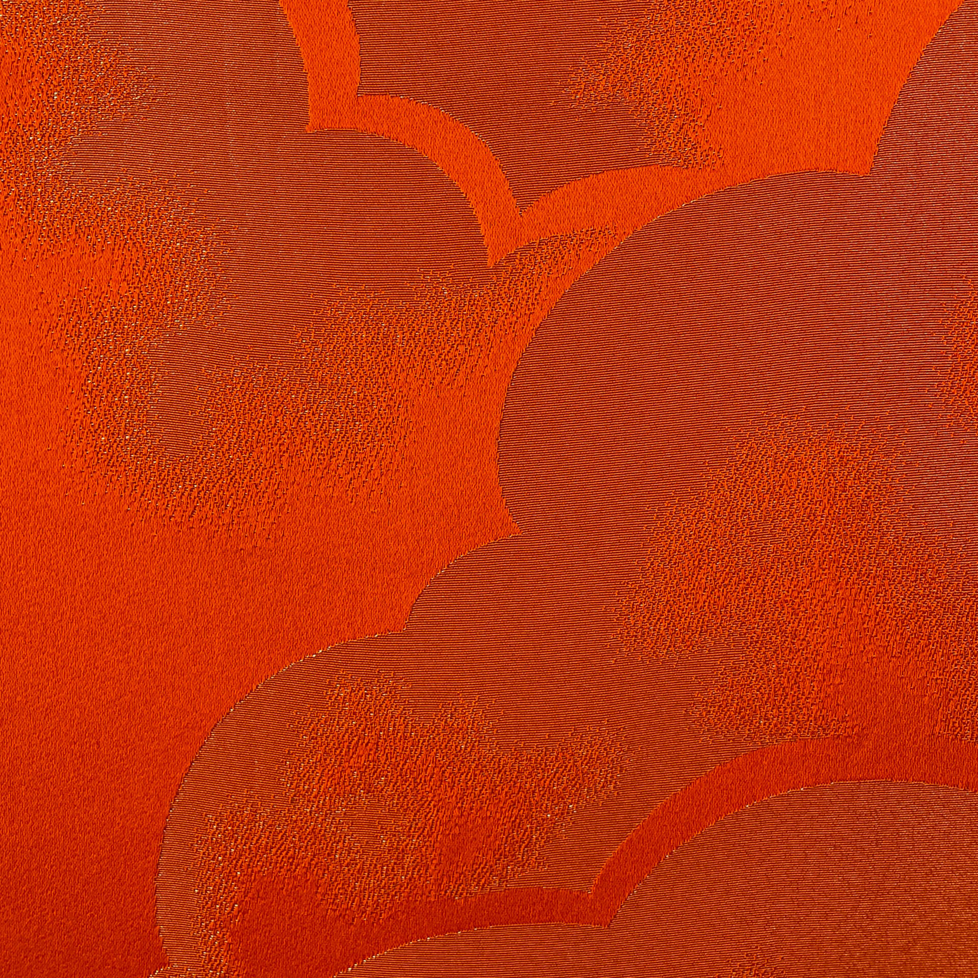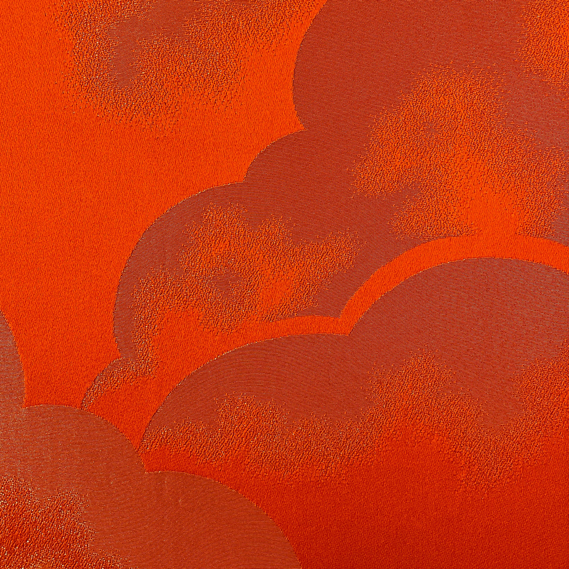 This obi has a celebratory color pattern with clouds intricately woven in gold threads against a vermilion background. Depending on how the light interacts with it, the canvas shows different shades just like the shifting clouds in the sky. It can transition from a rich shade of vermilion to a glistening gold hue set against a vibrant vermilion backdrop.