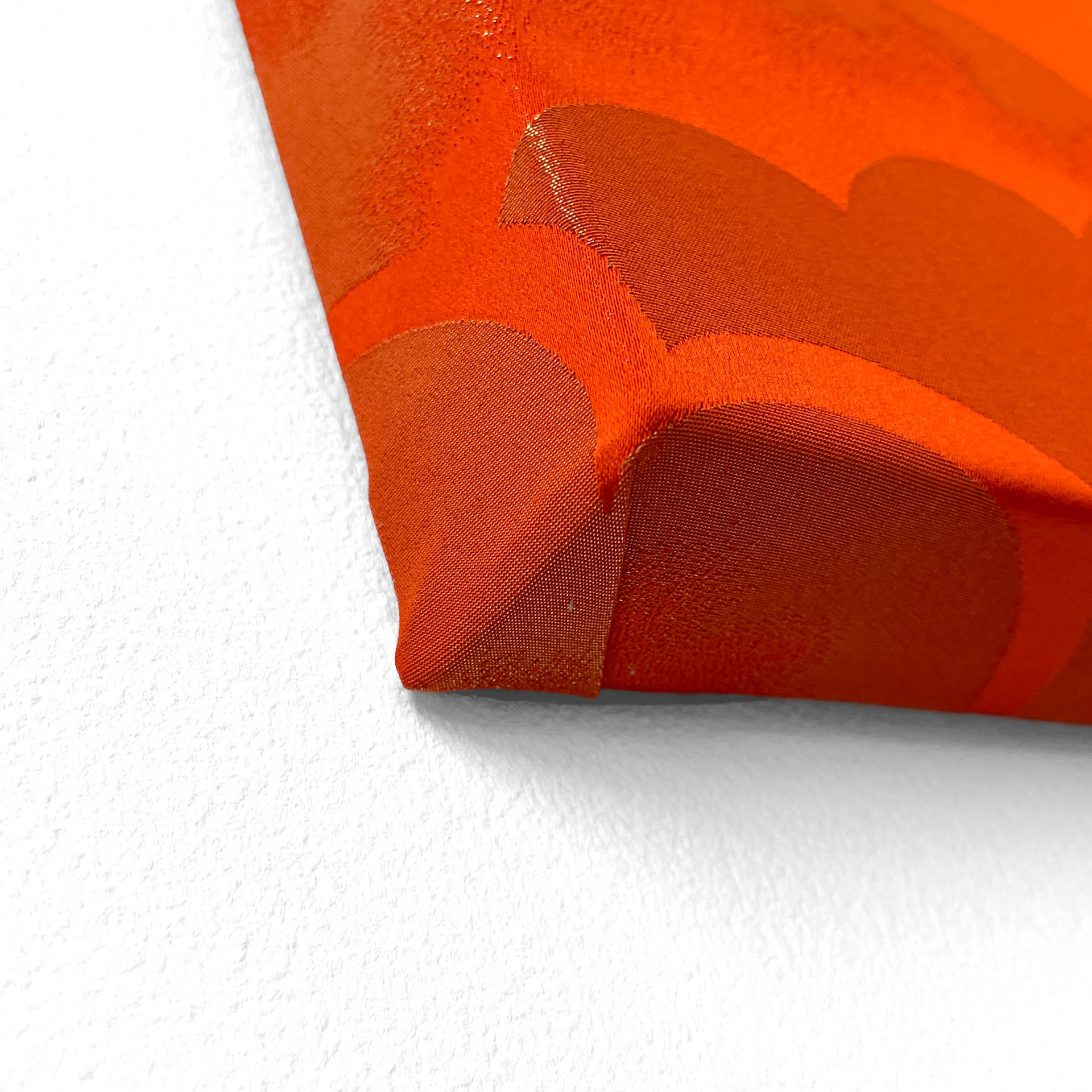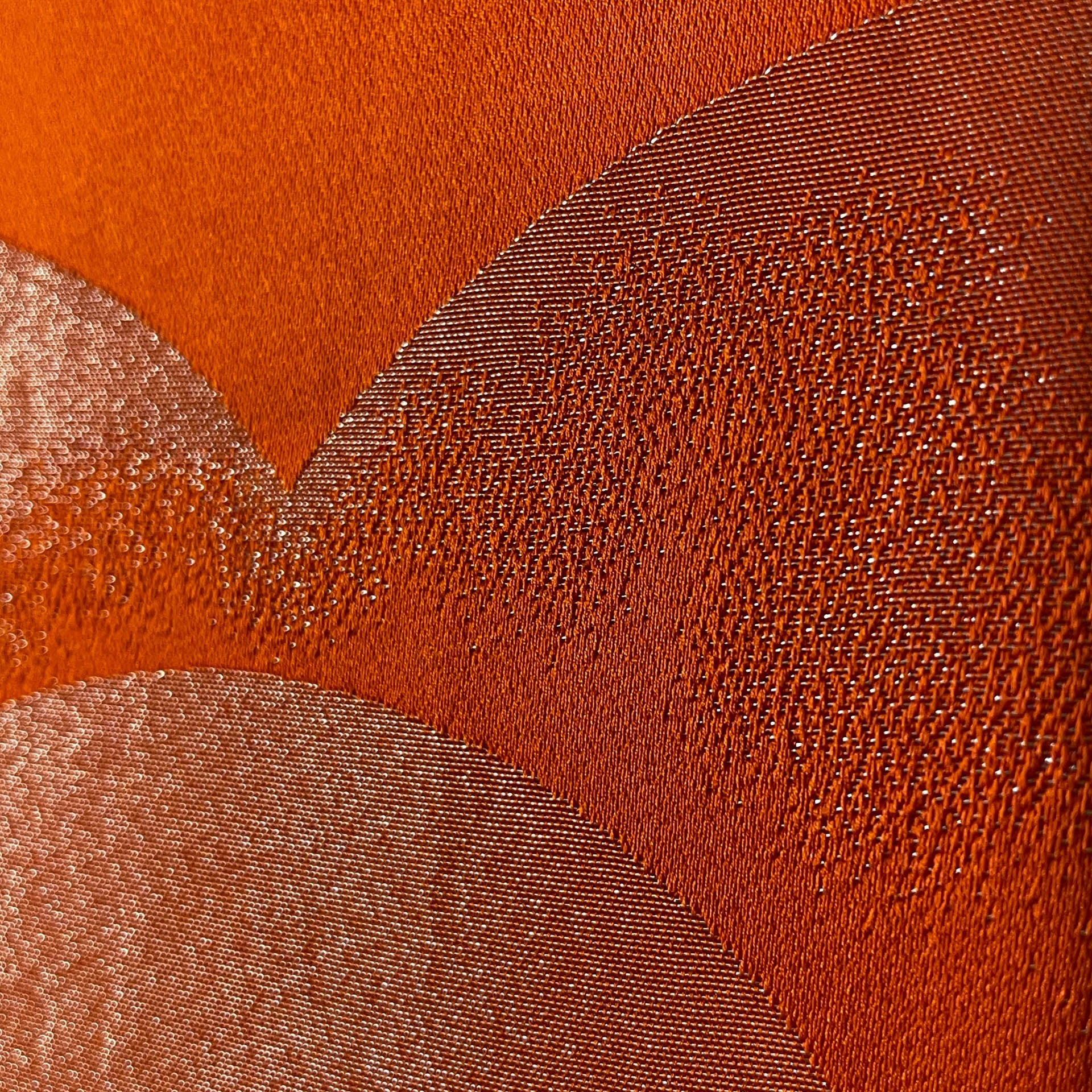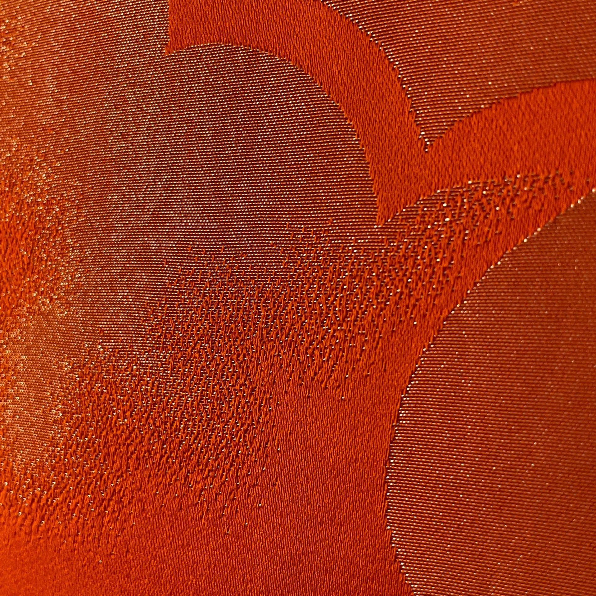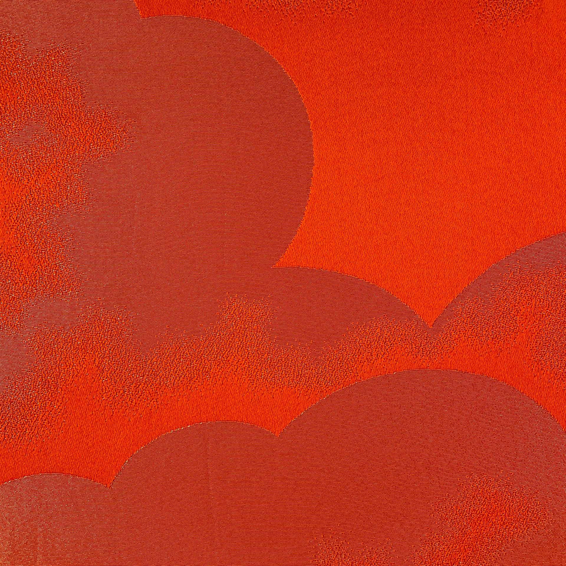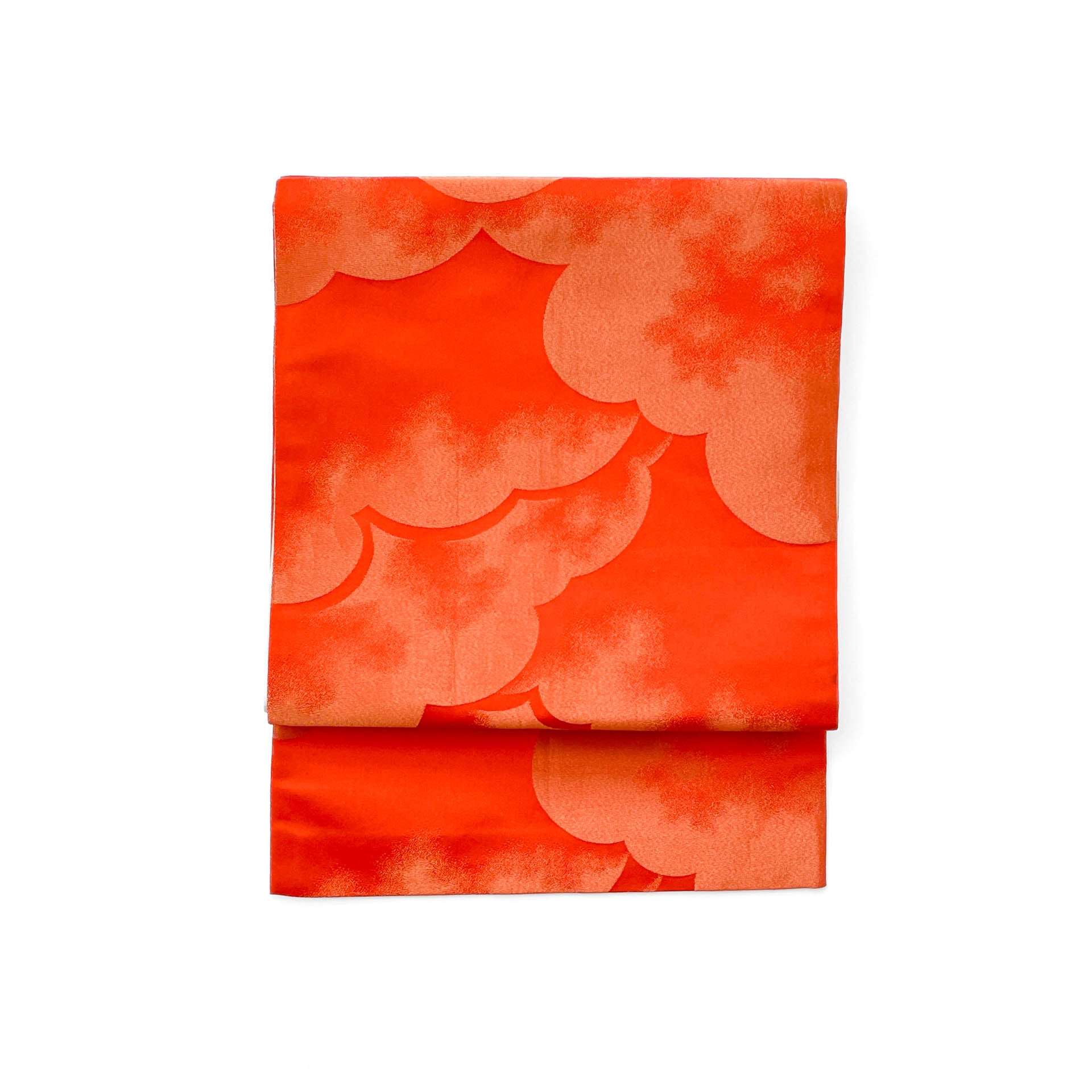 This obi has a celebratory color pattern with clouds intricately woven in gold threads against a vermilion background. Depending on how the light interacts with it, the canvas shows different shades just like the shifting clouds in the sky. It can transition from a rich shade of vermilion to a glistening gold hue set against a vibrant vermilion backdrop.