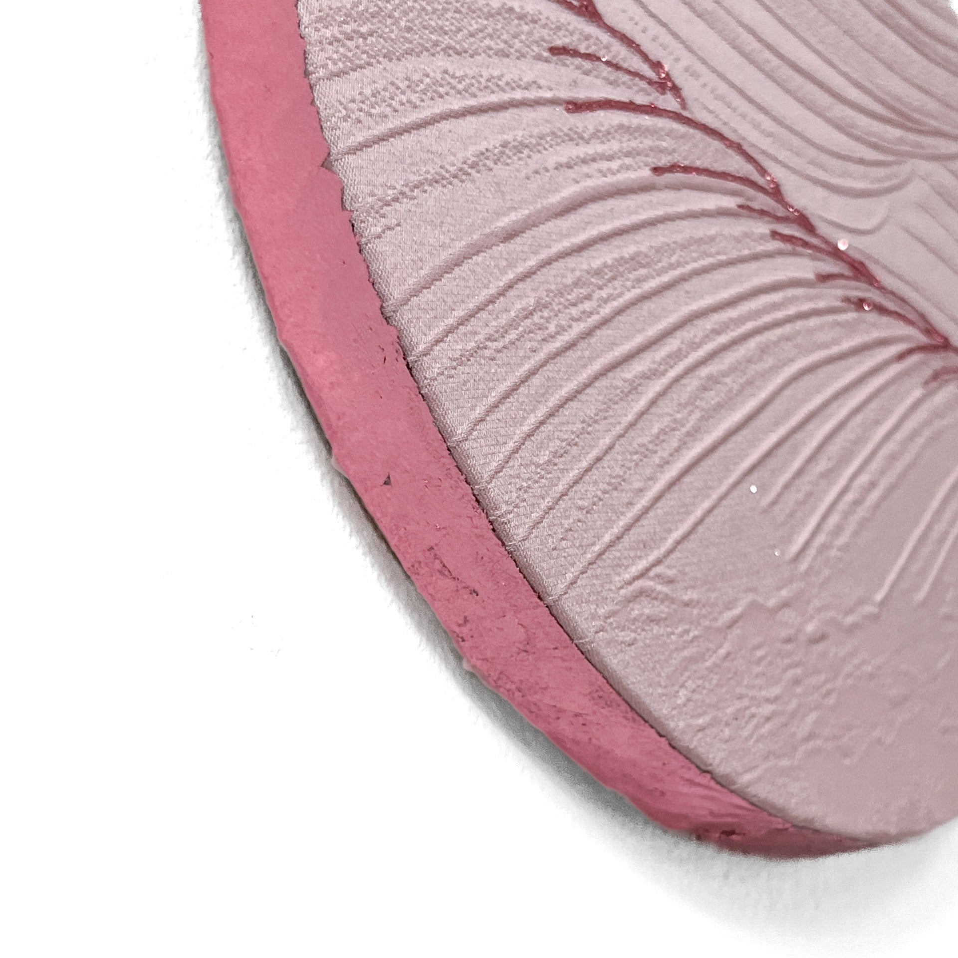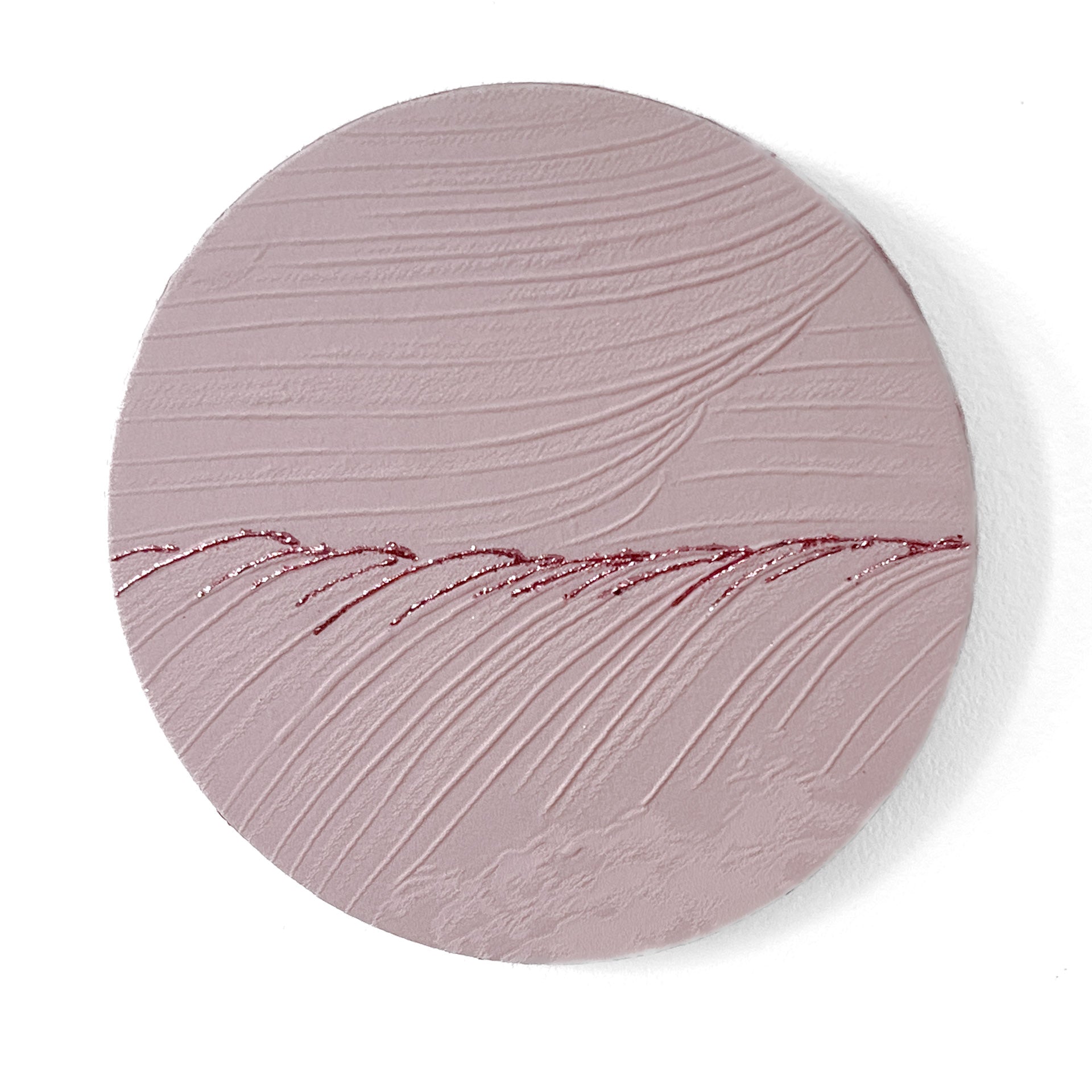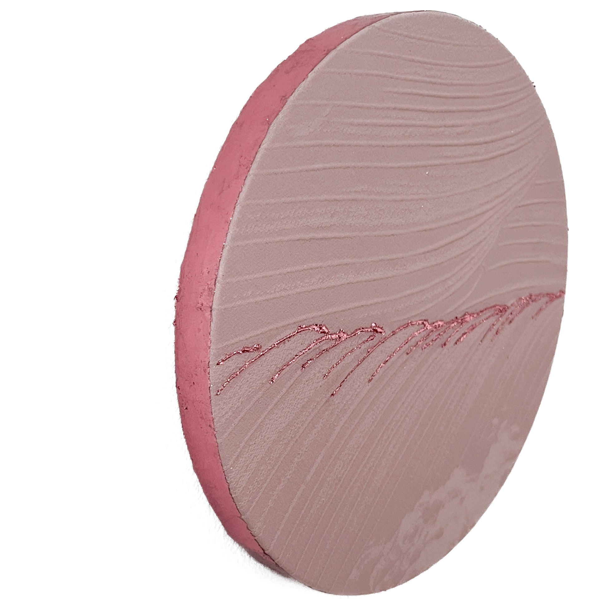 This one-of-a-kind art piece is created from a vintage Japanese kimono and reimagined as a contemporary circular canvas. The handwoven silk base features wave motifs that flow gently across the surface, enhanced by delicate embroidery and luminous pink-golden leaf accents. The subtle shimmer along the borders creates an aura-like glow, giving this work both softness and radiance. Perfect for interiors that embrace calm elegance and a sense of timeless Japanese artistry.