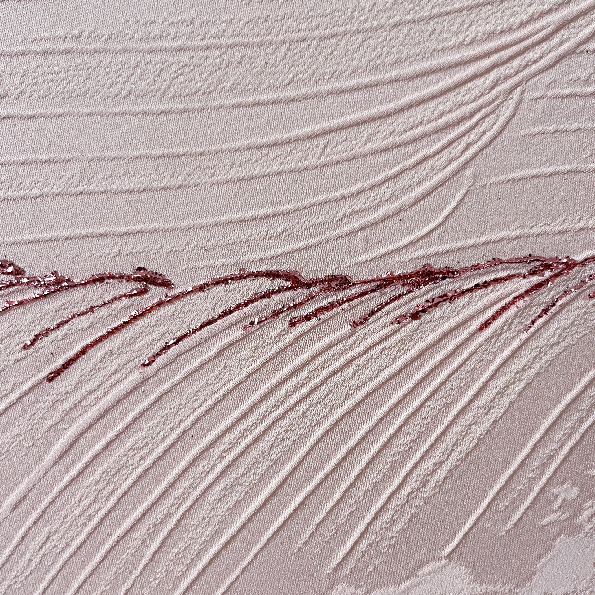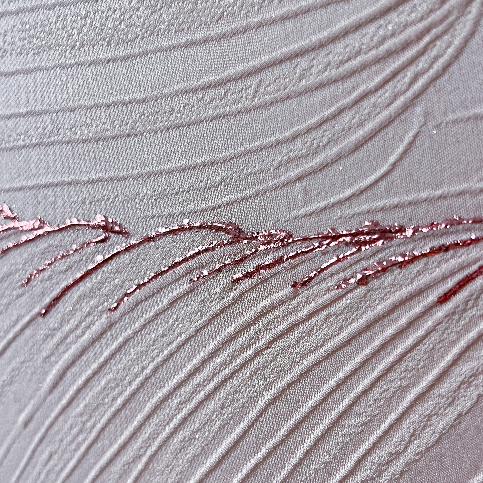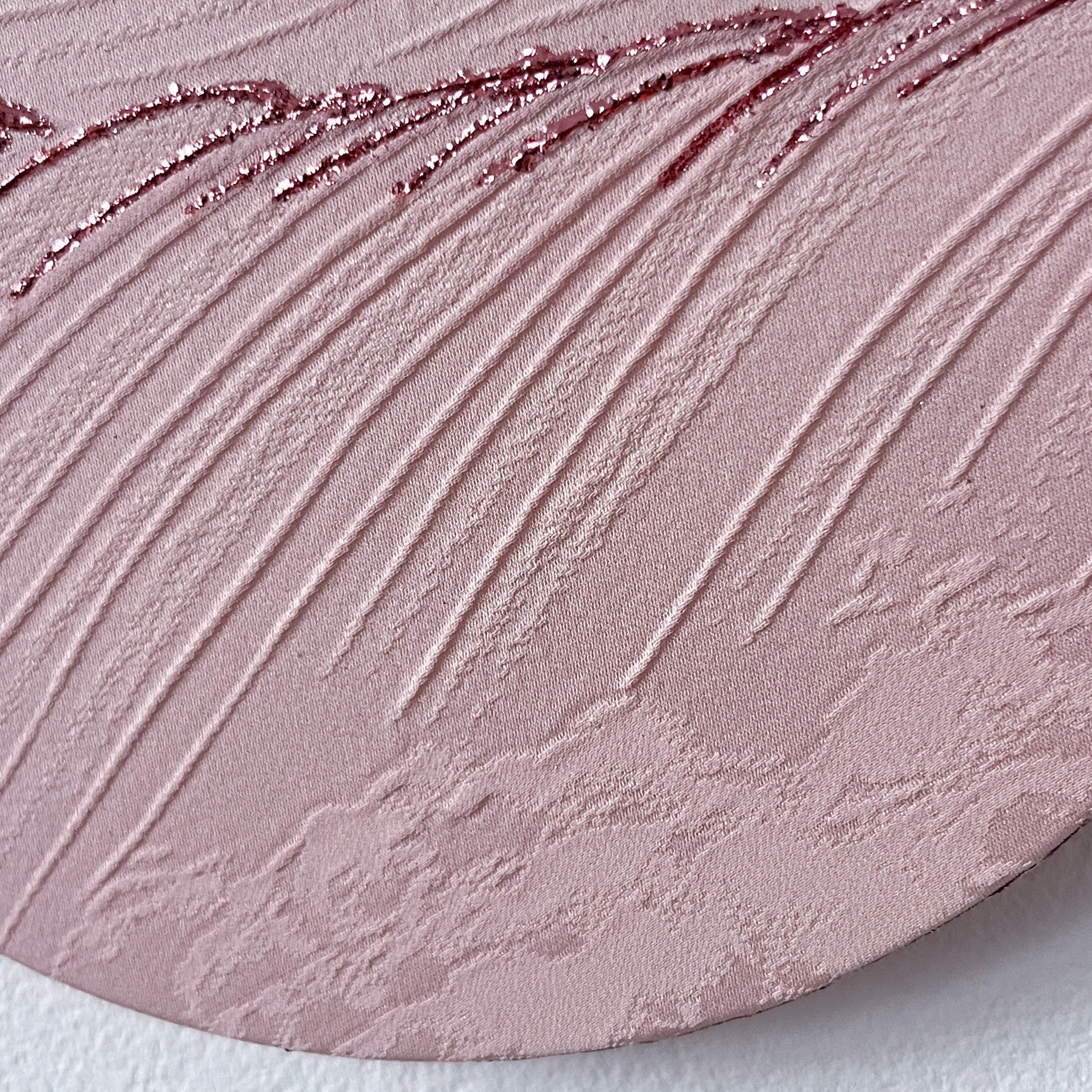 Woven from pure silk, the fabric reveals fine waves and embroidered highlights that shift beautifully with the light. The added pink-golden leaf on the borders enhances its depth, making the peice glow with a quiet brilliance. Mounted on a circular wooden frame, the canvas requires no additional framing and arrives ready to hang - an elegant blend of Japanese heritage and modern minimalism.