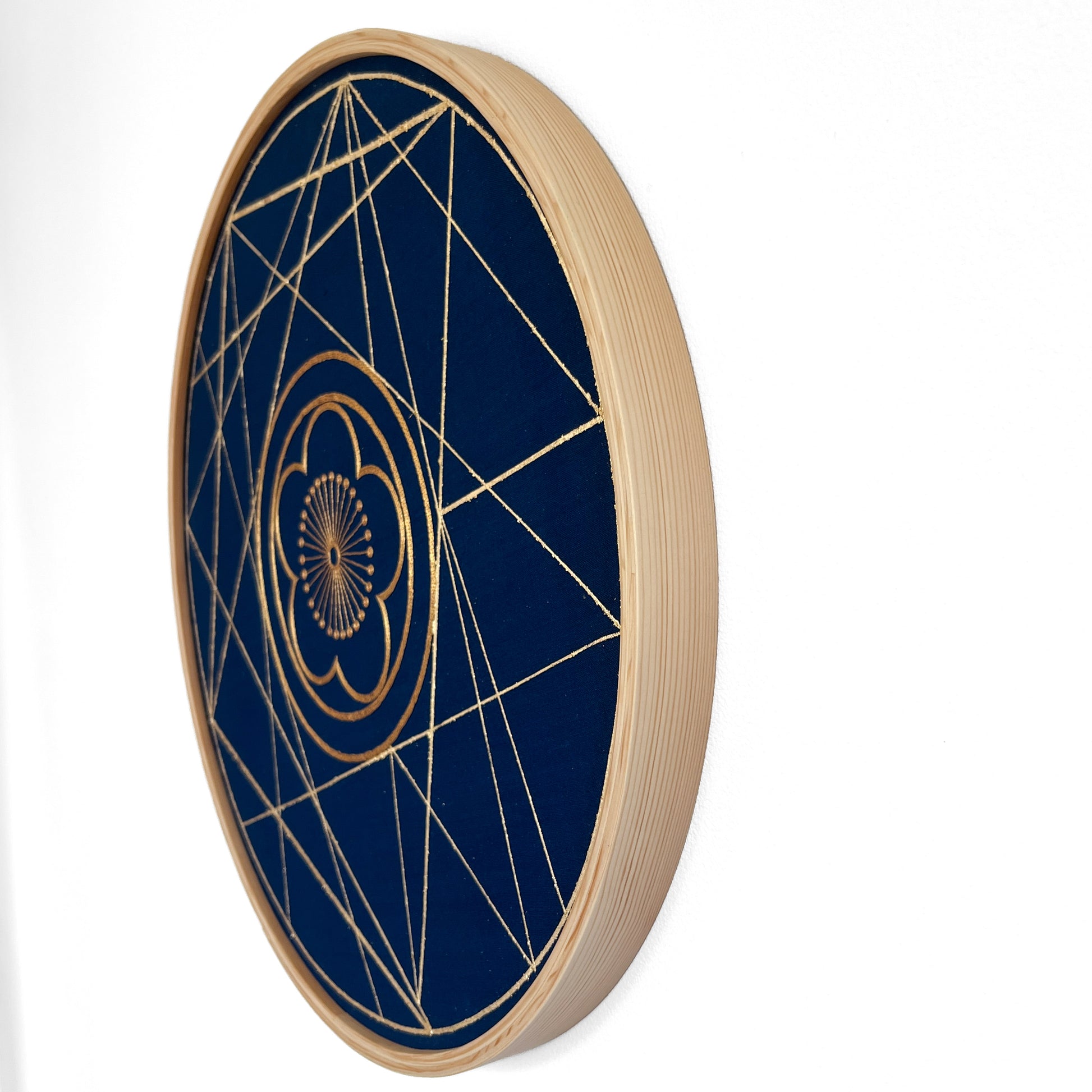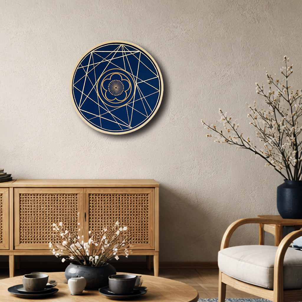 The calm yet striking contrast of indigo and gold makes it especially suitable for modern interiors, hospitality spaces, cultural environments, meditation rooms, or refined residential settings where subtle symbolism and craftsmanship are appreciated.