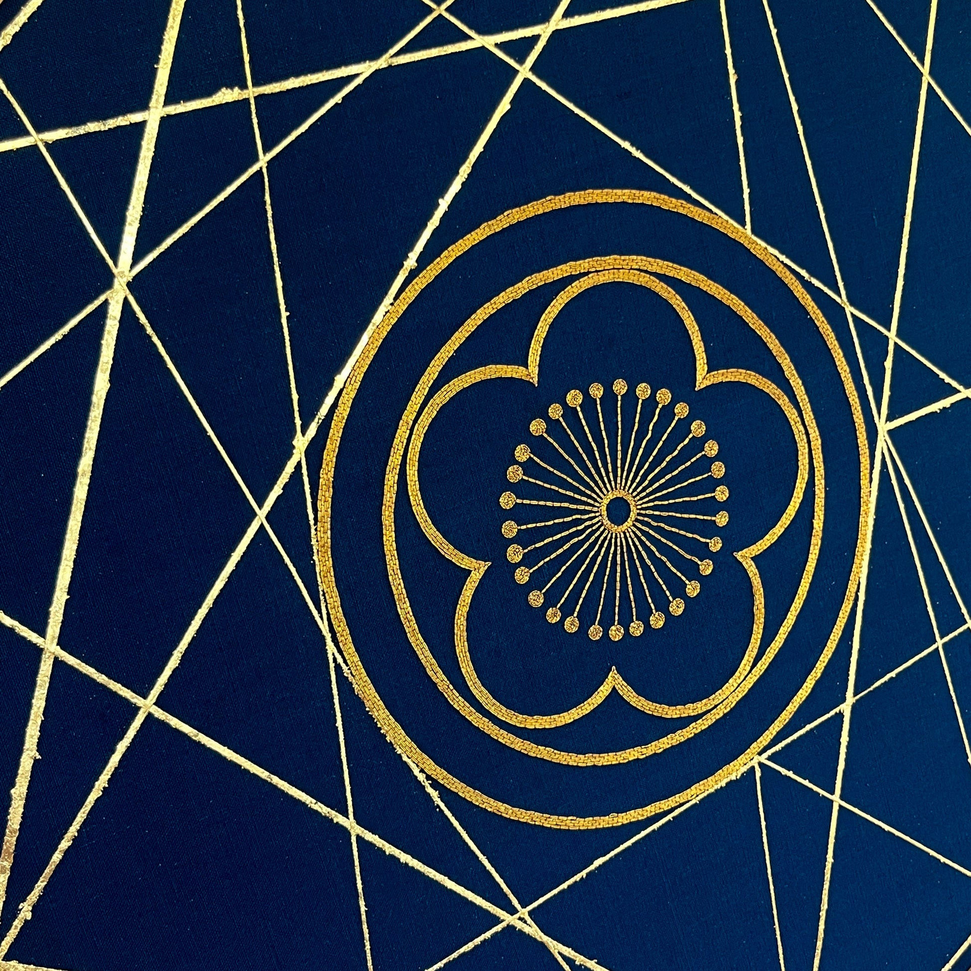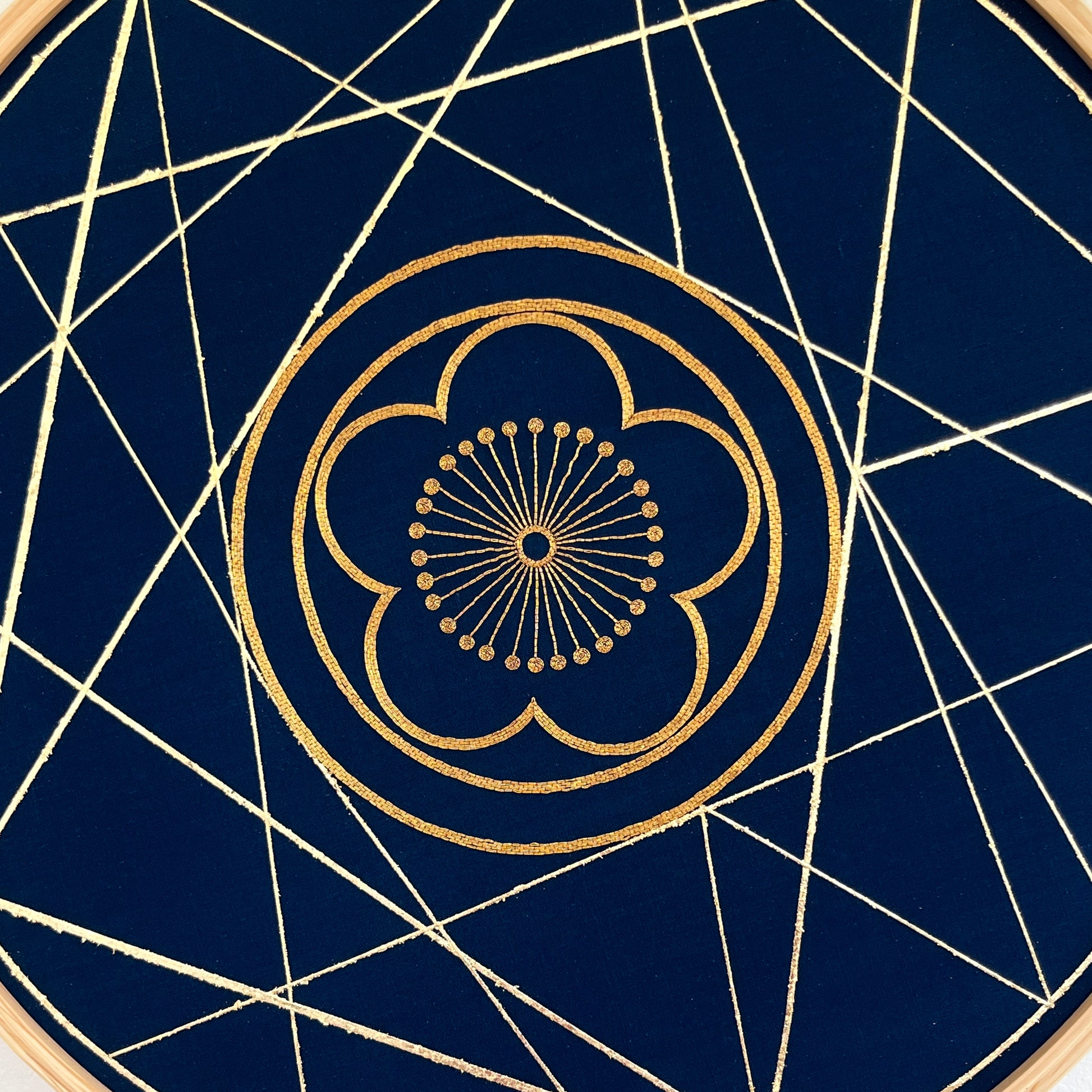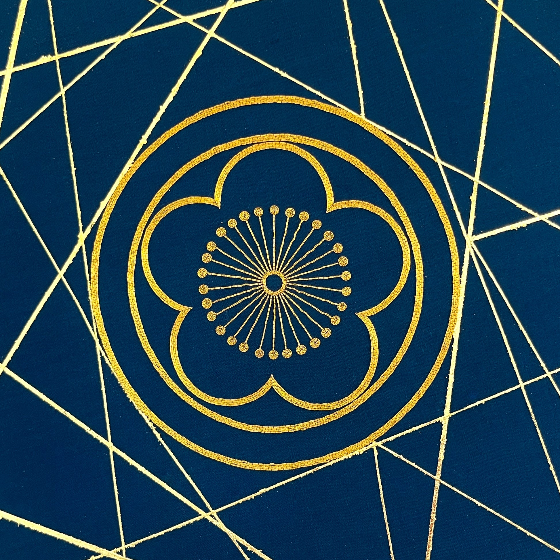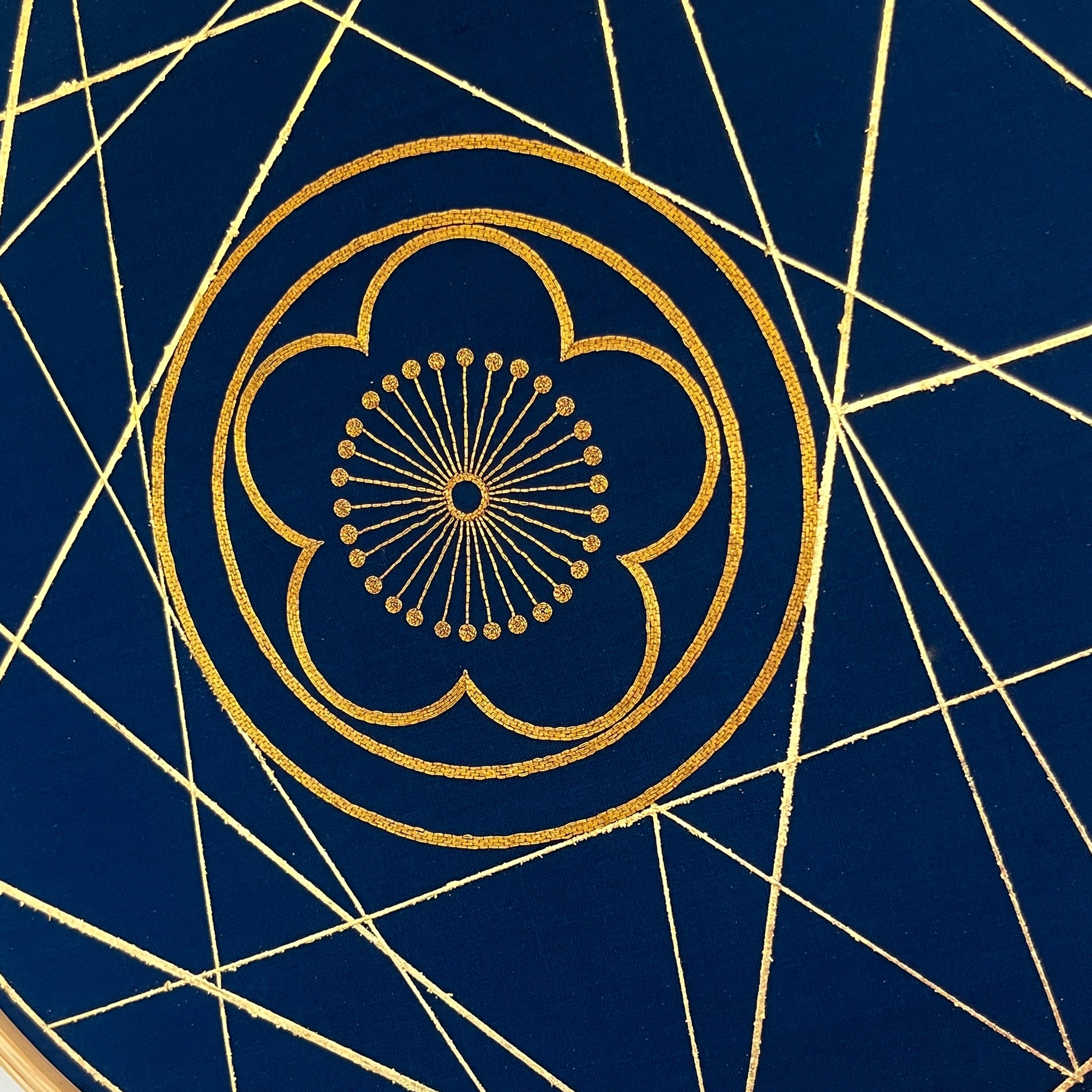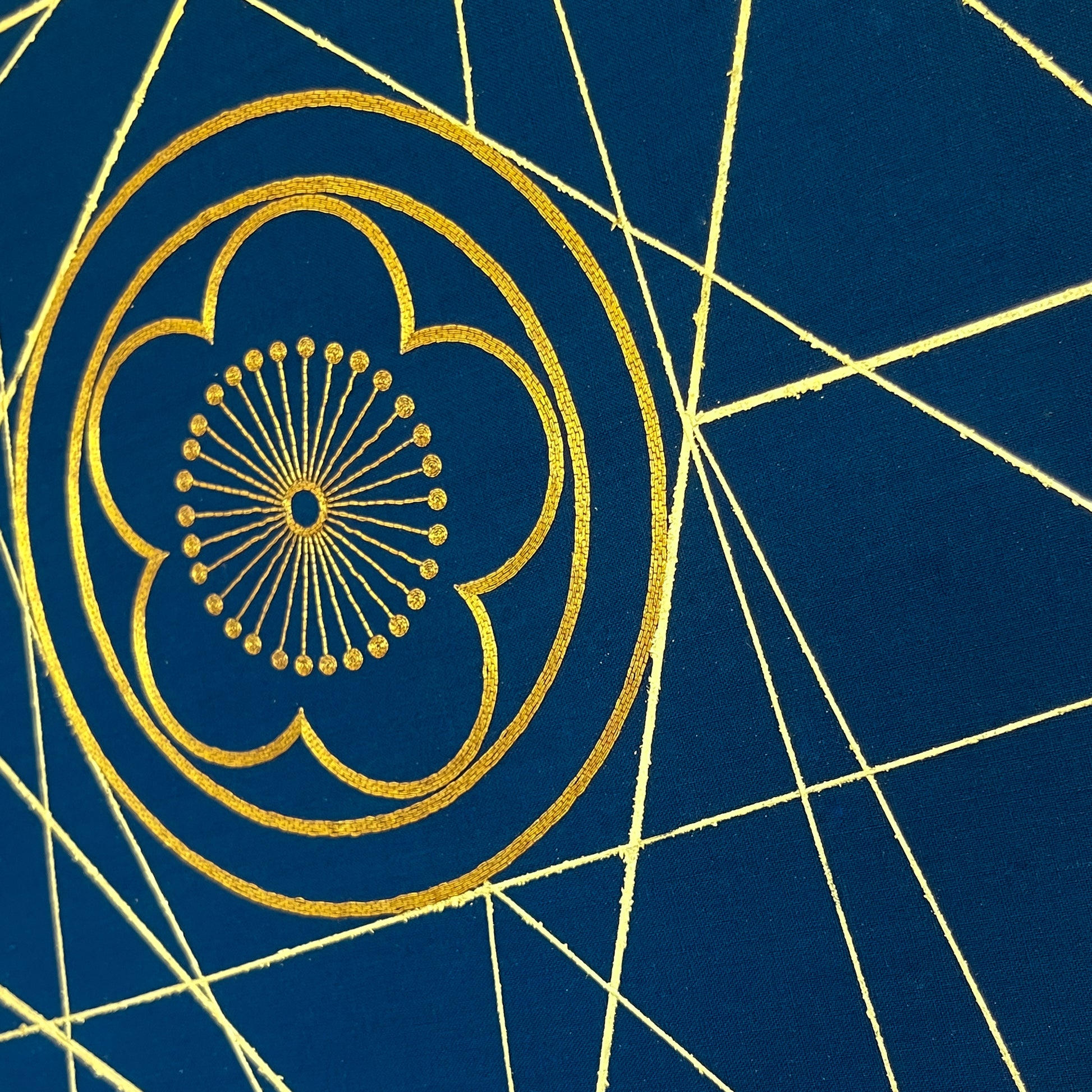 At the heart of the composition lies a kinkoma-embroidered plum blossom taken from an antique furoshiki textile. The delicate gold couching embroidery radiates outward like a small universe, creating a calm yet powerful focal point. Surrounding the flower, geometric golden lines form an abstract constellation - a contemporary interpretation of traditional Japanese geometry and the interconnectedness of nature.