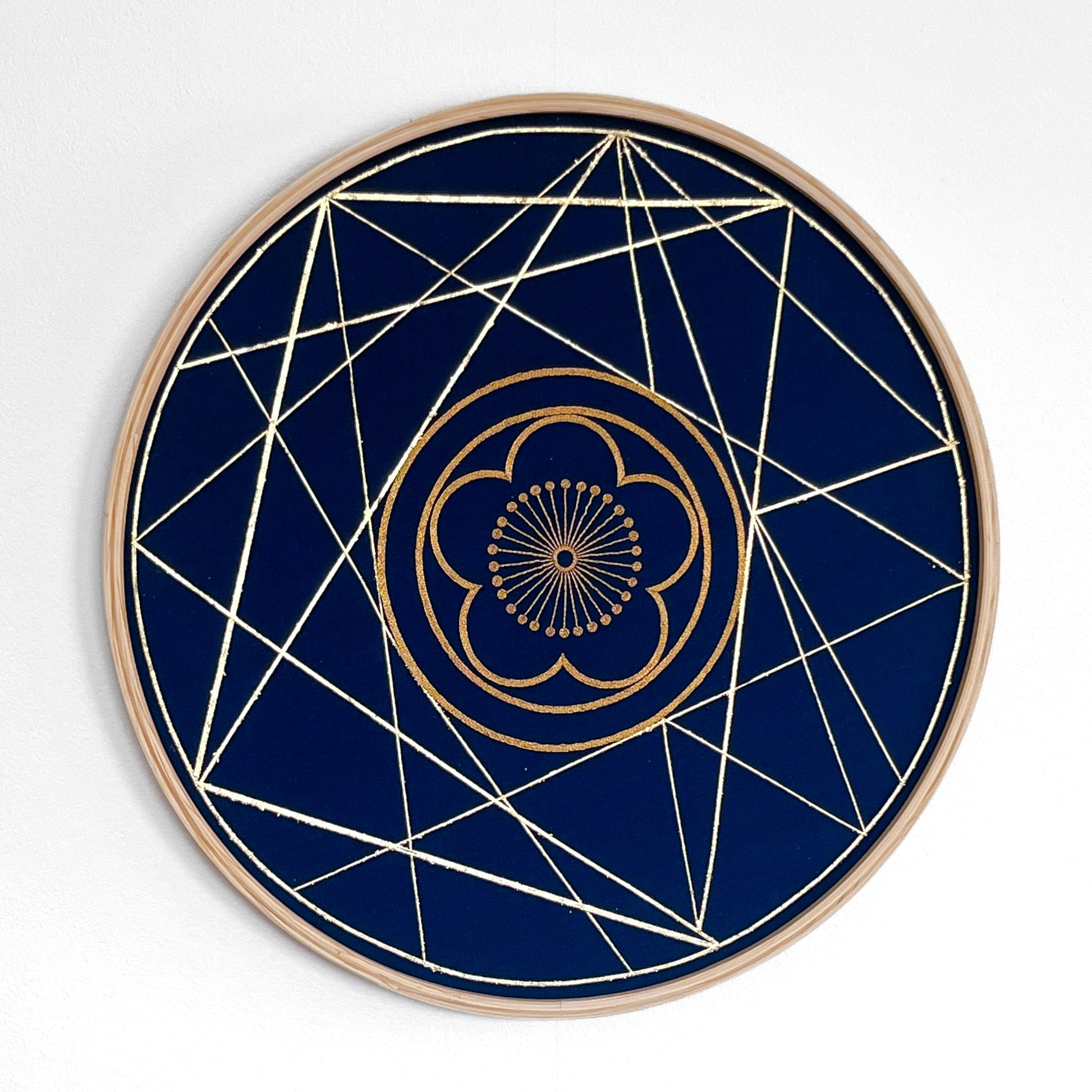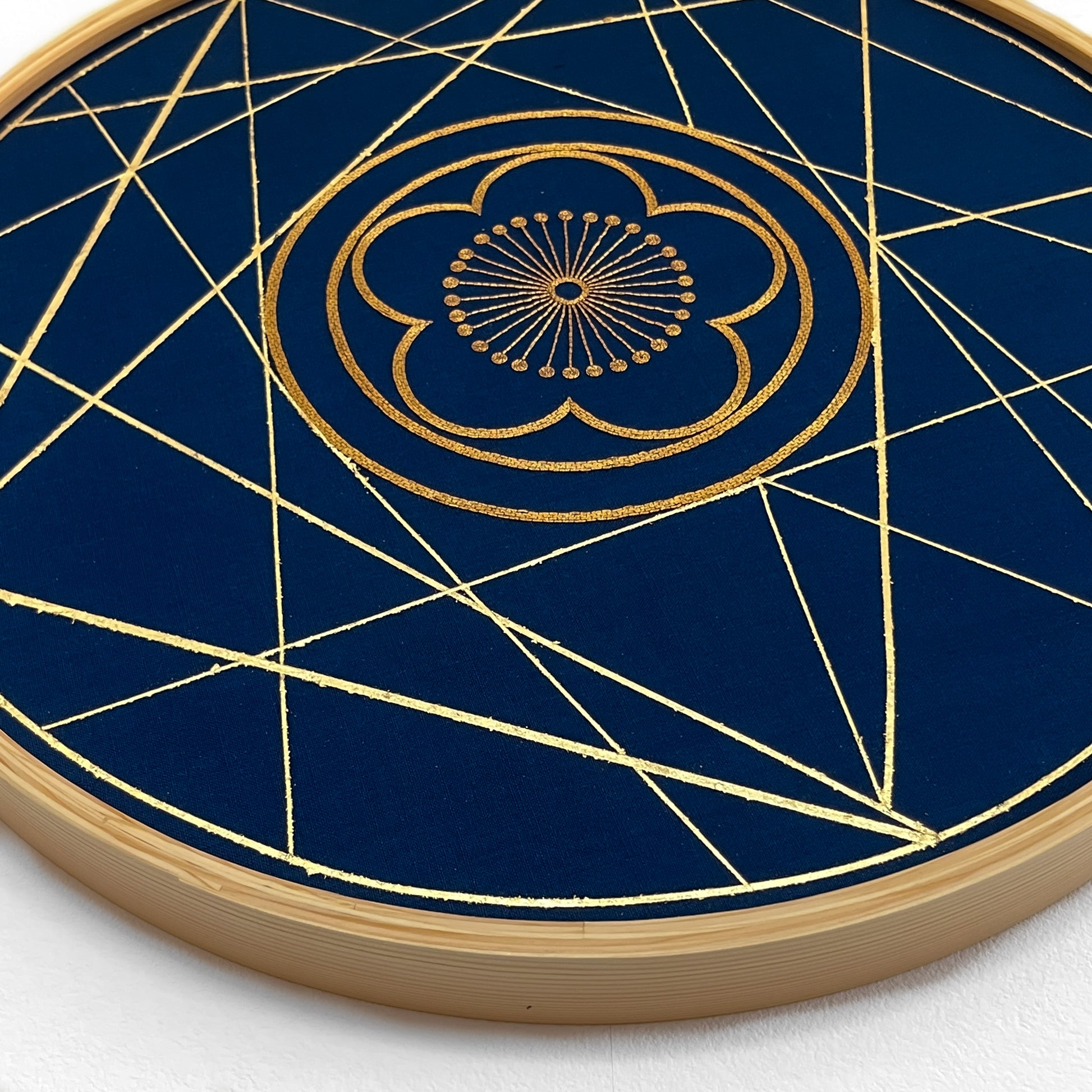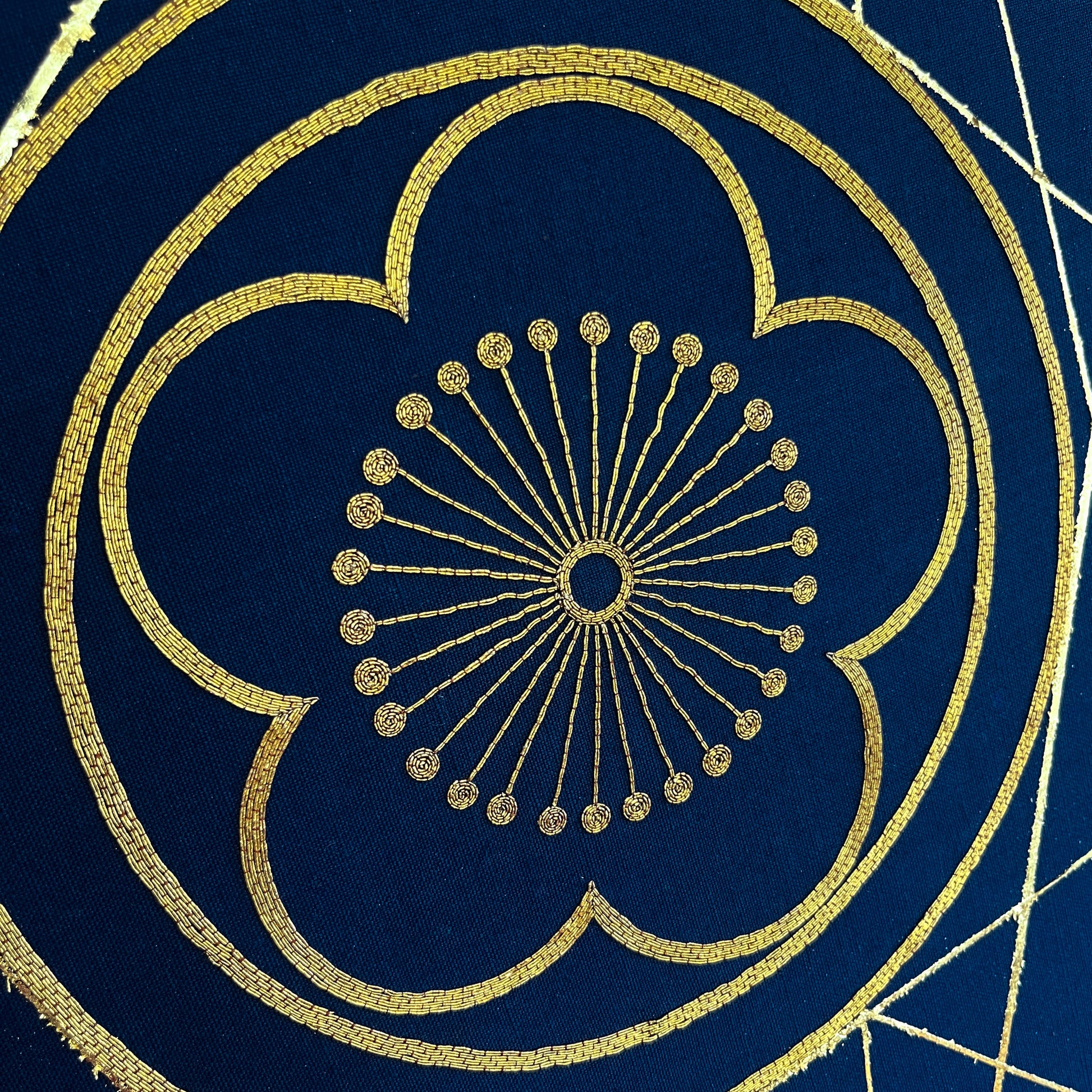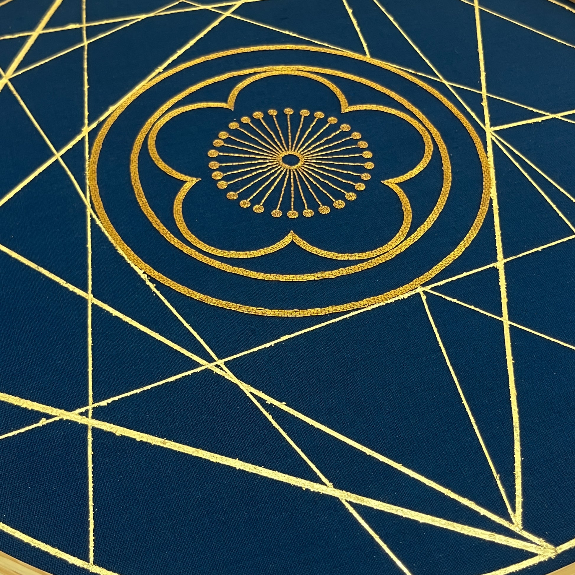 At the heart of the composition lies a kinkoma-embroidered plum blossom taken from an antique furoshiki textile. The delicate gold couching embroidery radiates outward like a small universe, creating a calm yet powerful focal point. Surrounding the flower, geometric golden lines form an abstract constellation - a contemporary interpretation of traditional Japanese geometry and the interconnectedness of nature.