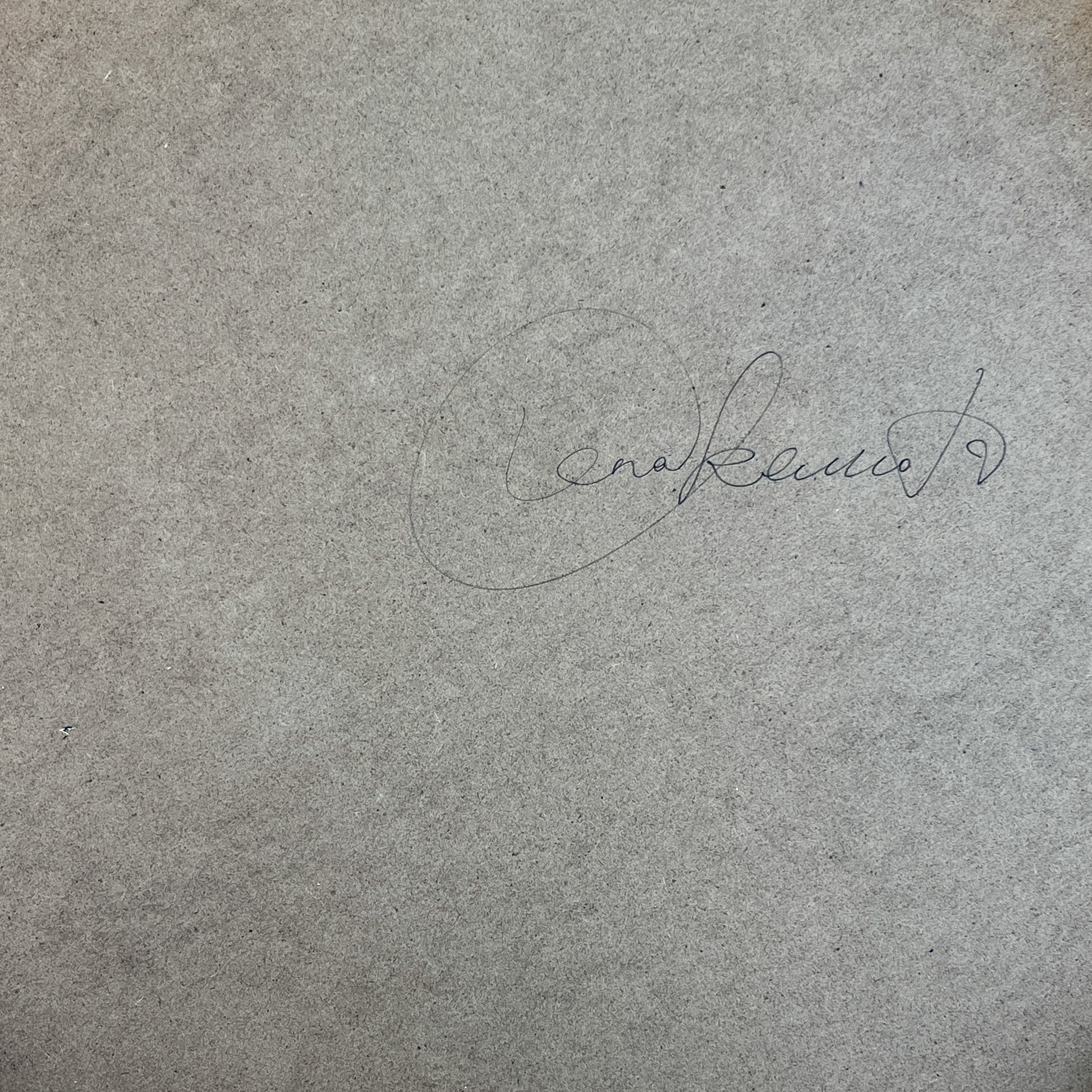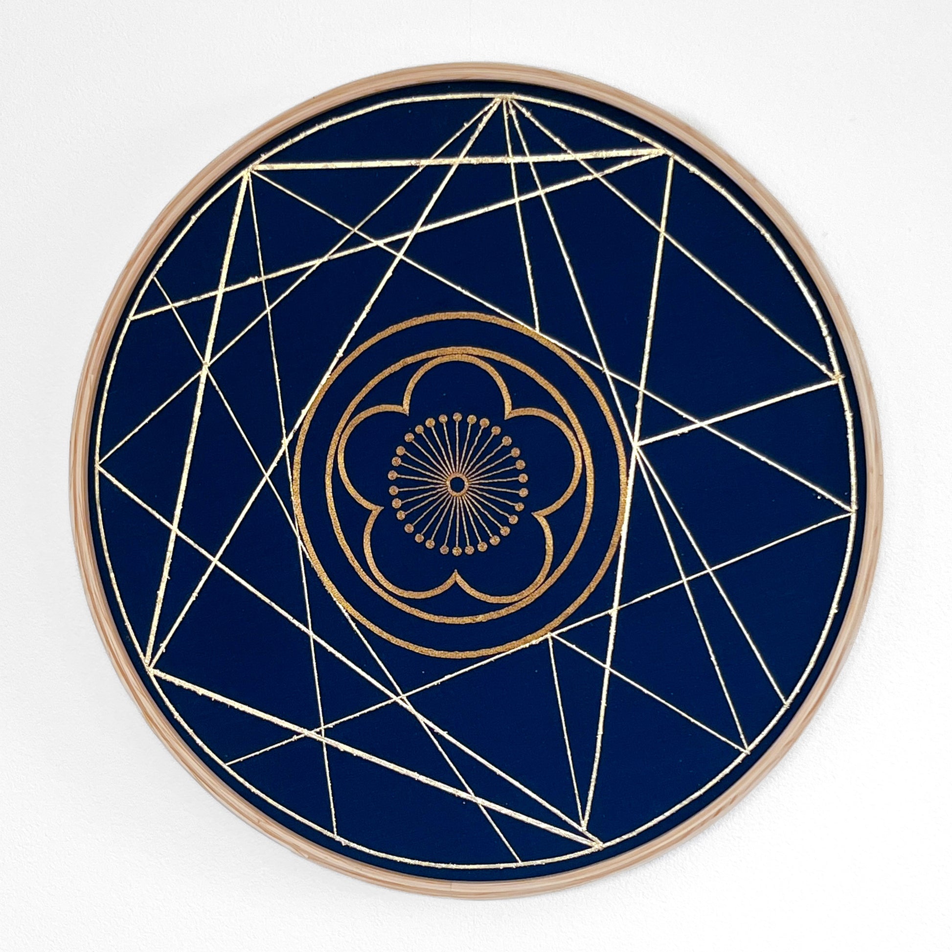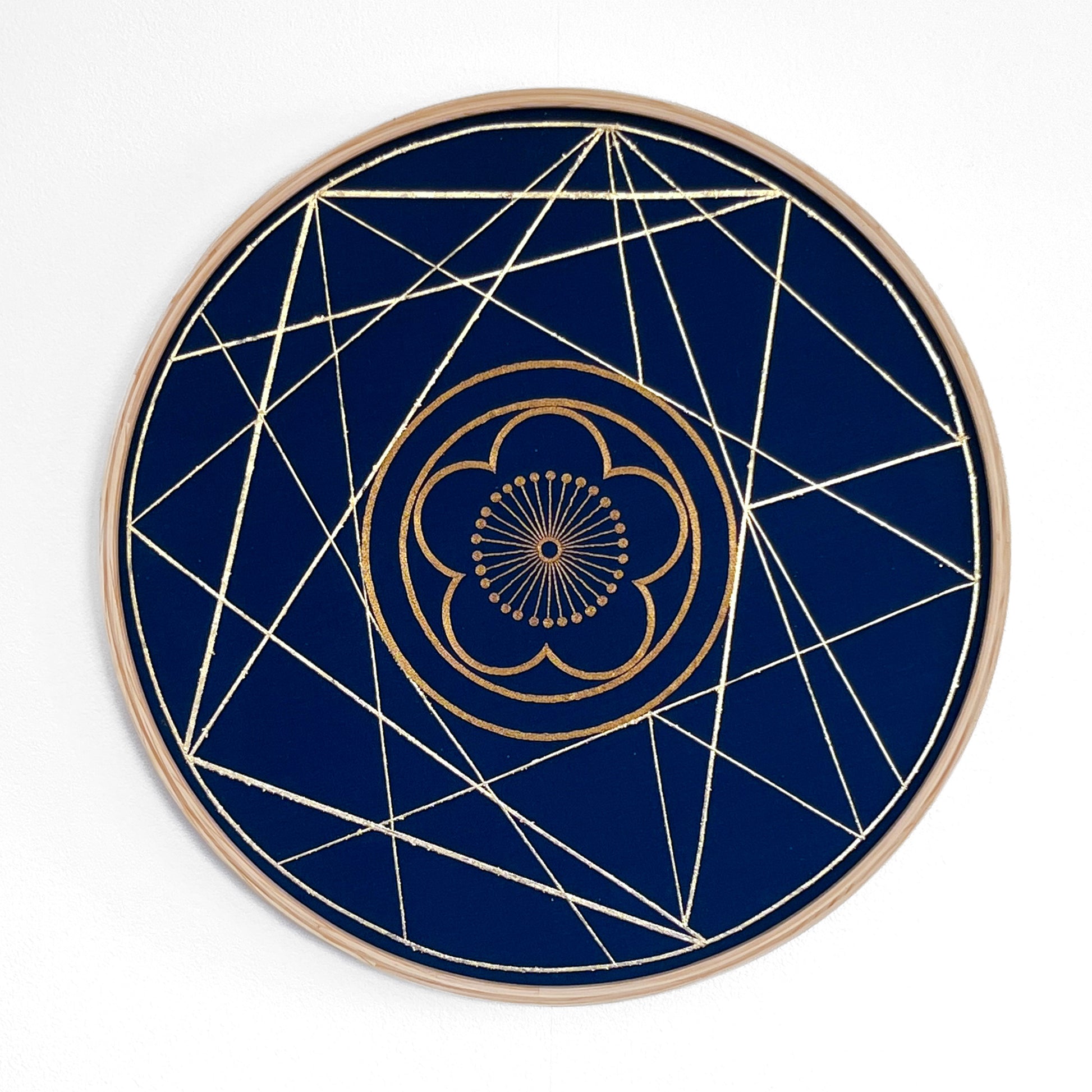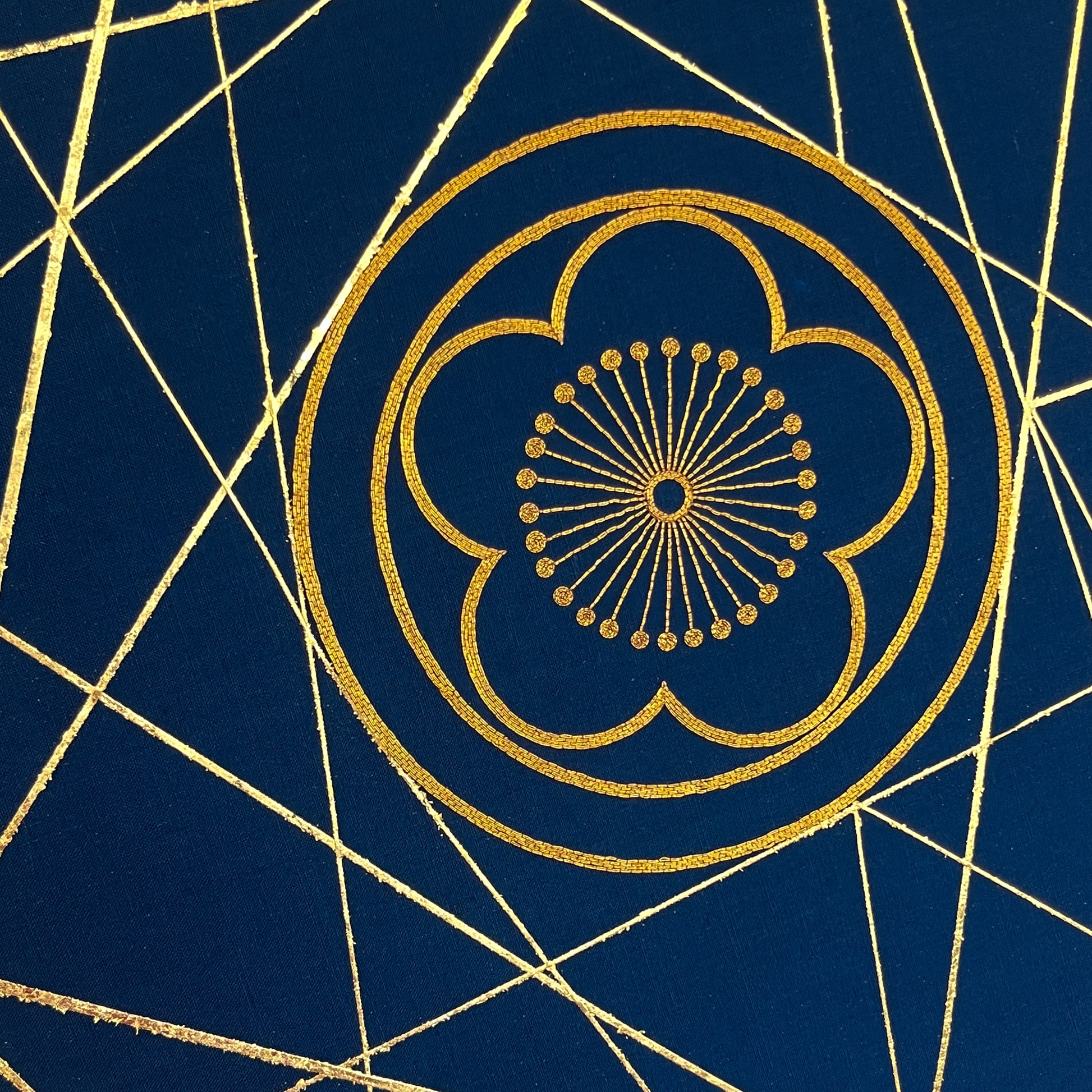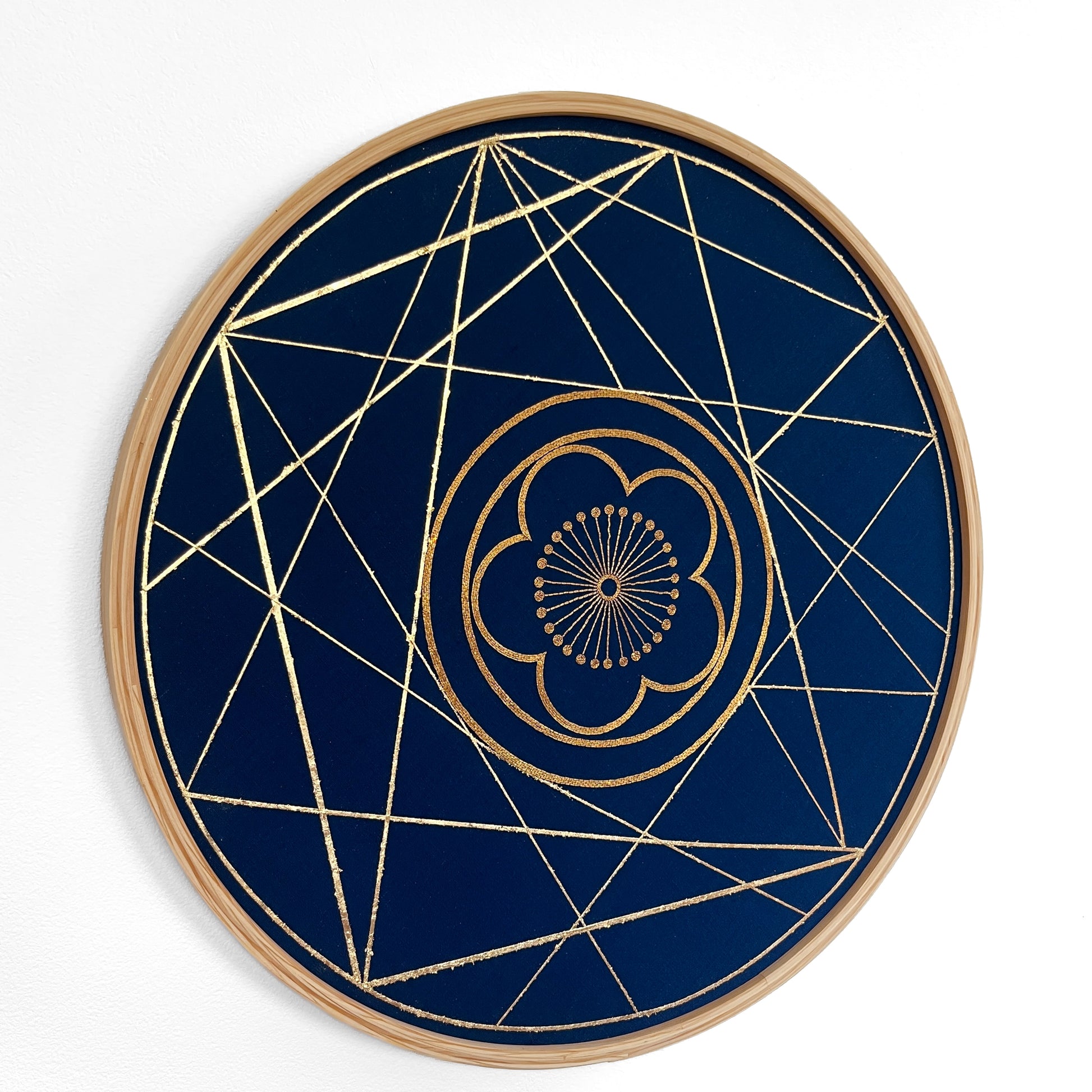 At the heart of the composition lies a kinkoma-embroidered plum blossom taken from an antique furoshiki textile. The delicate gold couching embroidery radiates outward like a small universe, creating a calm yet powerful focal point. Surrounding the flower, geometric golden lines form an abstract constellation - a contemporary interpretation of traditional Japanese geometry and the interconnectedness of nature.