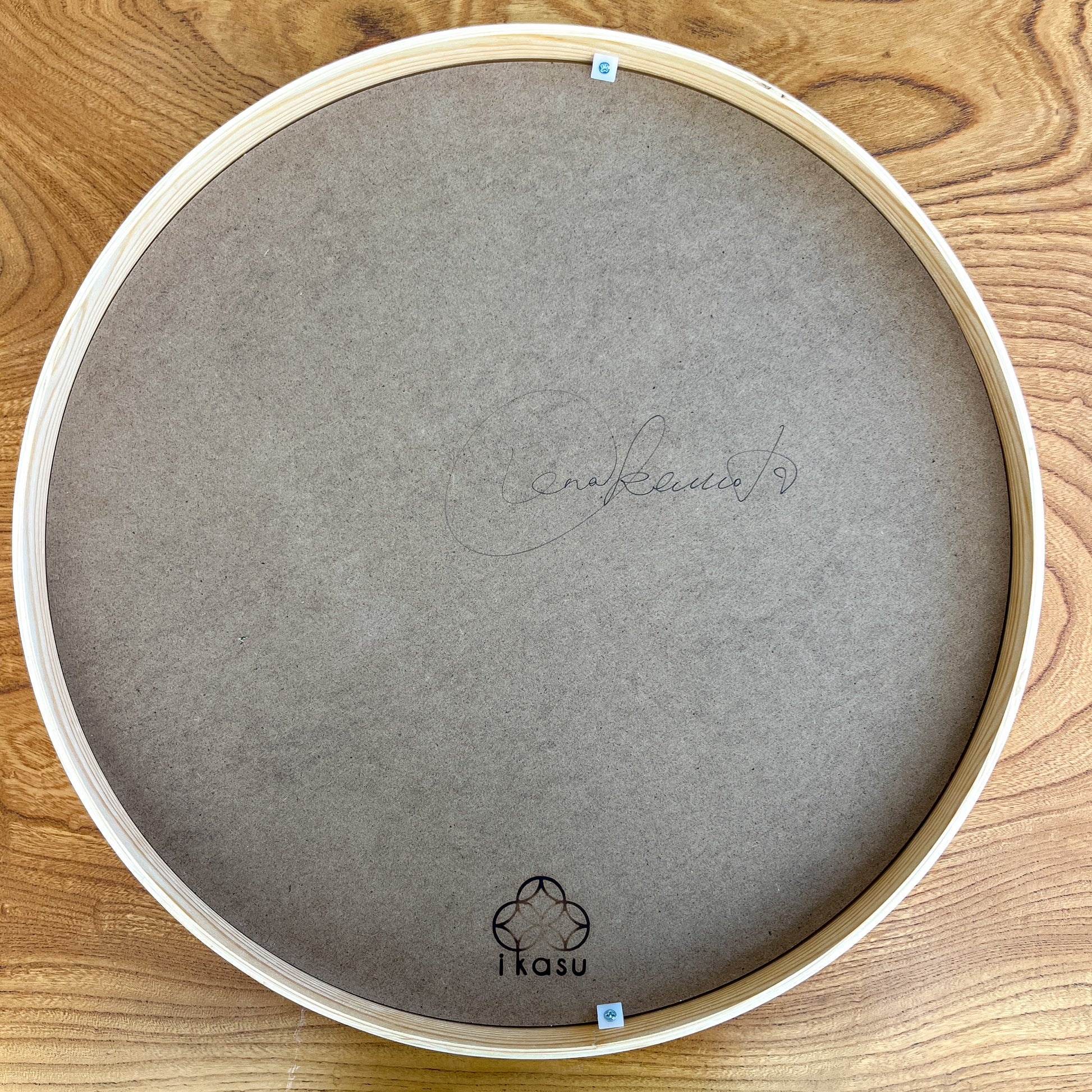 The artwork is set within a circular wooden frame, a form symbolizing completeness, unity, and the cyclical nature of life. The round shape echoes the natural rhythm of seasons, particularly the annual return of the plum blossom each winter.