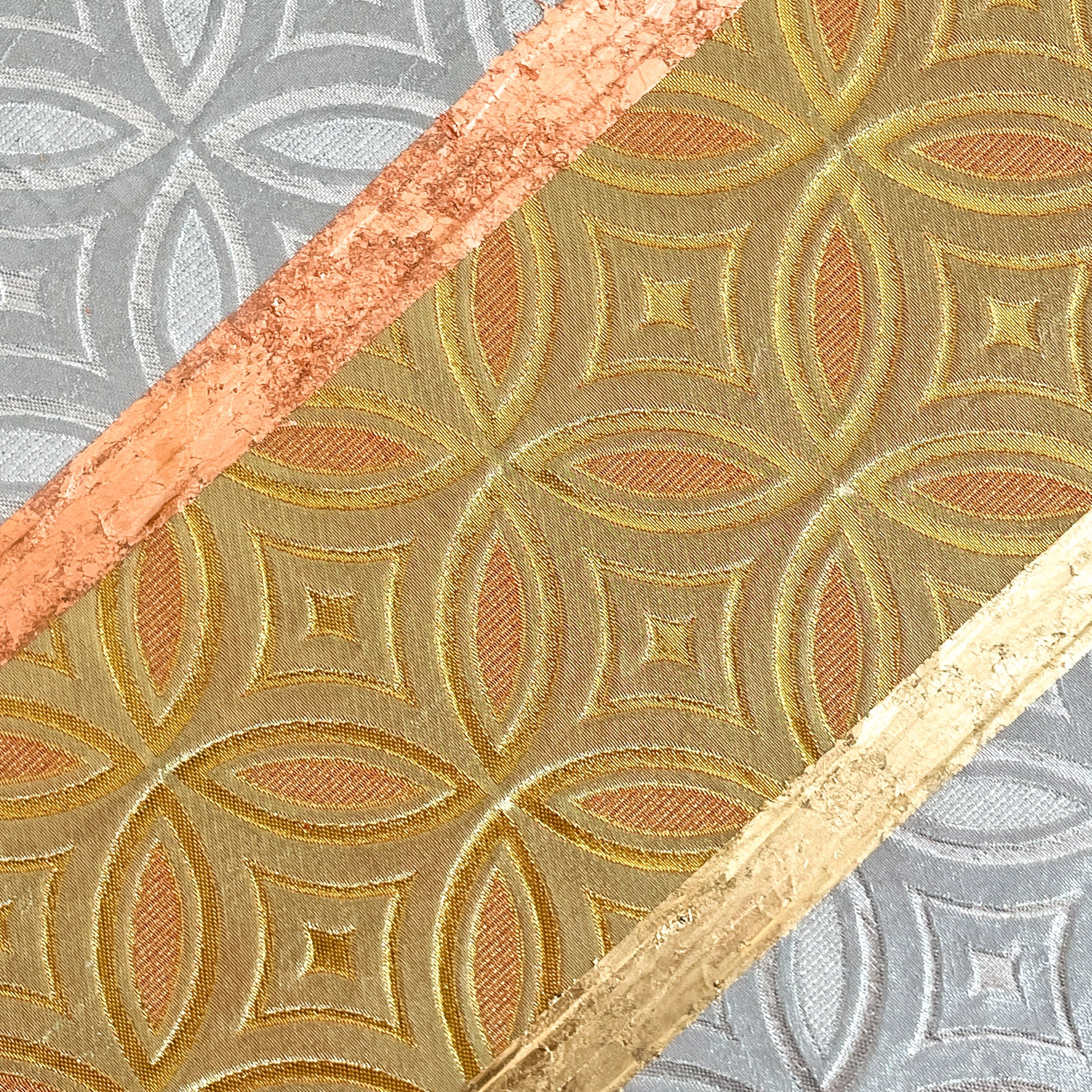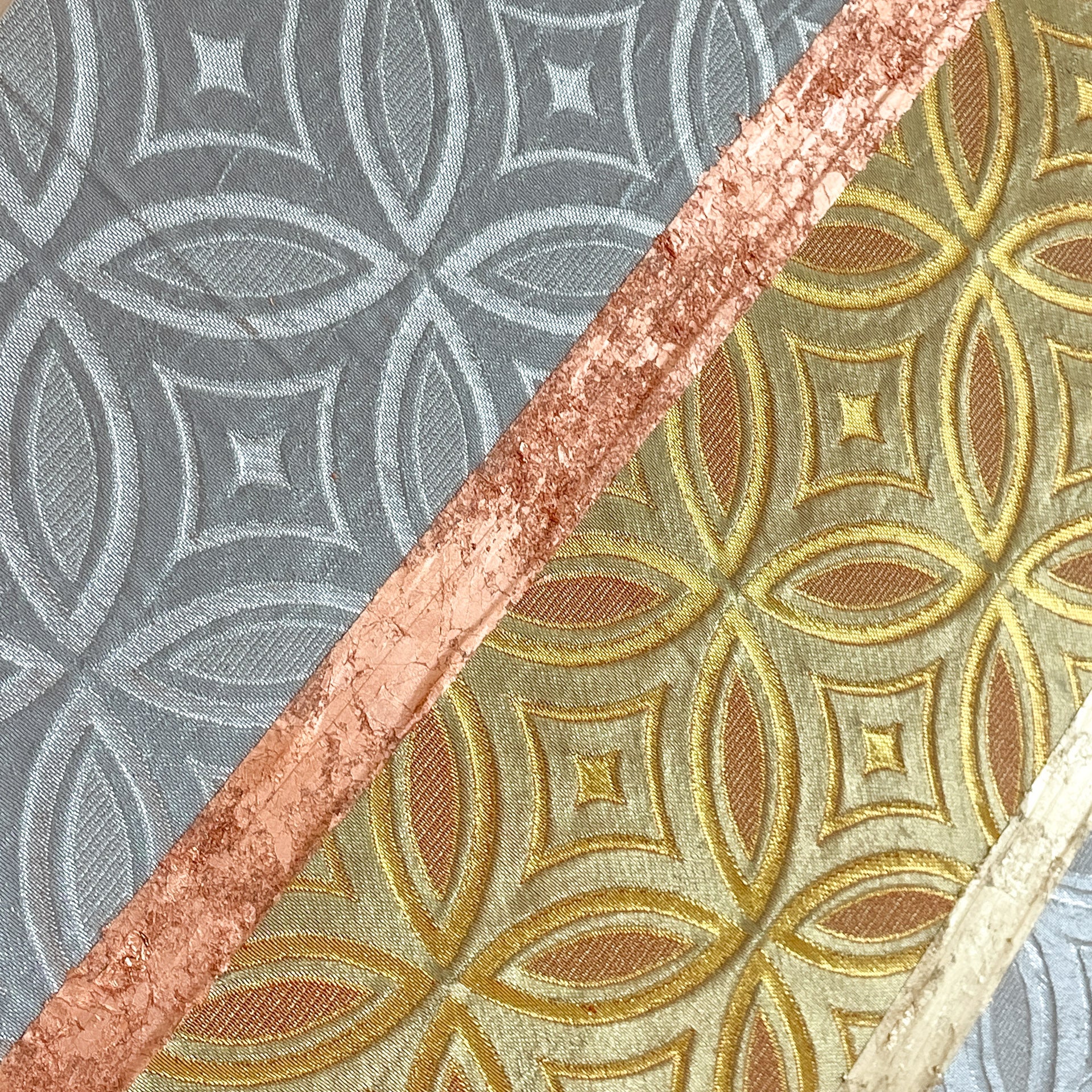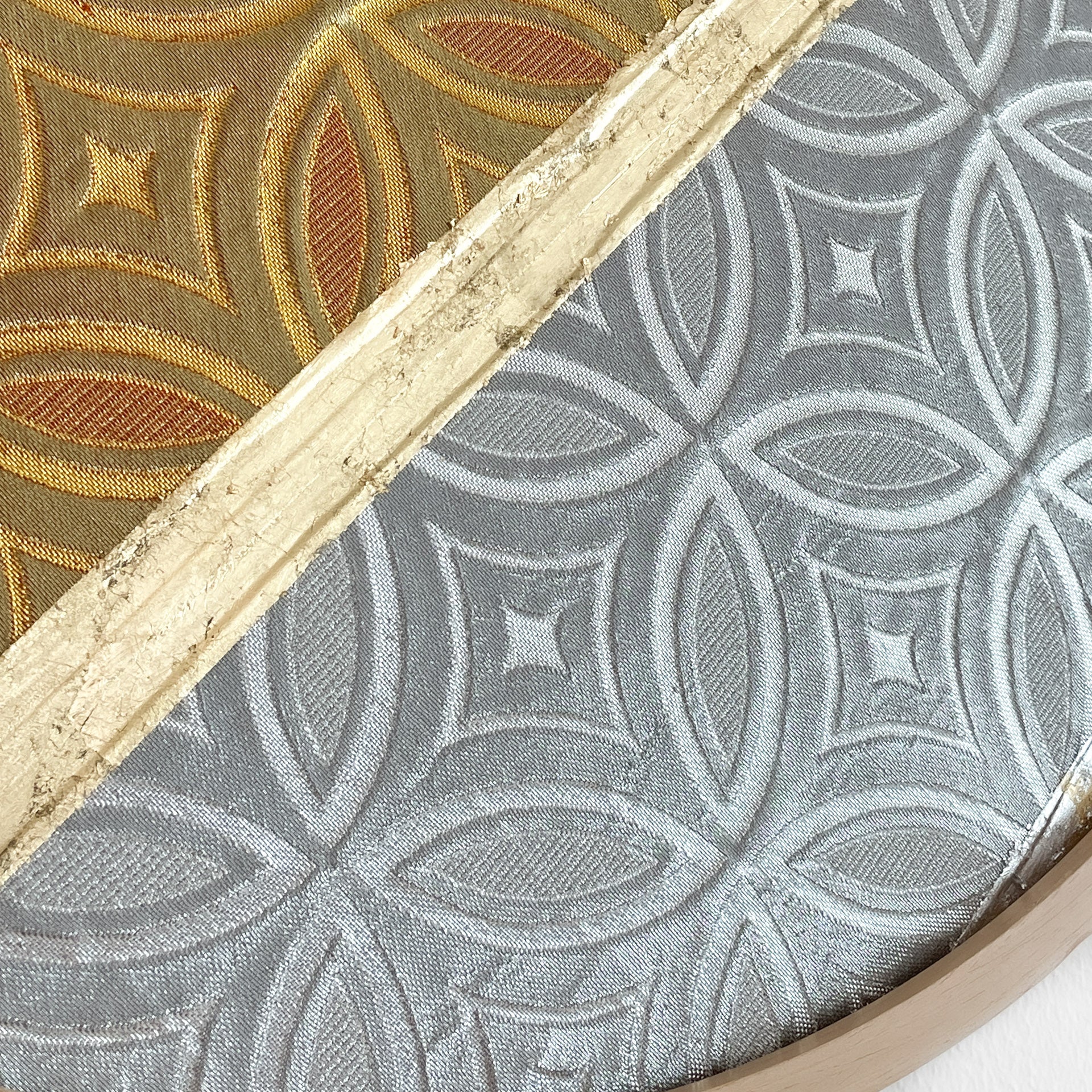 This artwork uses two pieces - front and reverse sides of same vintage obi (sash for kimono) fabric, united in a symbol of bonds and unity in Eastern culture - flower of life, it’s Japanese version called “Shippo-tsunagi”.