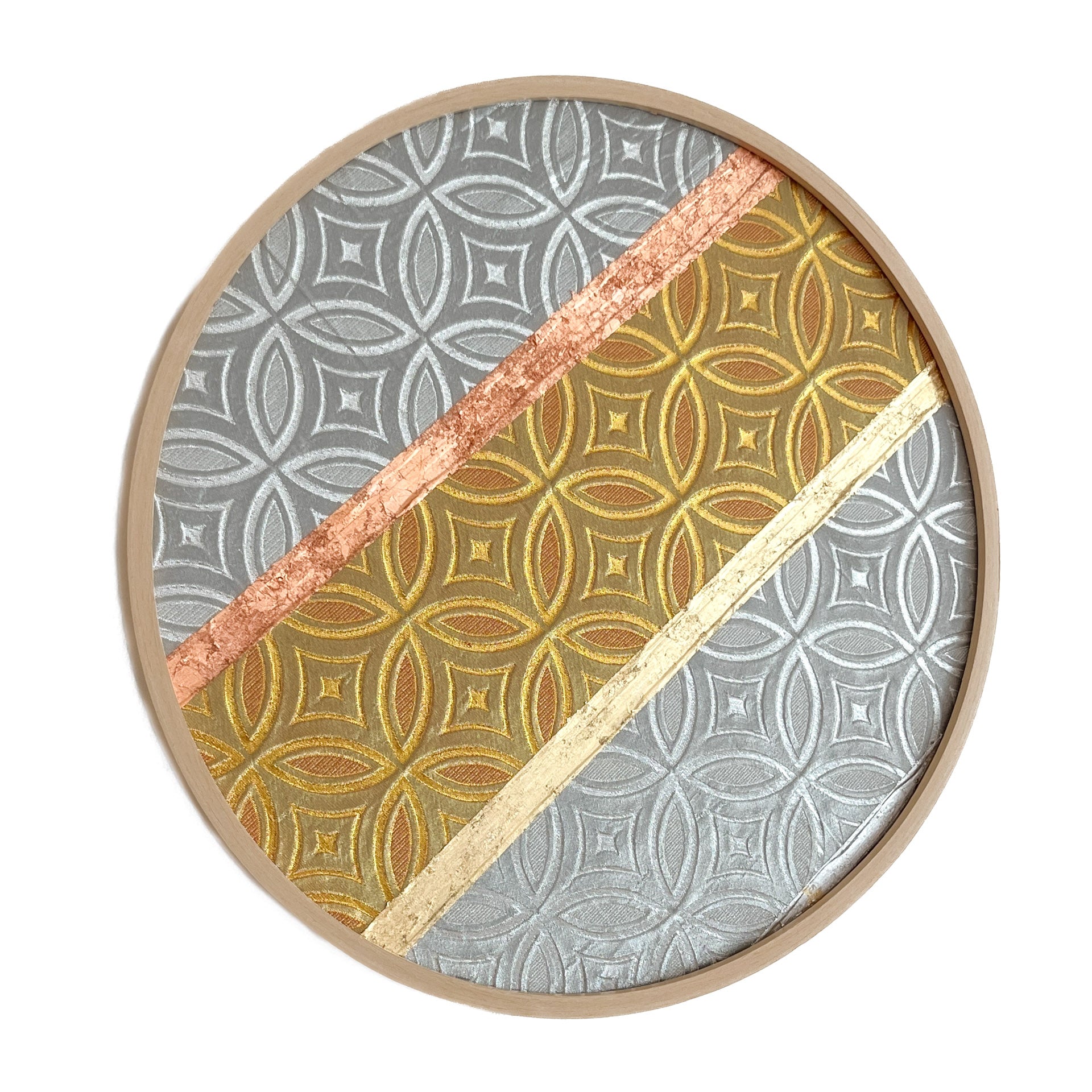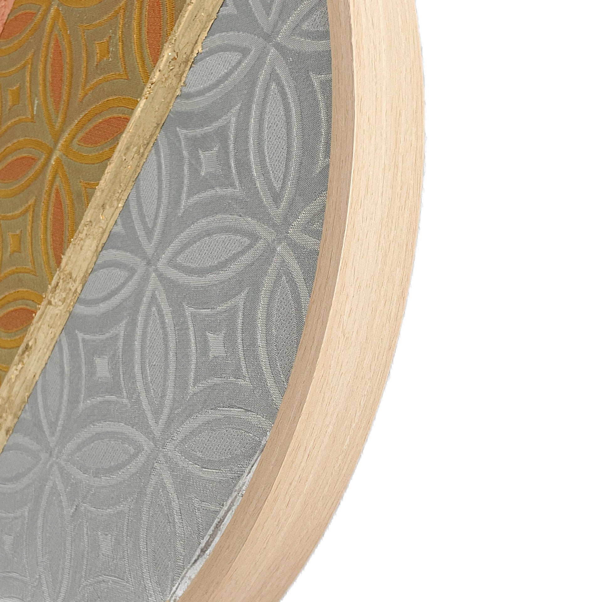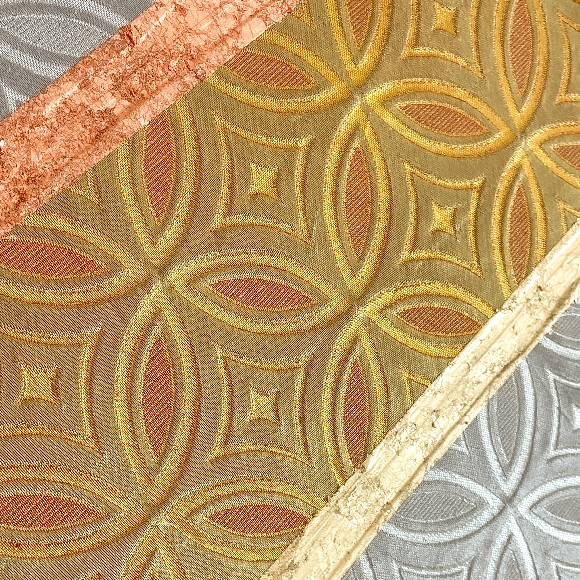This artwork uses two pieces - front and reverse sides of same vintage obi (sash for kimono) fabric, united in a symbol of bonds and unity in Eastern culture - flower of life, it’s Japanese version called “Shippo-tsunagi”.