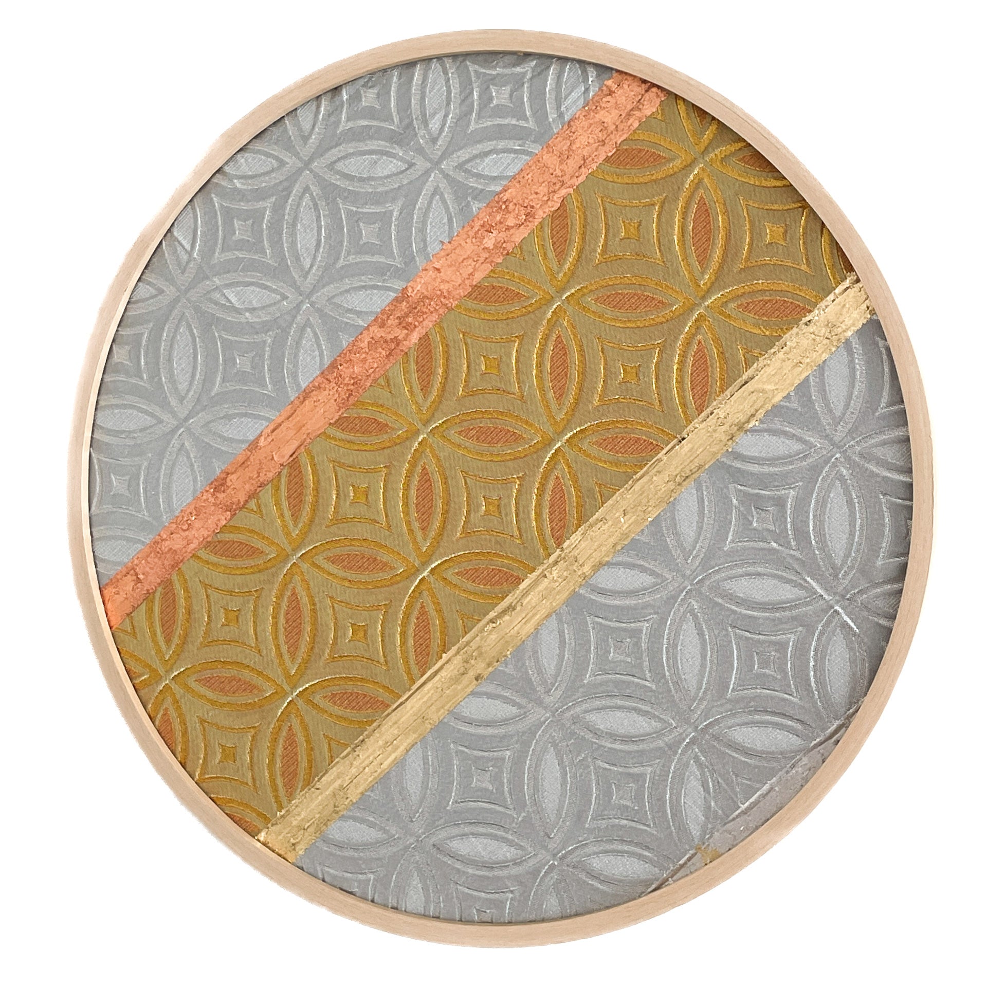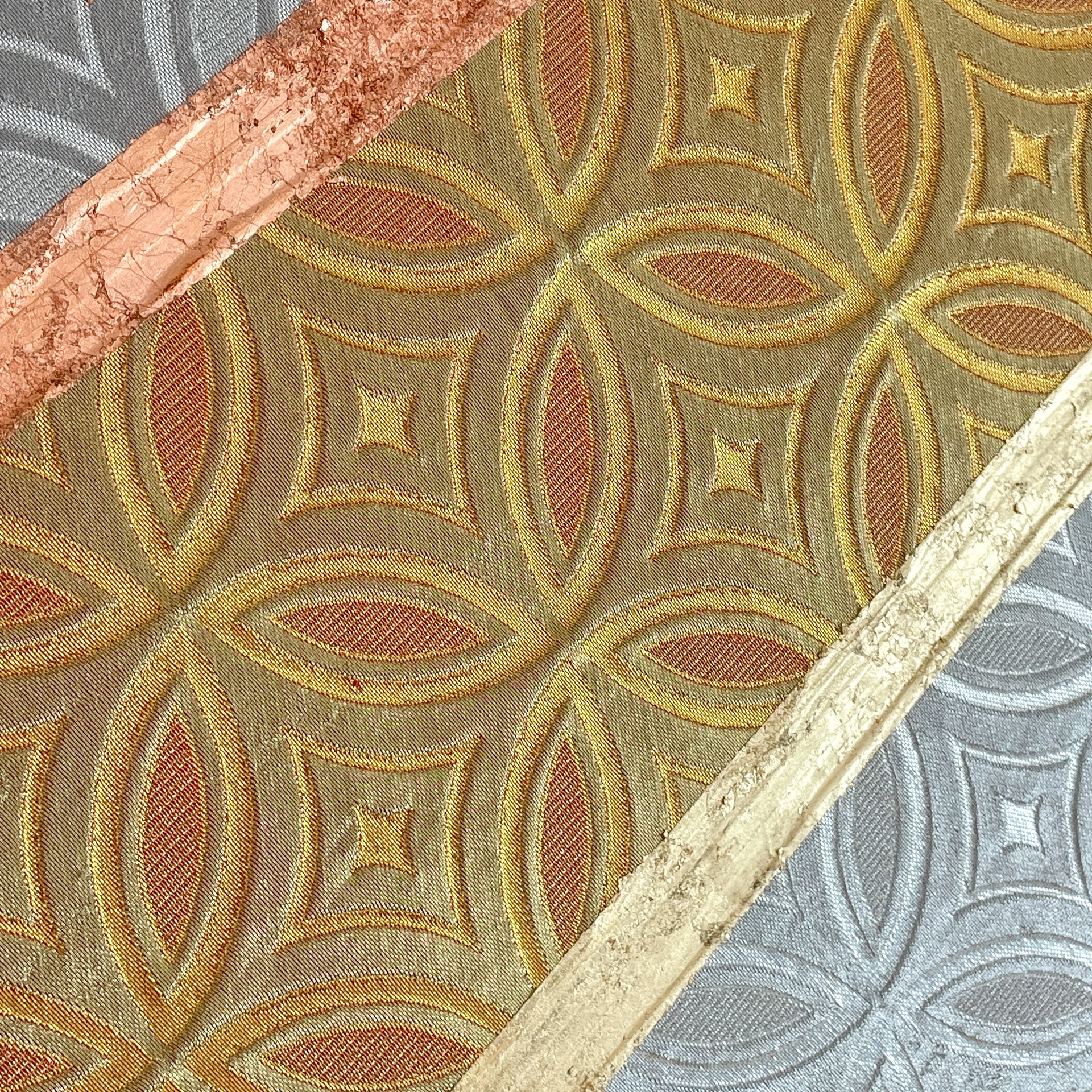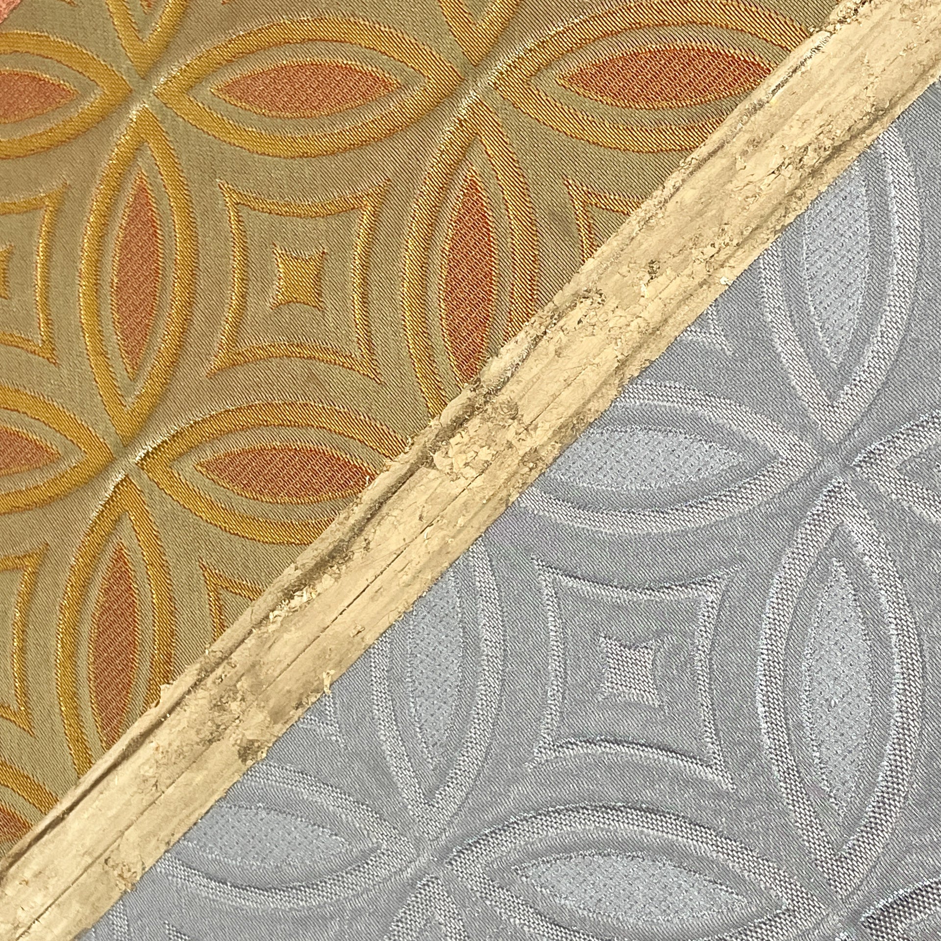 antique silk, golden and silver leaf on pine wood