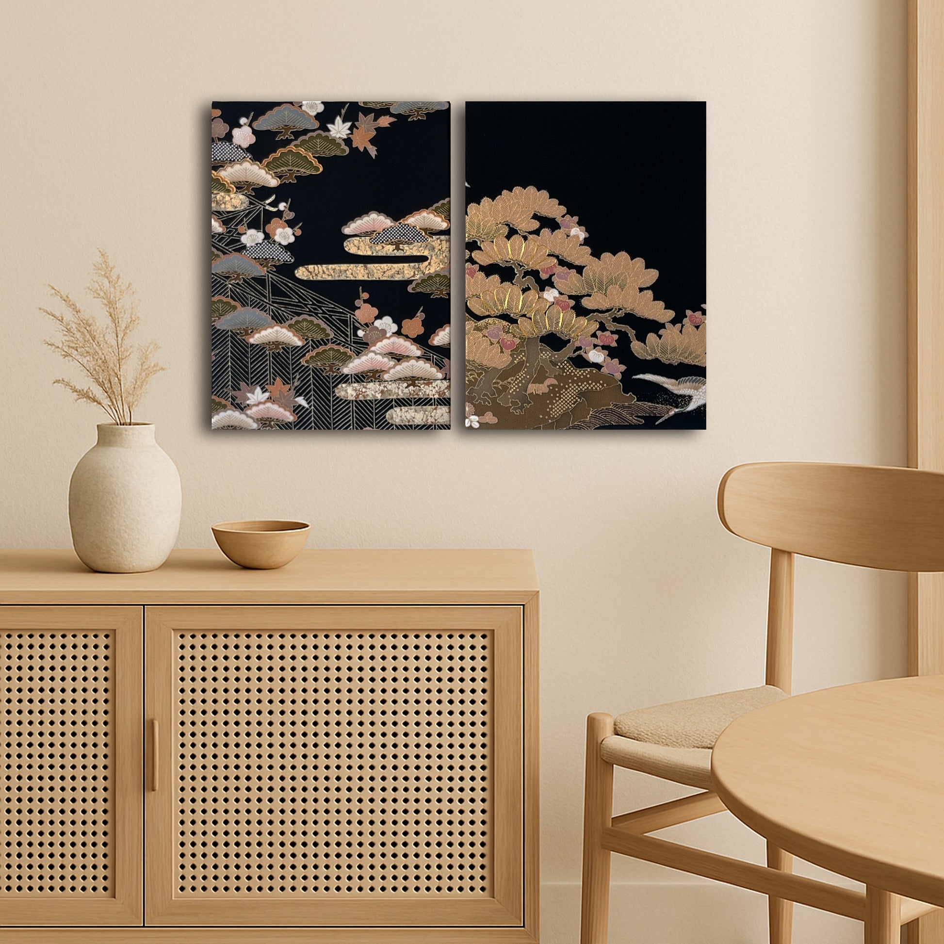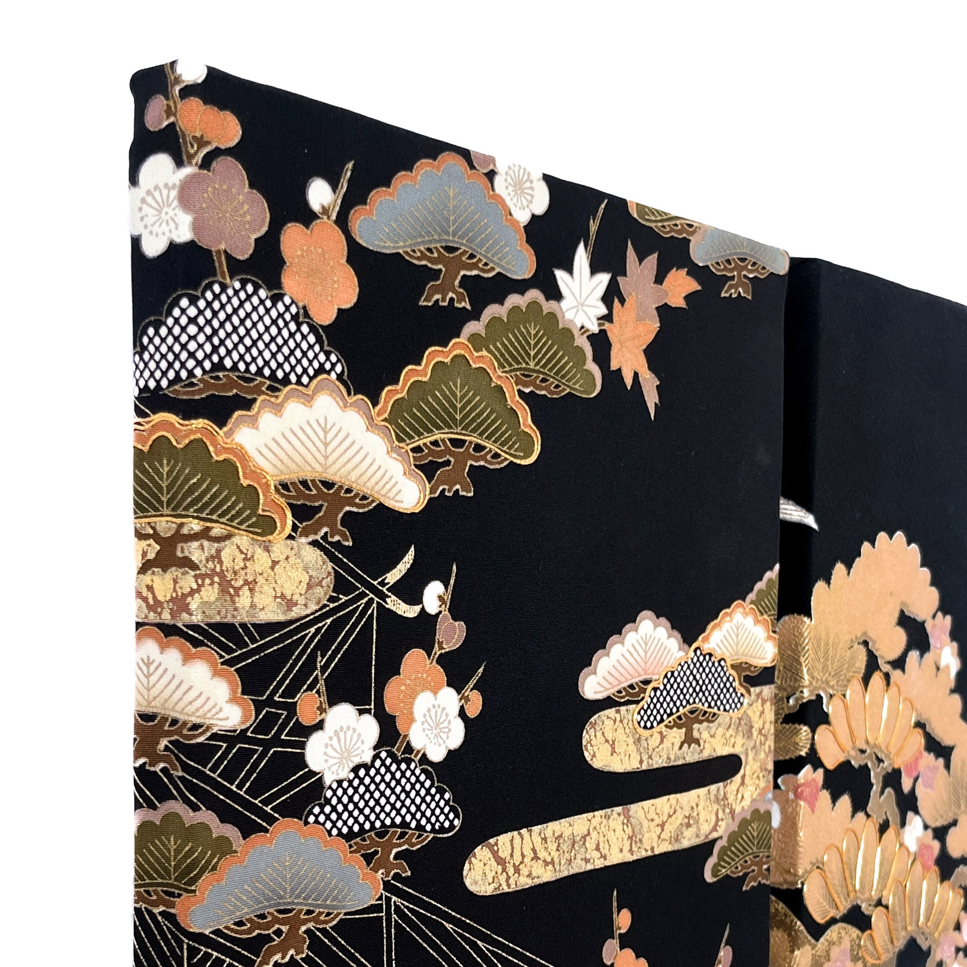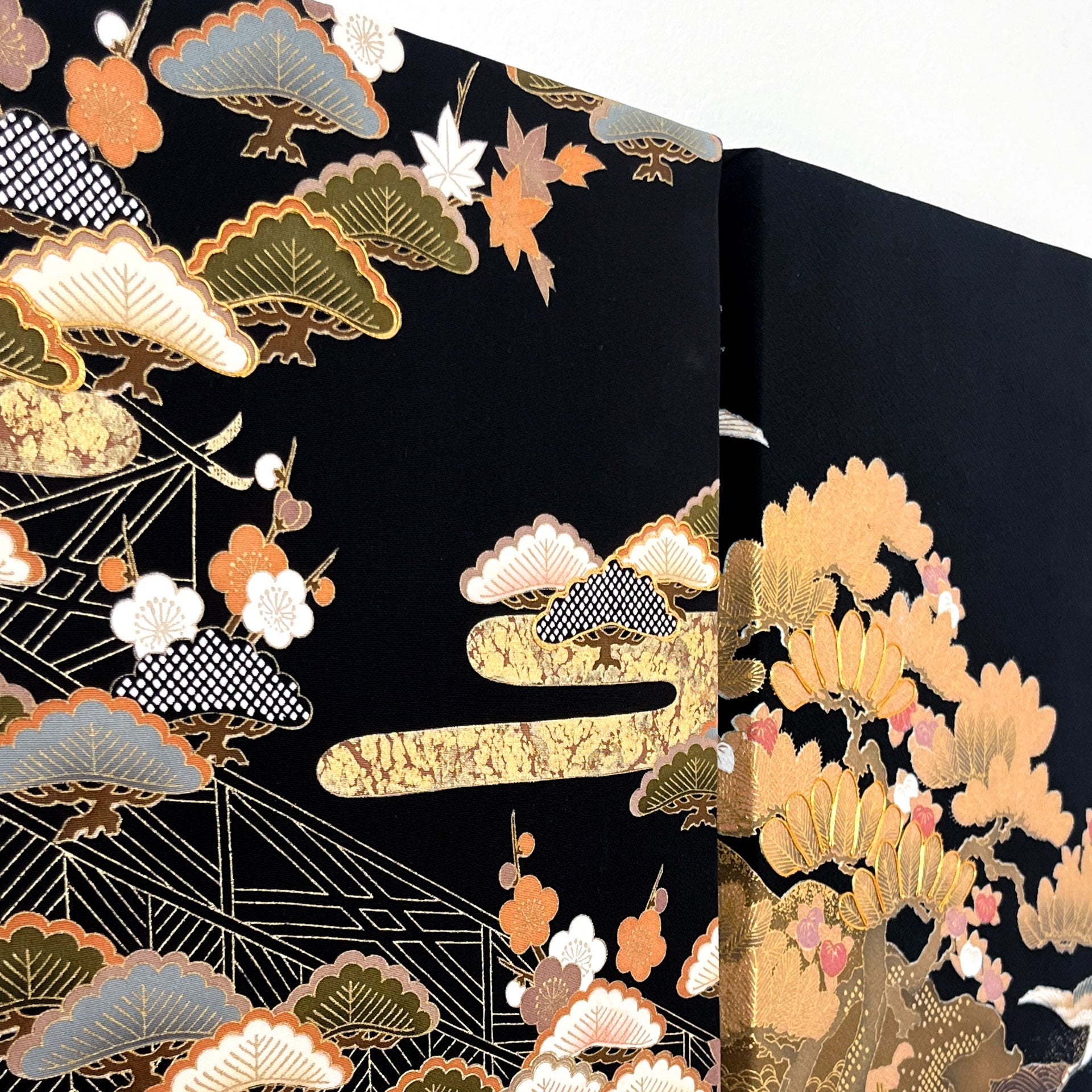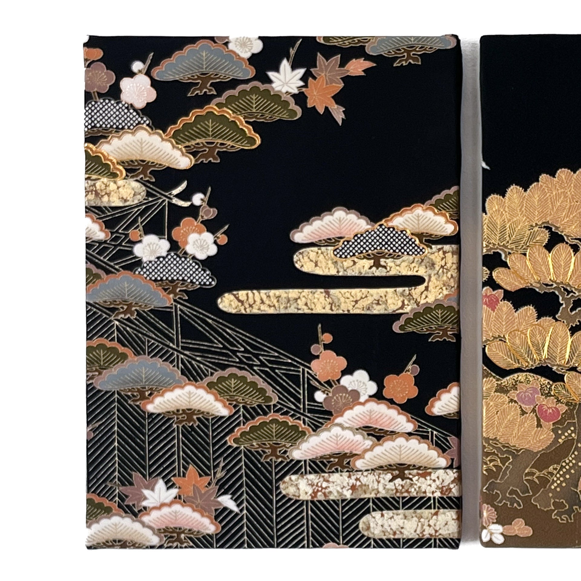 This elegant diptych unites two different kimono with Japan’s most auspicious motif: the steadfast pine. Created from antique formal kimono silk, the pair balances shimmering golds and deep blacks with warm autumnal tones. Each panel is hand-mounted in our Tokyo studio, transforming heirloom fabric into contemporary art while preserving its cultural soul.