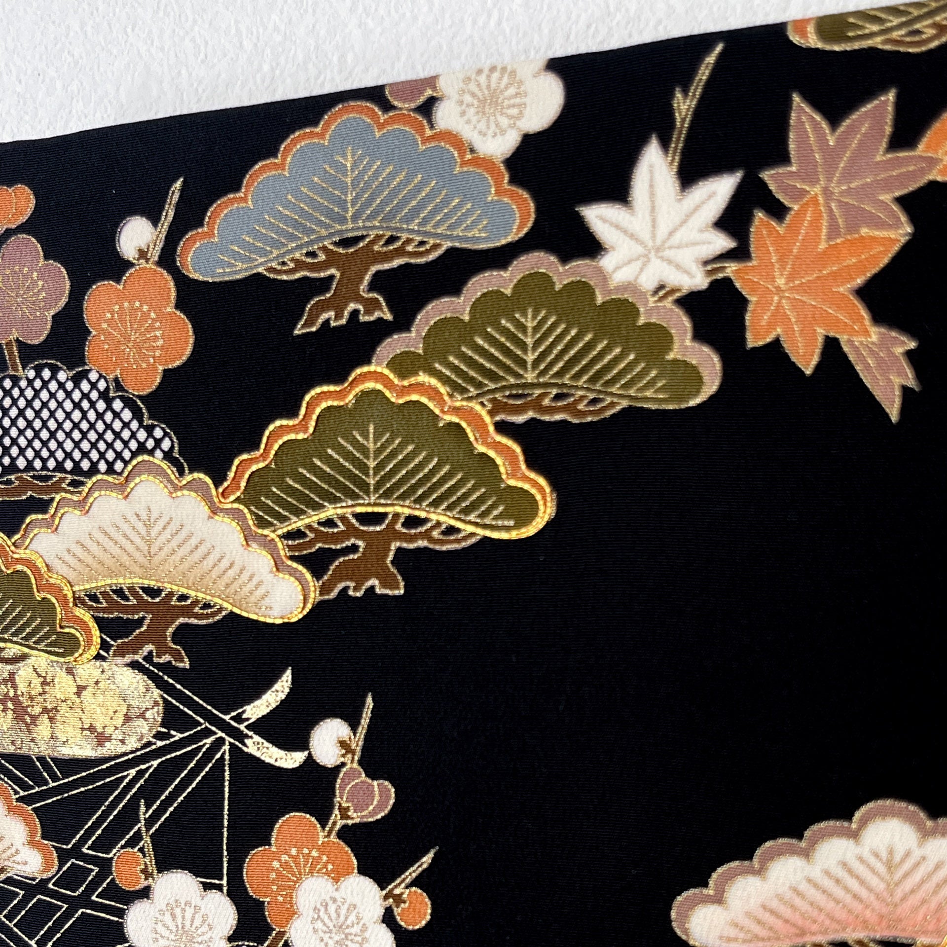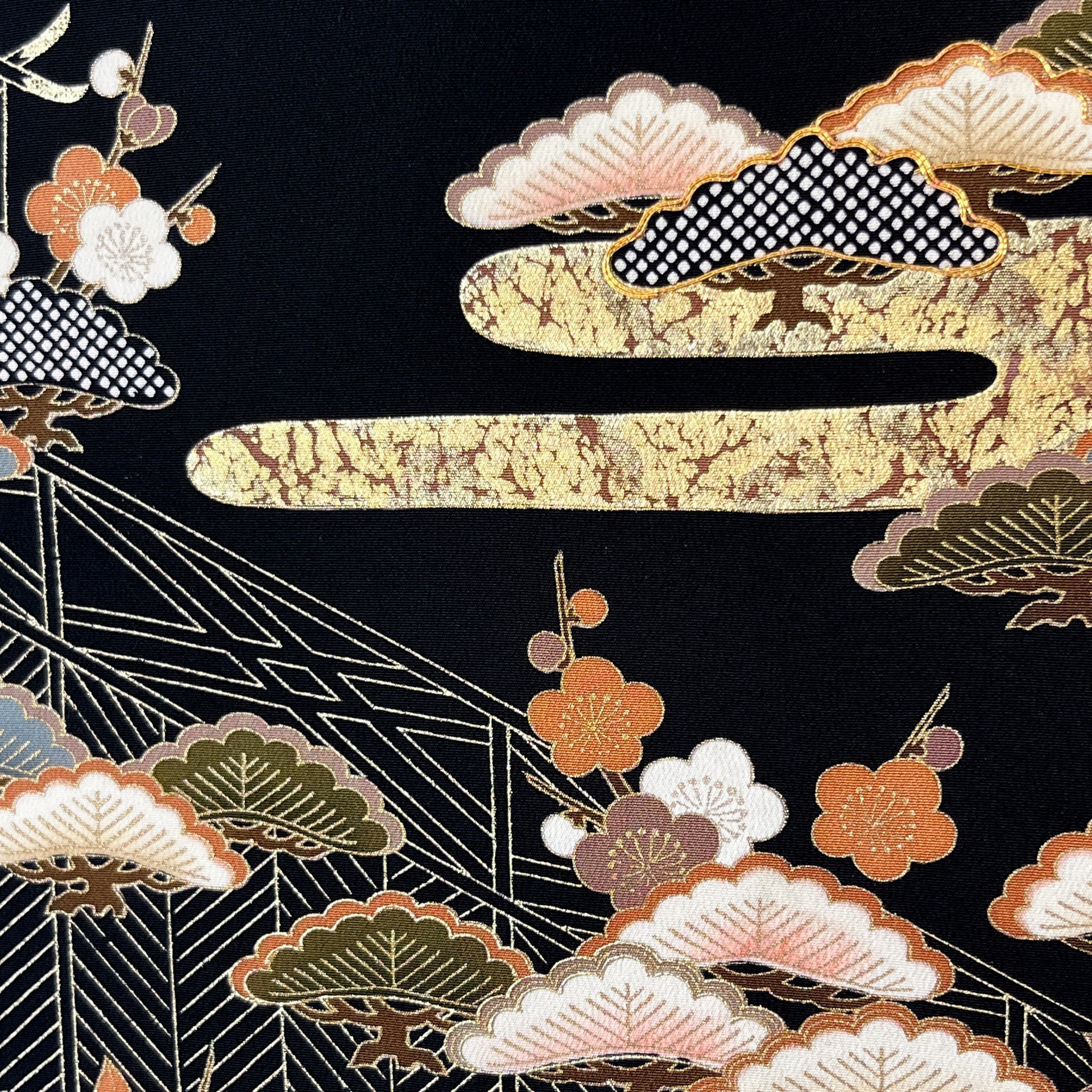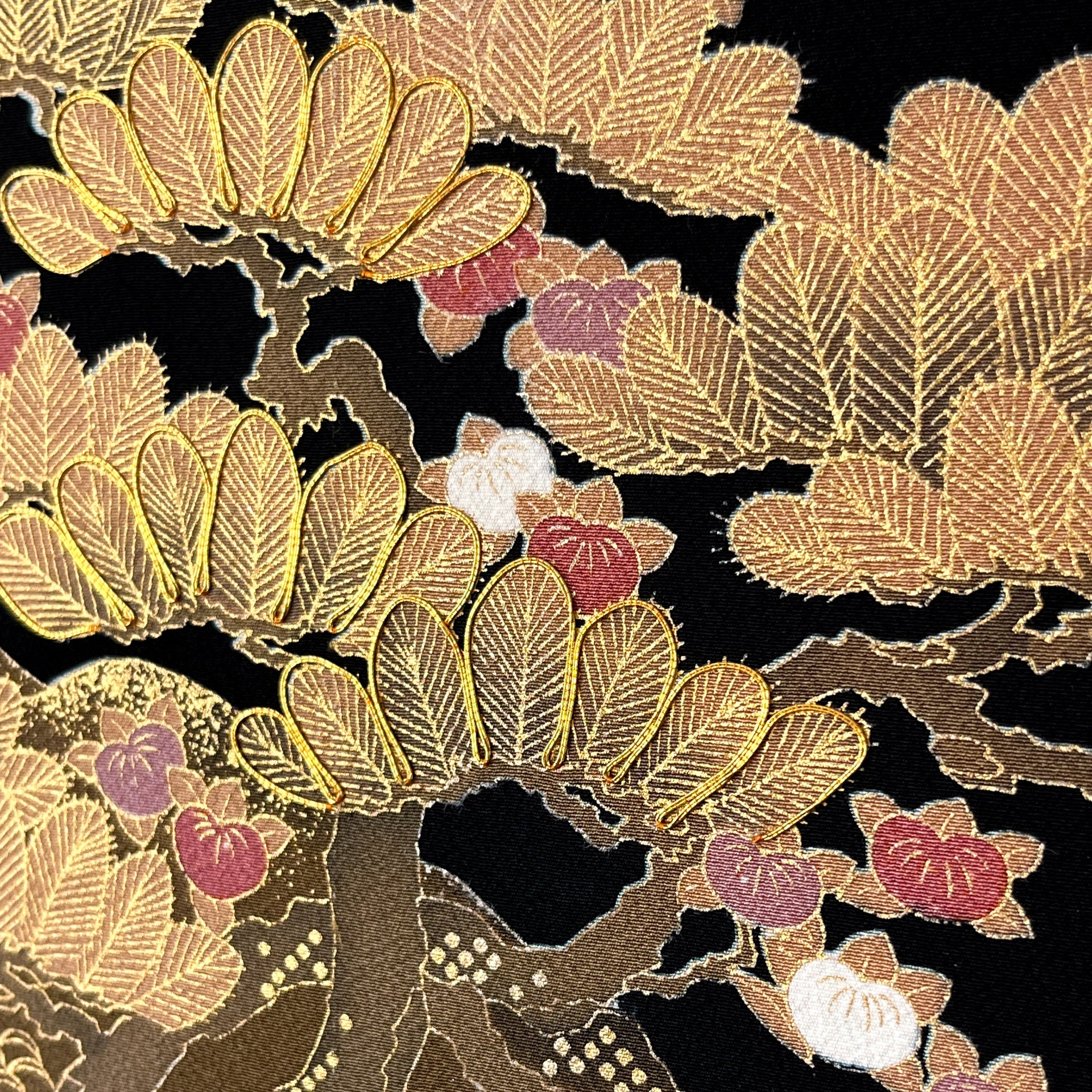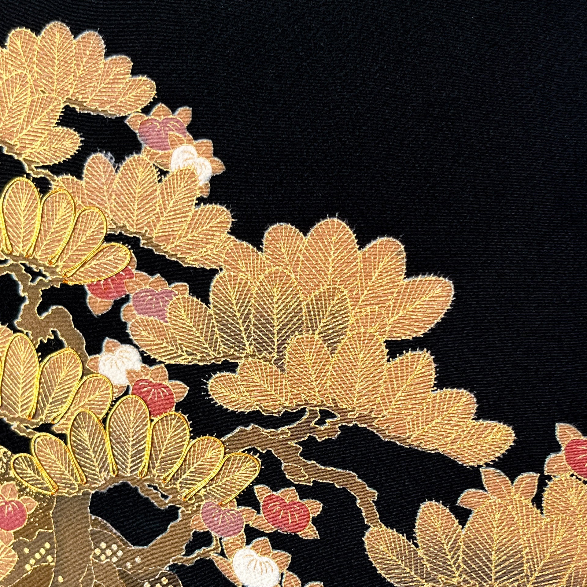 In Japanese tradition, the pine tree (matsu) represents eternal youth and steadfastness, remaining green through all seasons. It conveys wishes for prosperity, fidelity, and enduring vitality. Metallic gold threads shimmer like sunlight on ancient groves, while soft rust, ivory, and moss greens evoke the gentle beauty of an autumn landscape set against a night-black sky.