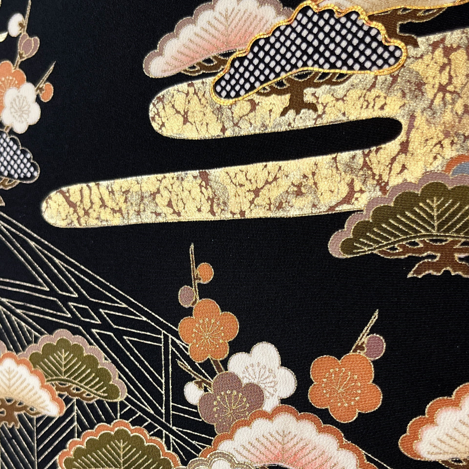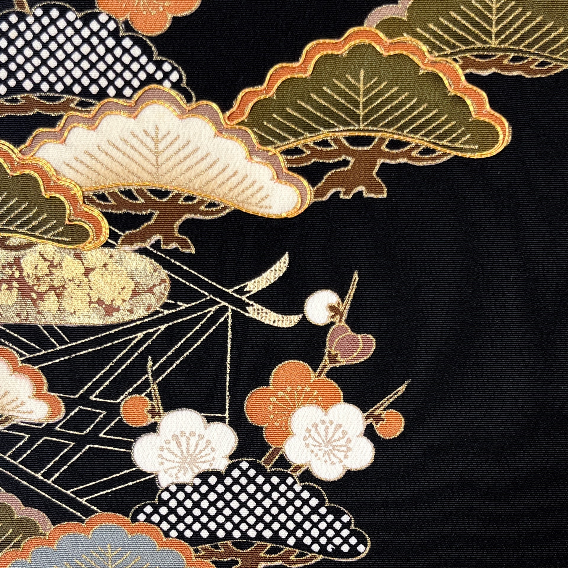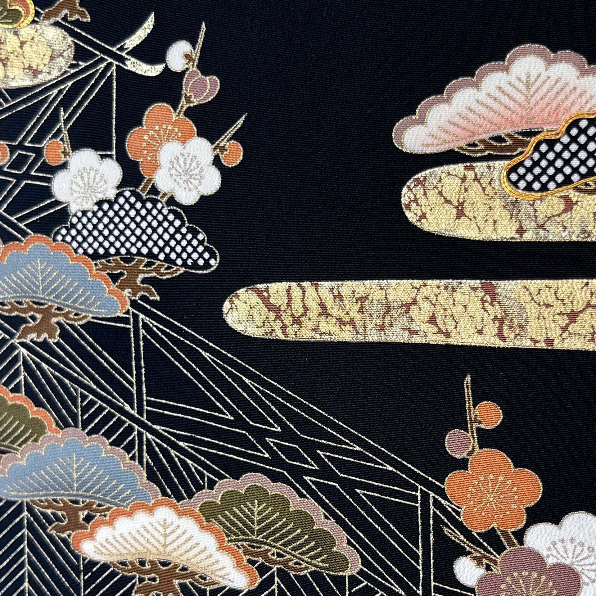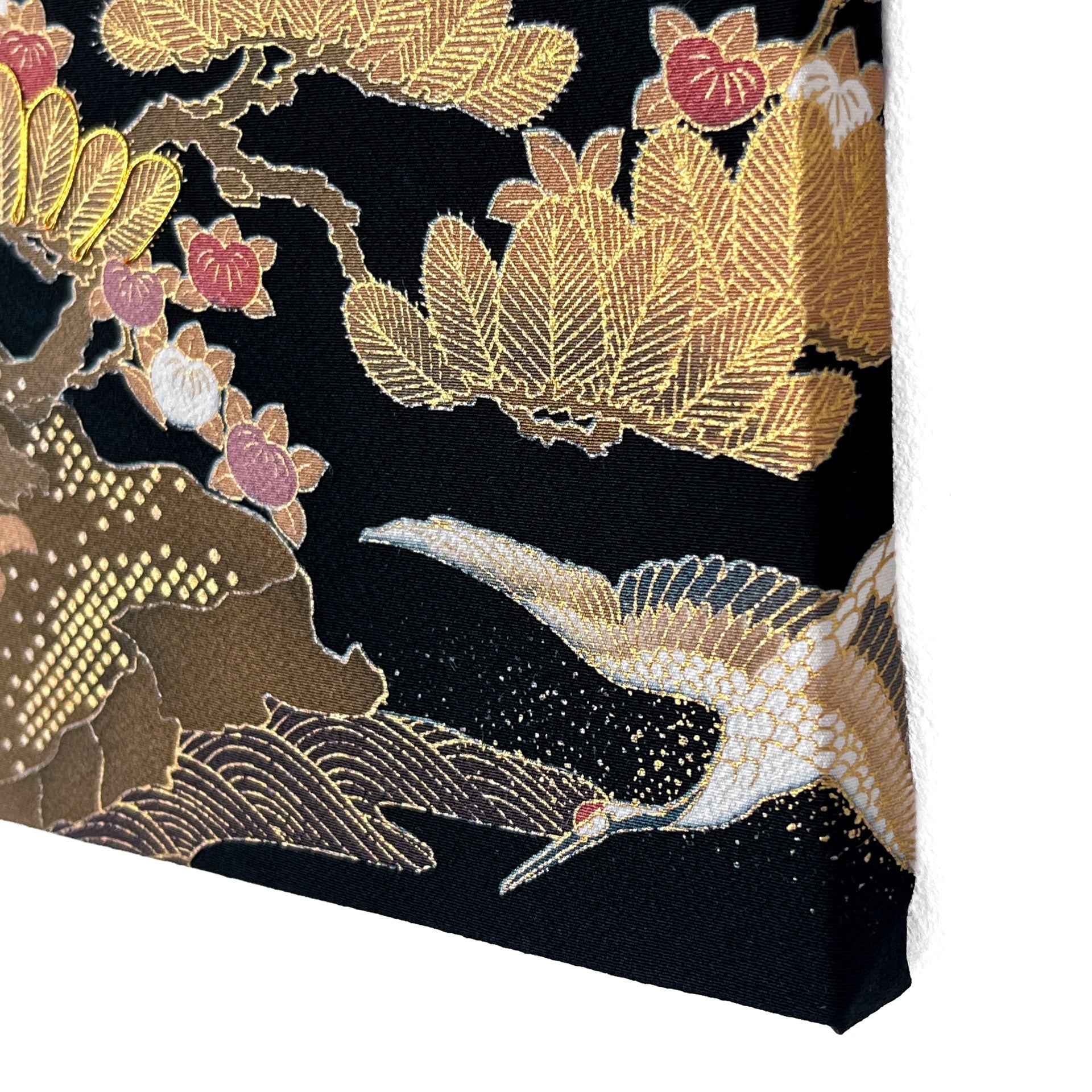 The fabric originates from a mid-Showa era (around 1970ies) kuro-tomesode, the most formal kimono worn by married women for ceremonial occasions. Such garments often bore motifs of good fortune and enduring happiness—symbols chosen to bless weddings and significant family celebrations. By giving this textile a new life as wall art, ikasu carries forward its history of celebration and longevity.