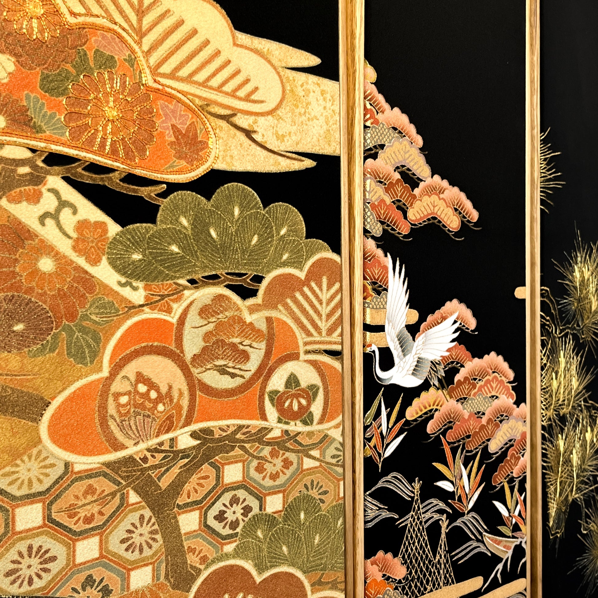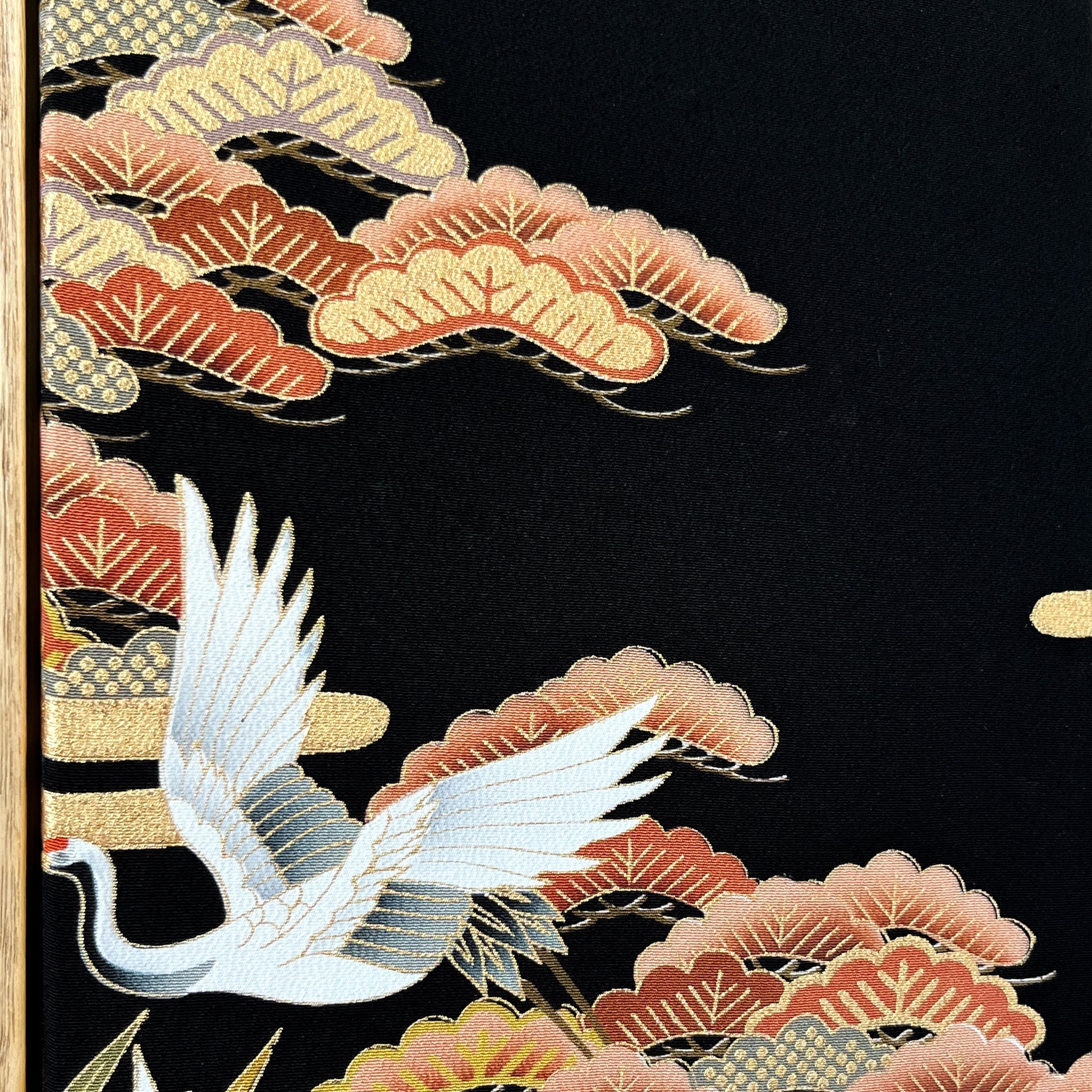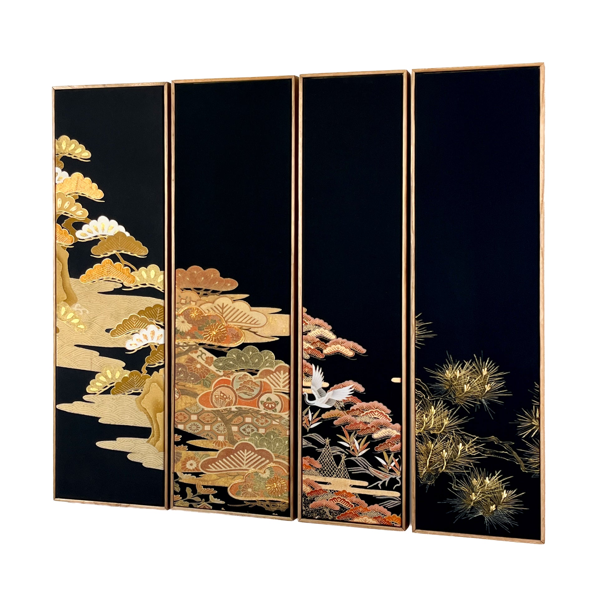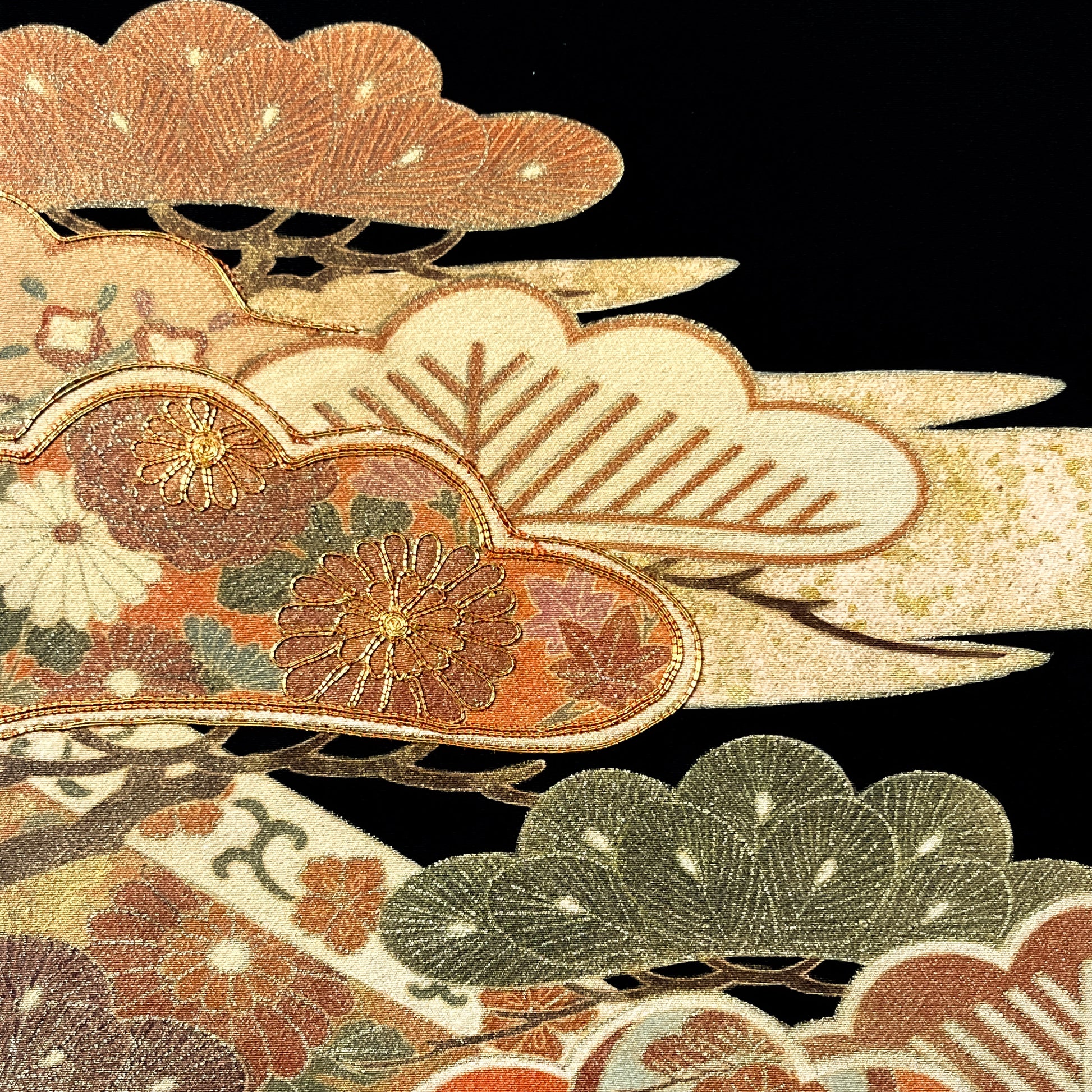 This artwork is created from four different vintage kuro-tomesode (festive kimono), each carrying its own history, craftsmanship, and memory. Traditionally worn only for the most formal occasions, kuro-tomesode often remain preserved and unworn for decades. By uniting fragments from four garments into a single composition, the work reflects the meeting of separate lives, stories, and eras.