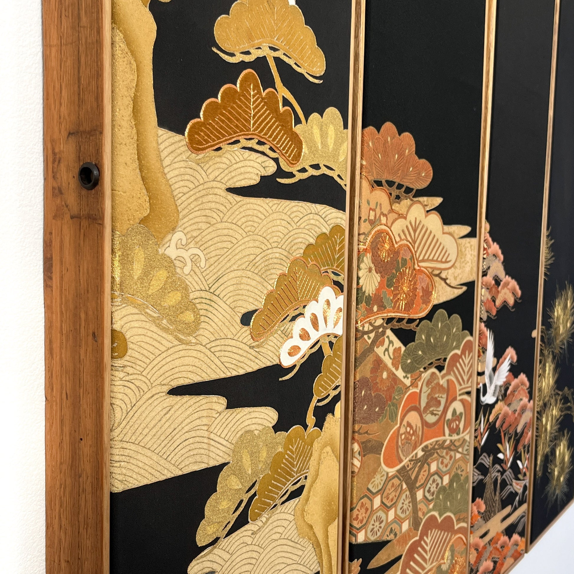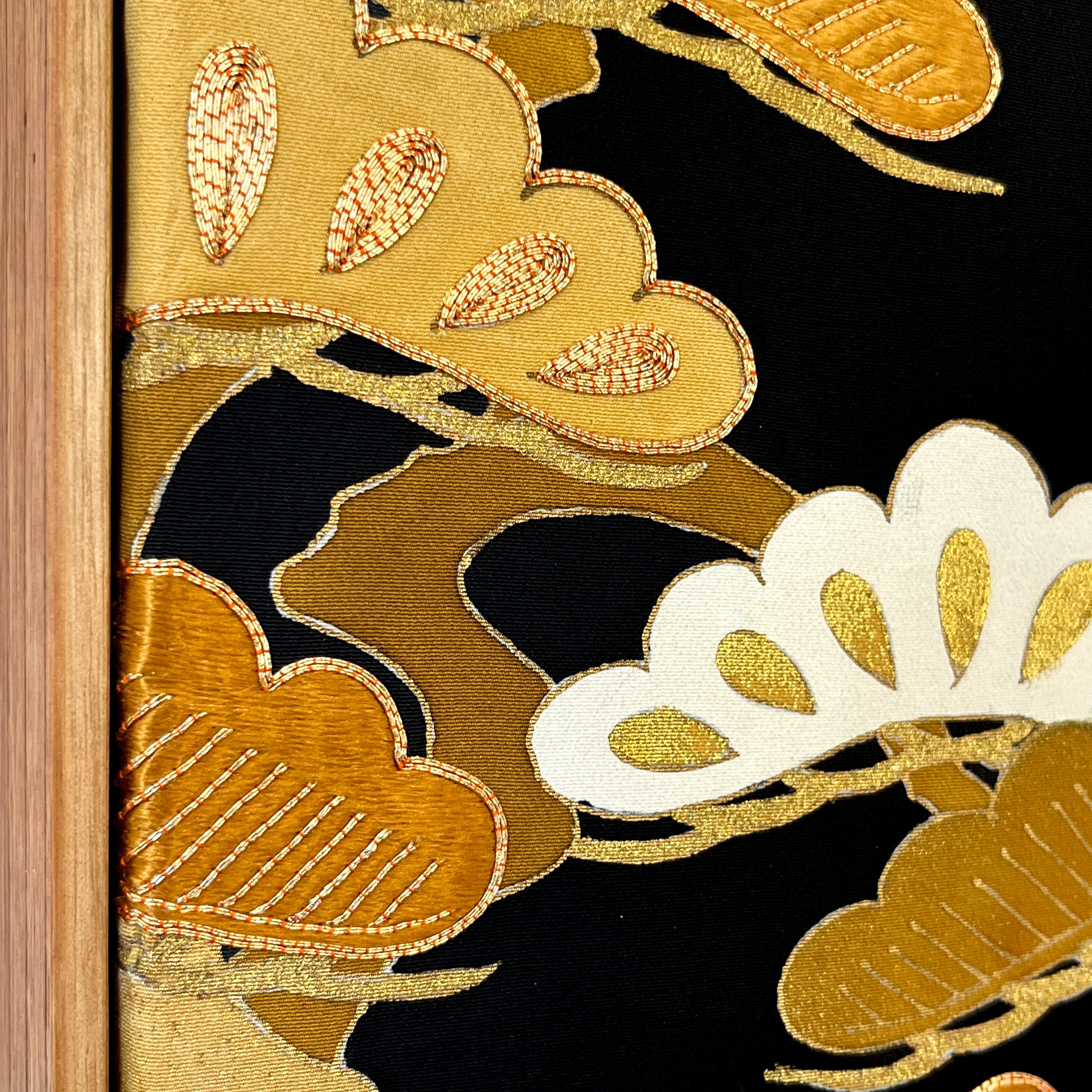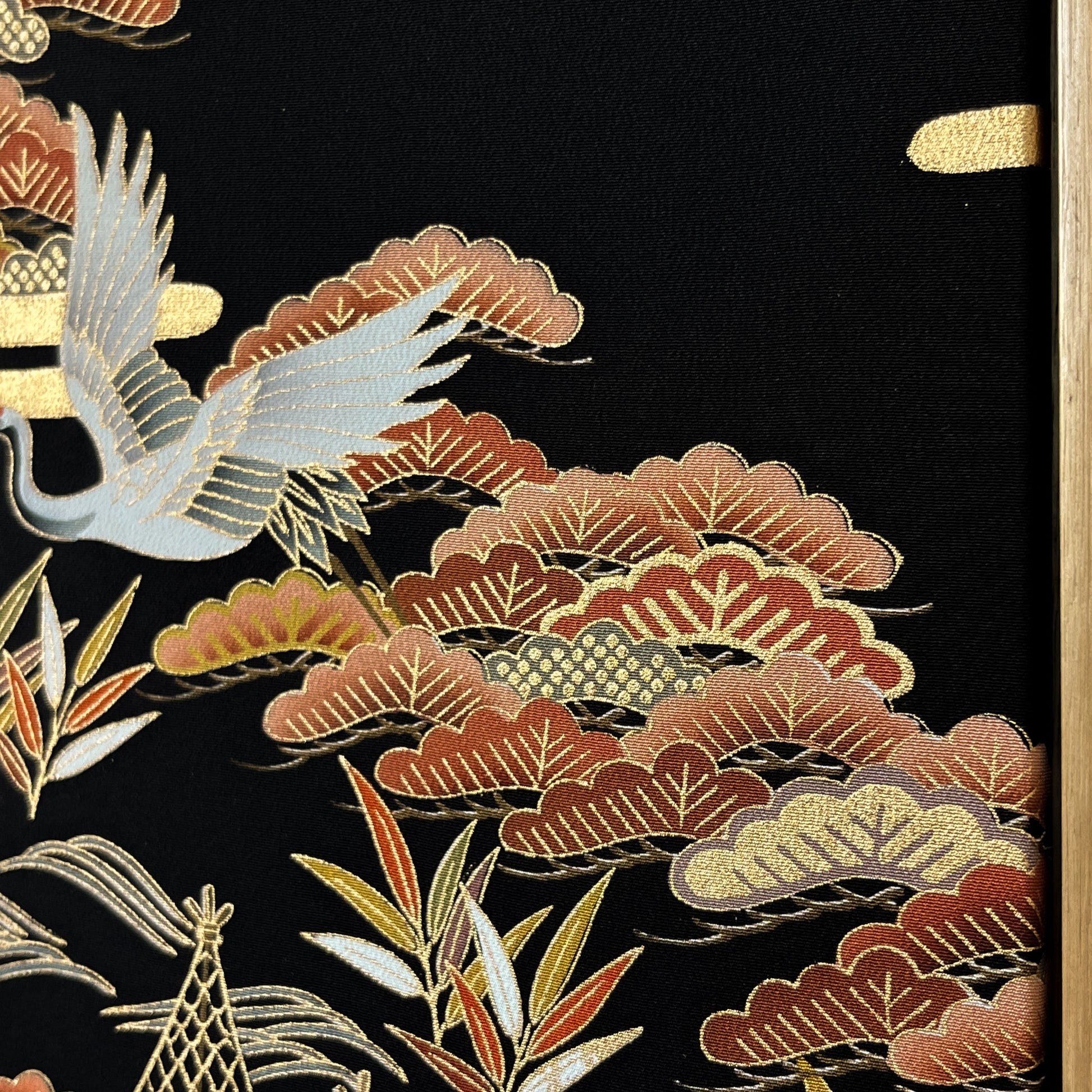 This artwork is created from four different vintage kuro-tomesode (festive kimono), each carrying its own history, craftsmanship, and memory. Traditionally worn only for the most formal occasions, kuro-tomesode often remain preserved and unworn for decades. By uniting fragments from four garments into a single composition, the work reflects the meeting of separate lives, stories, and eras.