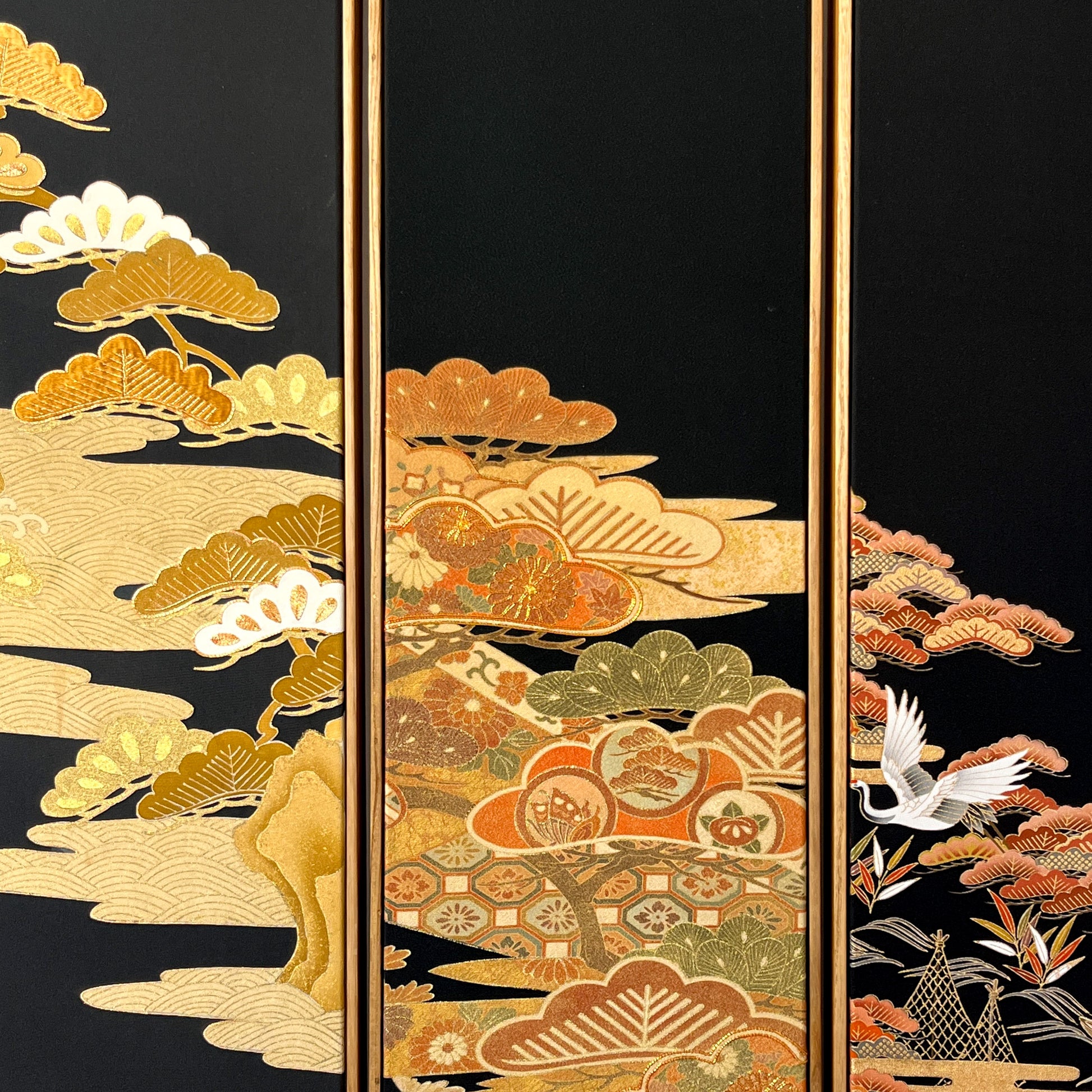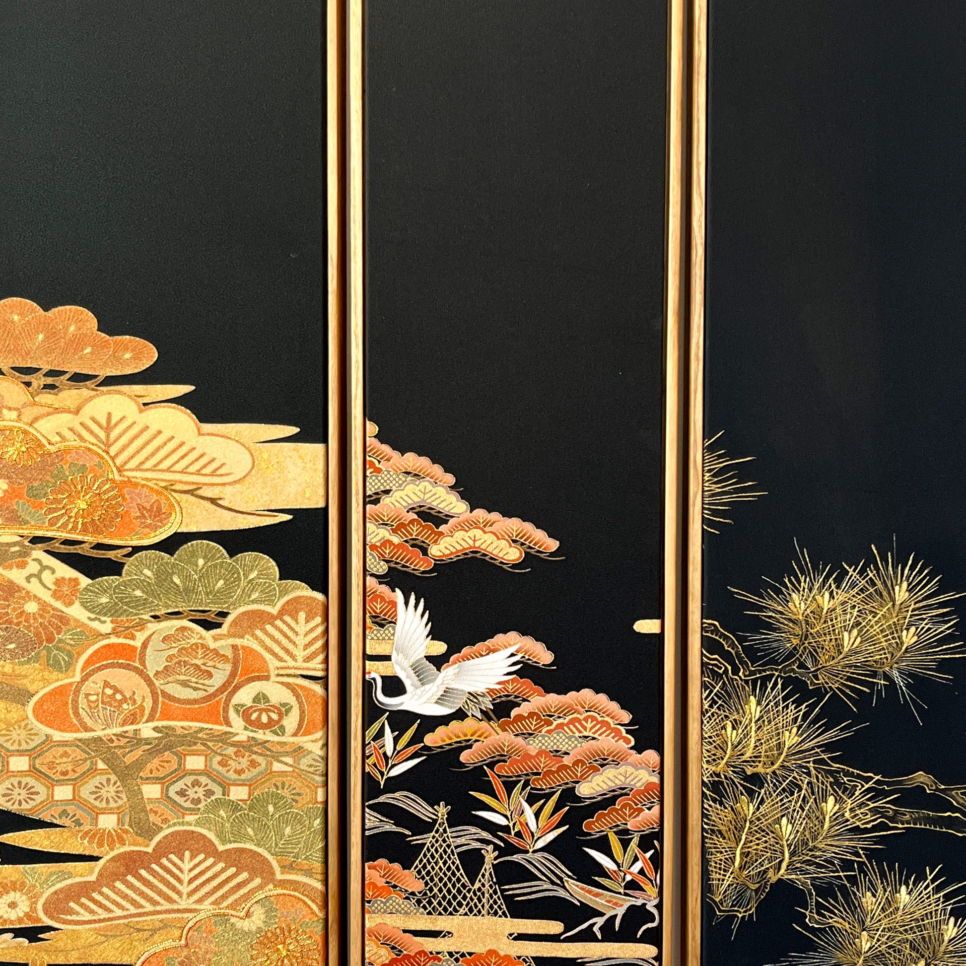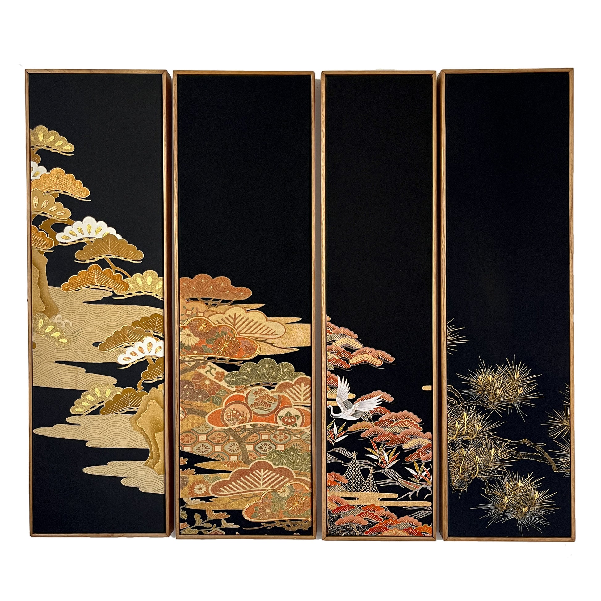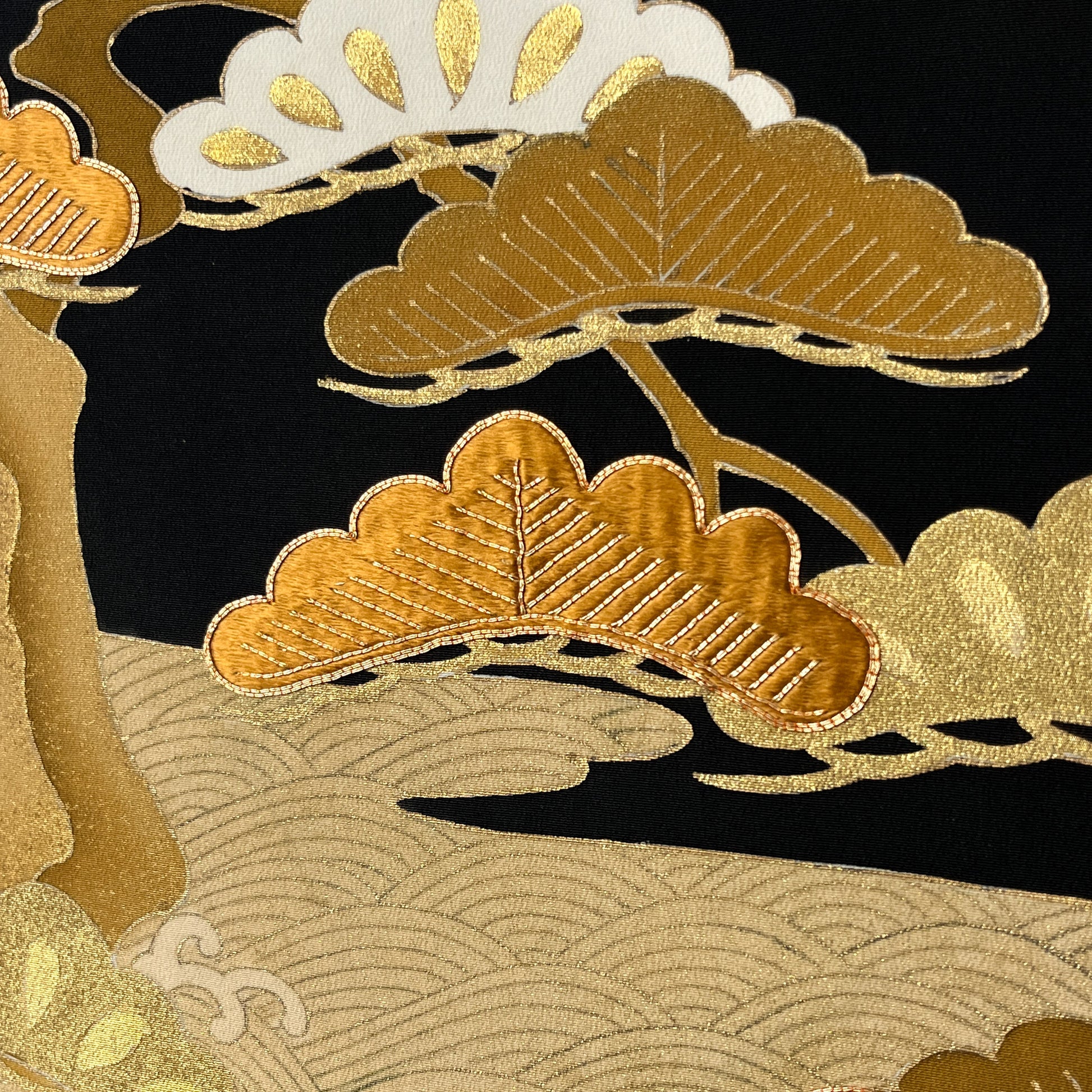 This artwork is created from four different vintage kuro-tomesode (festive kimono), each carrying its own history, craftsmanship, and memory. Traditionally worn only for the most formal occasions, kuro-tomesode often remain preserved and unworn for decades. By uniting fragments from four garments into a single composition, the work reflects the meeting of separate lives, stories, and eras.