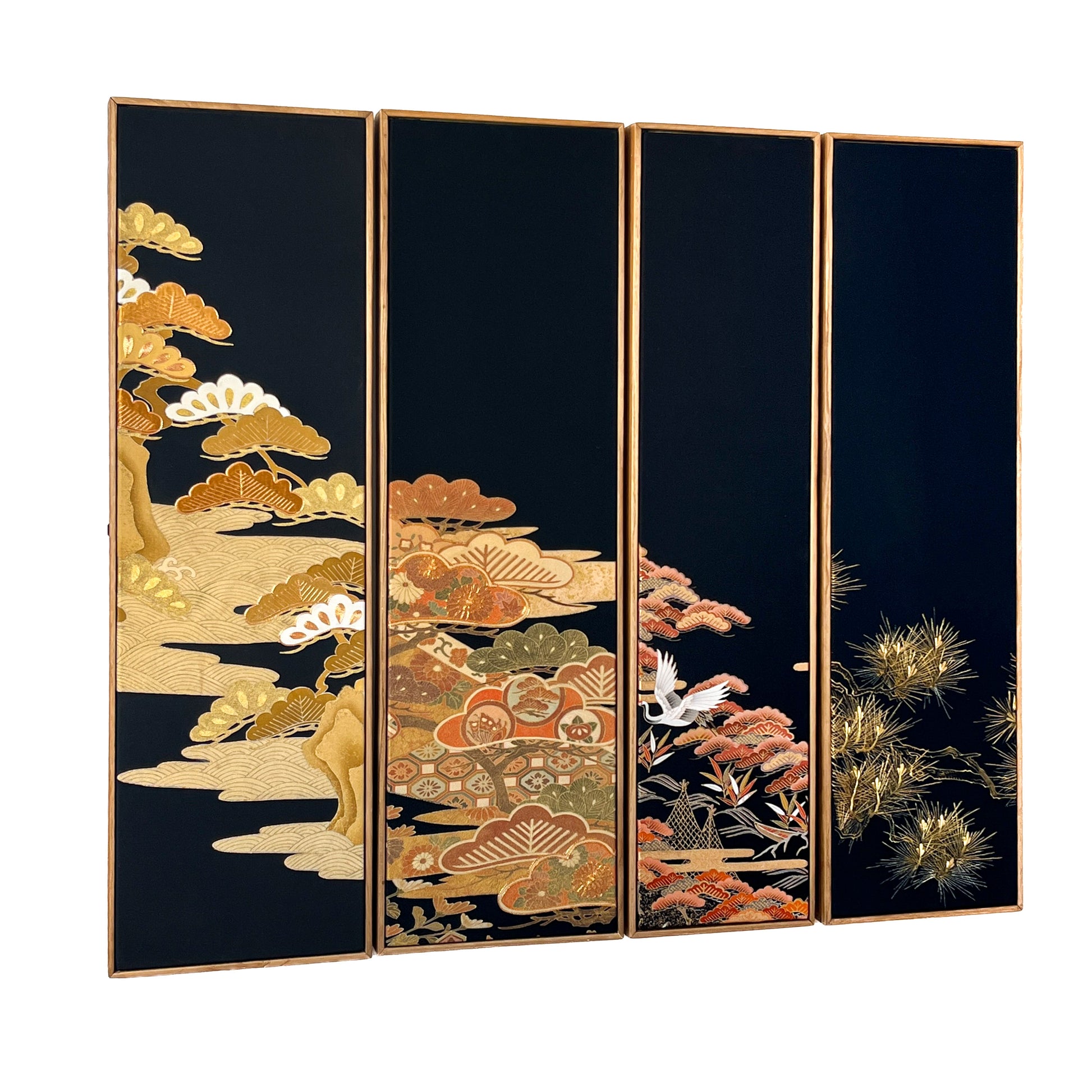 The composition is connected through the pine motif, expressed using different traditional textile techniques, color palettes, and decorative styles. These variations are carefully arranged into a continuous, fluid landscape across four panels. Each of the four panels represent one of the four seasons, suggesting the passage of time and the cyclical nature of life.