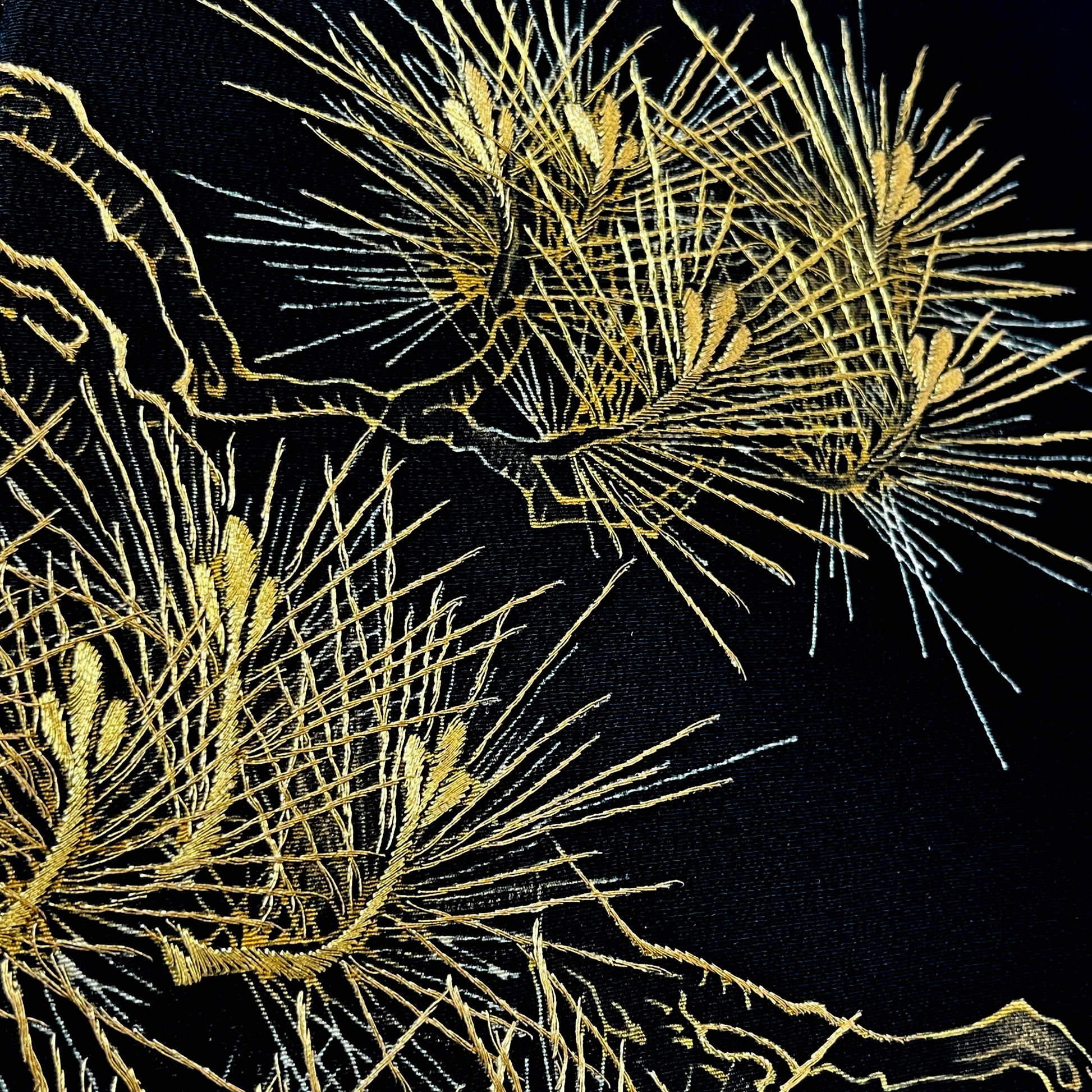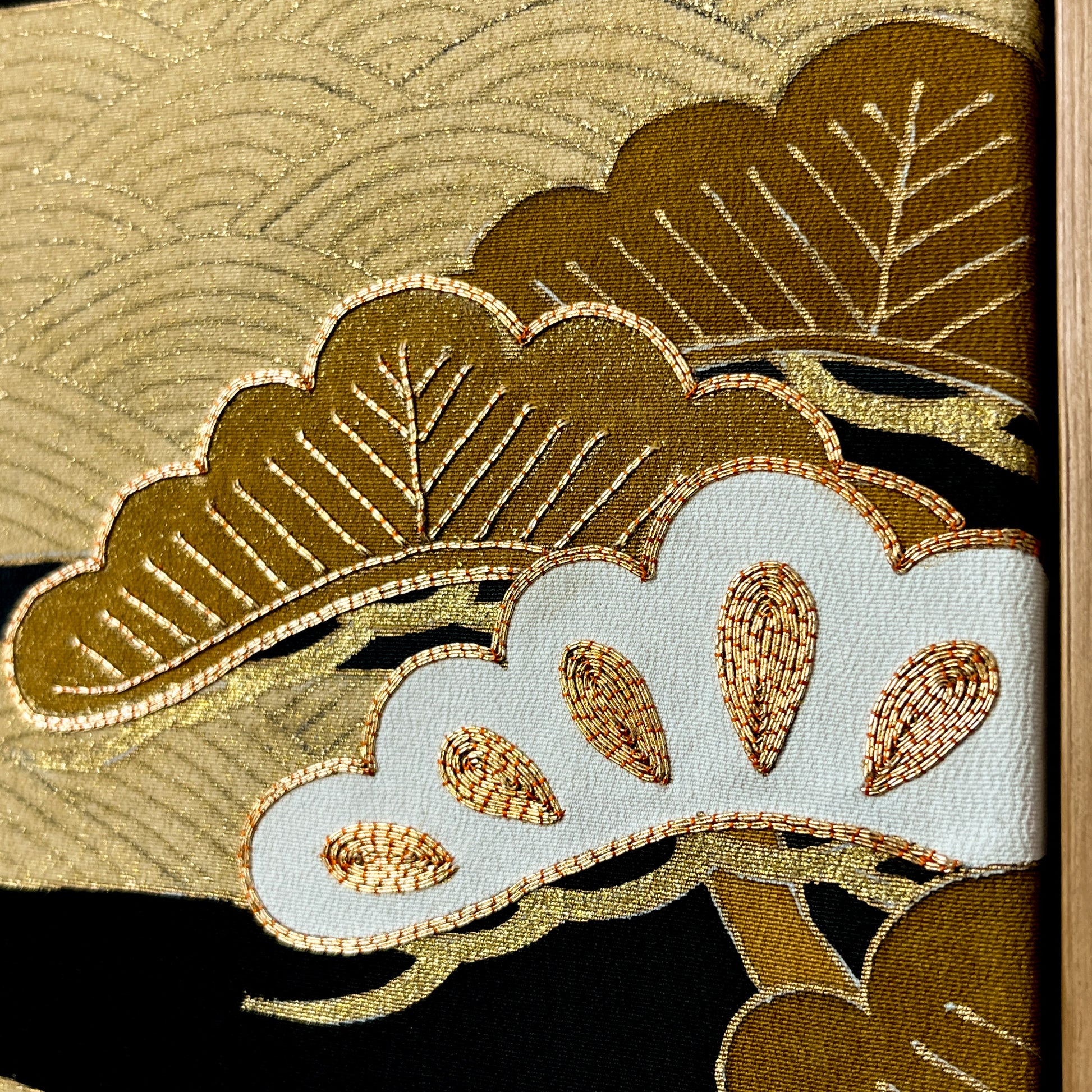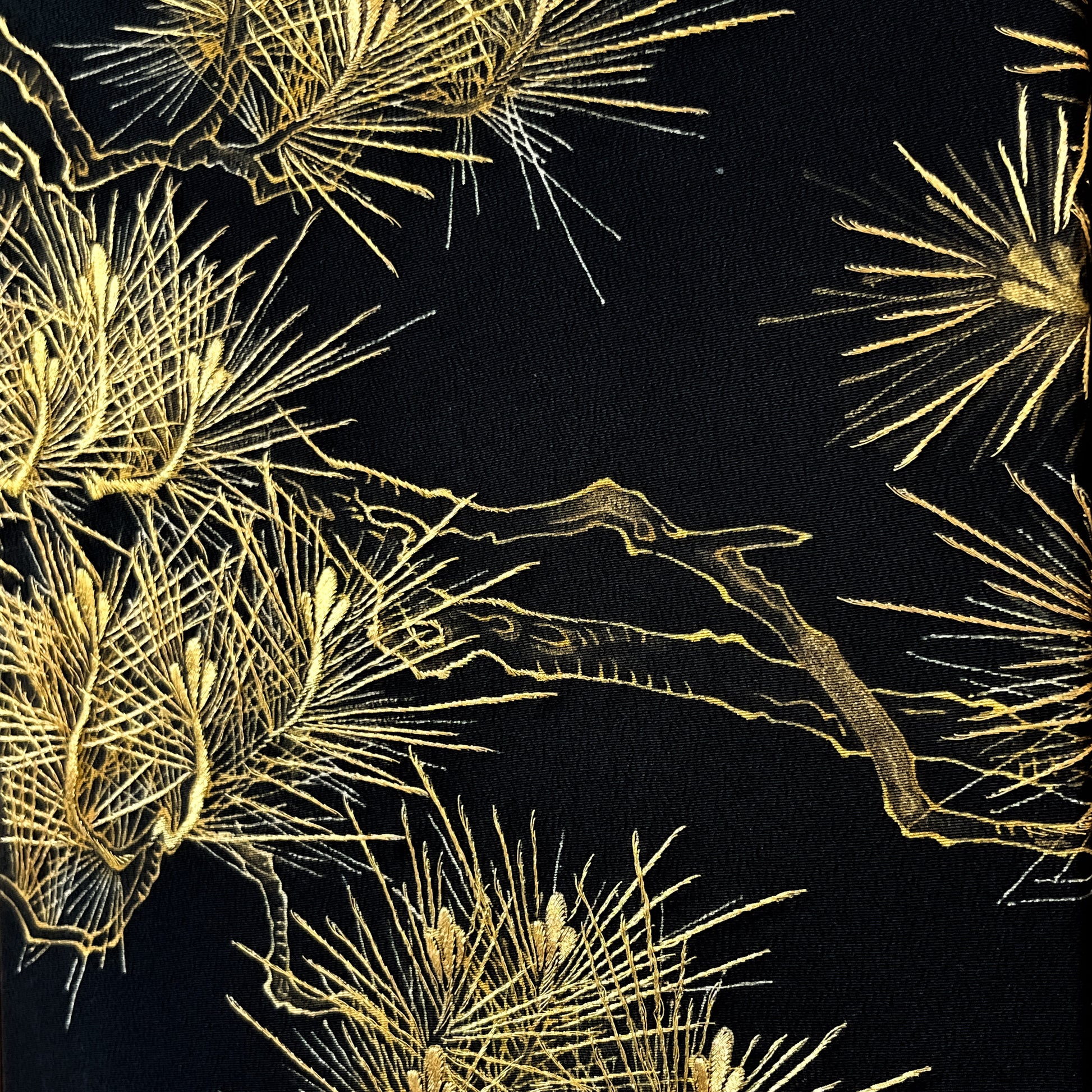 The variation of pine representations - through embroidery, dyeing, and woven ornamentation - demonstrates the diversity of traditional Japanese decorative techniques while maintaining a unified symbolic language.