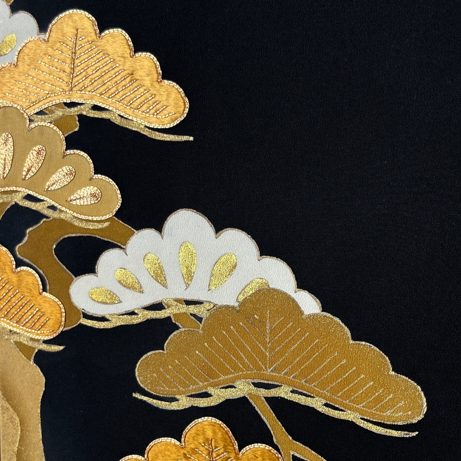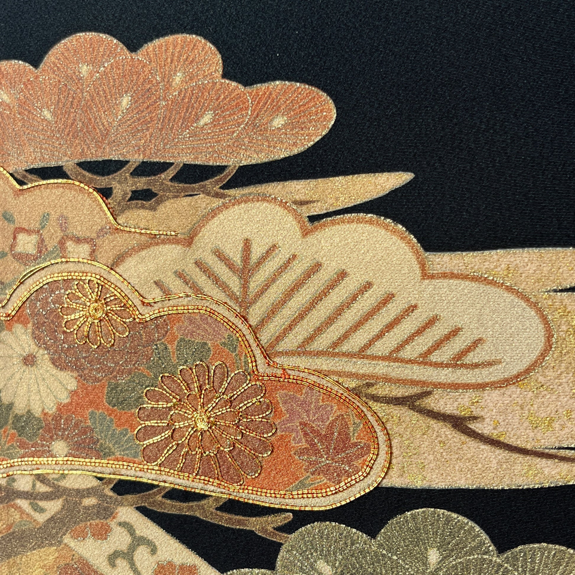 Kuro-tomesode is the most formal kimono worn by married women, typically reserved for ceremonial occasions such as weddings. These garments are crafted from high-quality silk and decorated only below the waist, allowing elaborate landscapes and seasonal motifs to unfold across the hem.