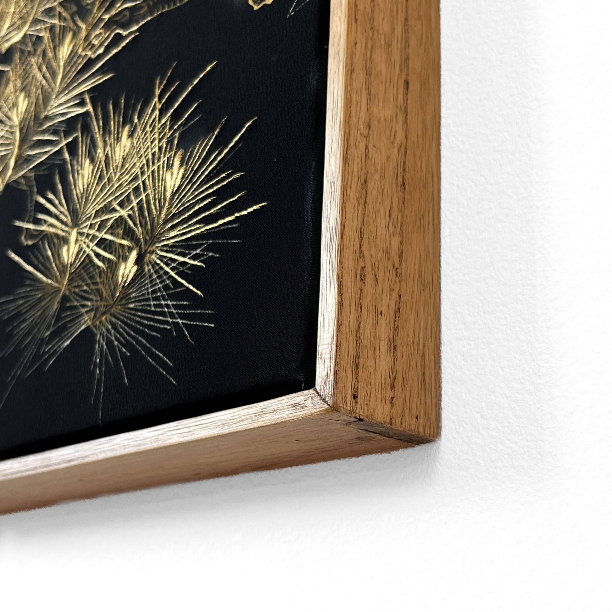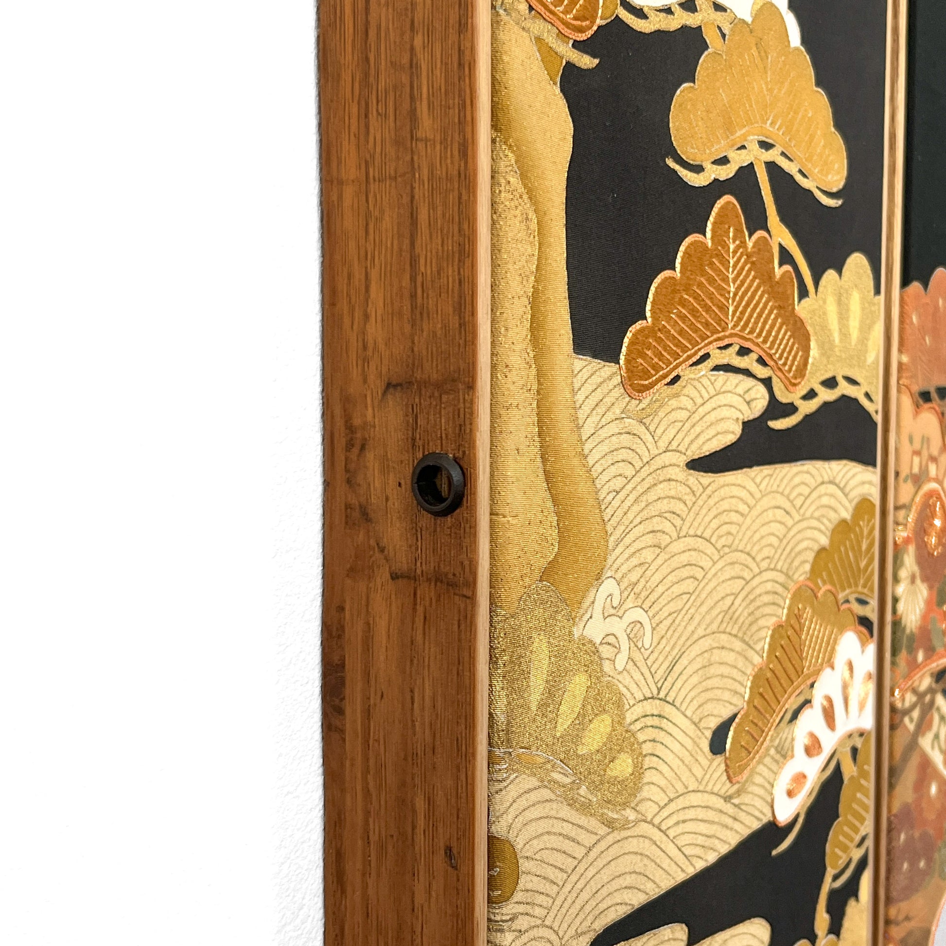 The artwork is framed in antique wood repurposed from traditional Japanese furniture - kiritansu, a chest-of-drawers for keeping kimono, preserving the authentic spirit of historical craftsmanship. The aged wood enhances the natural patina and depth of the textile while reinforcing the philosophy of reuse and cultural continuity.