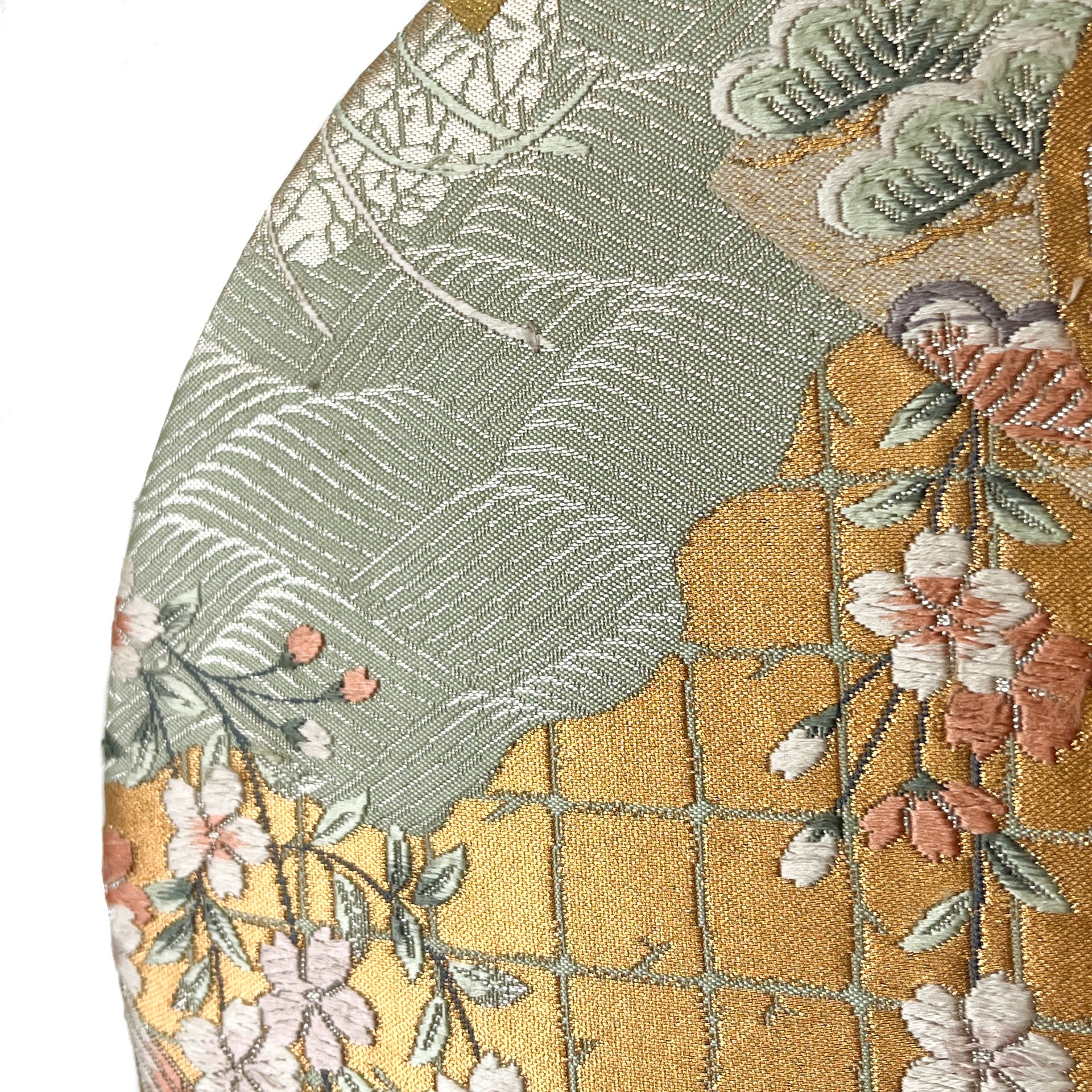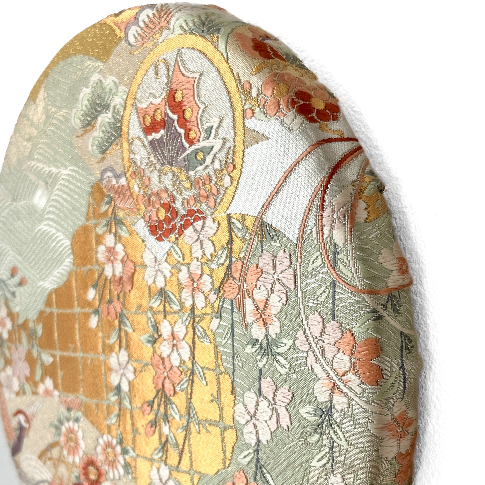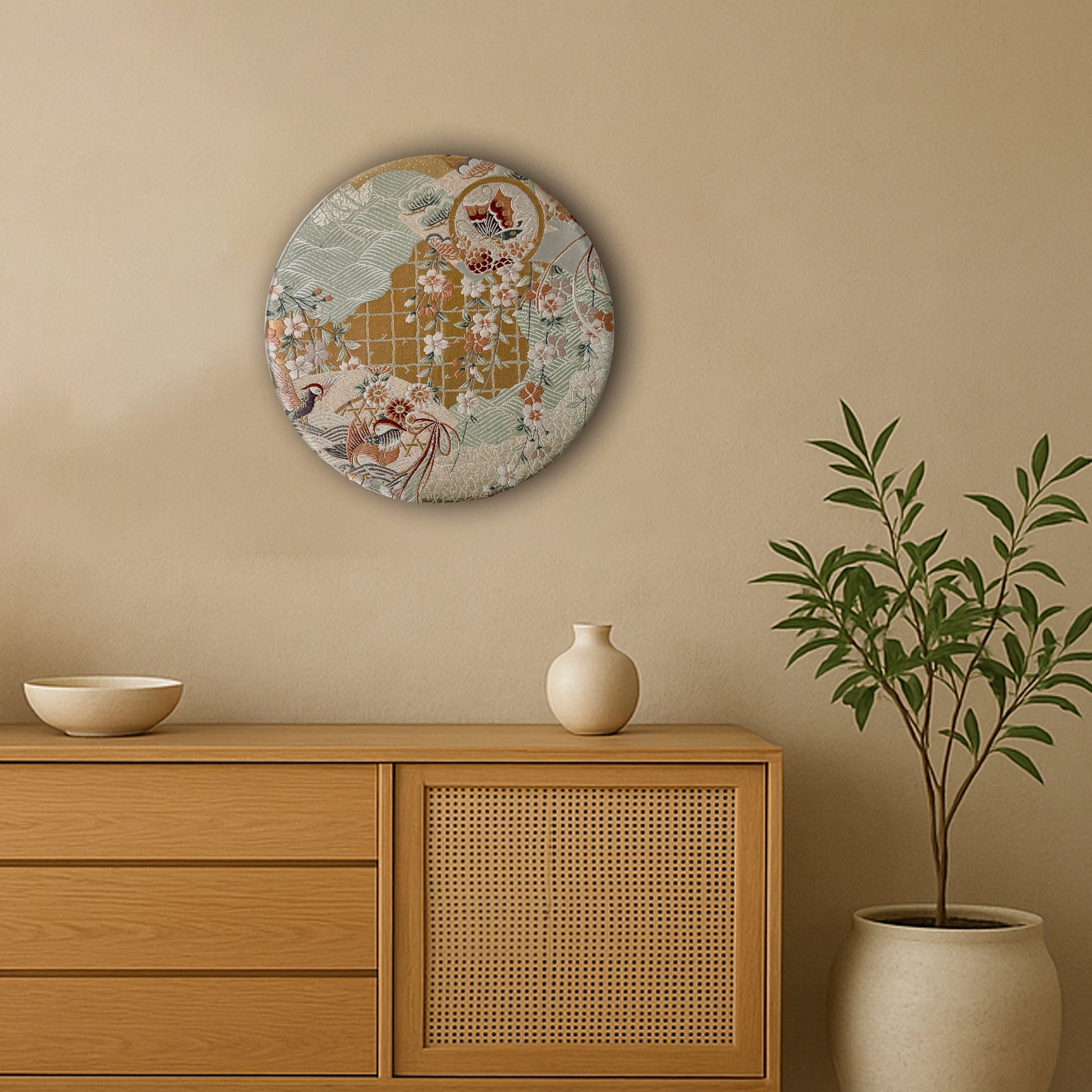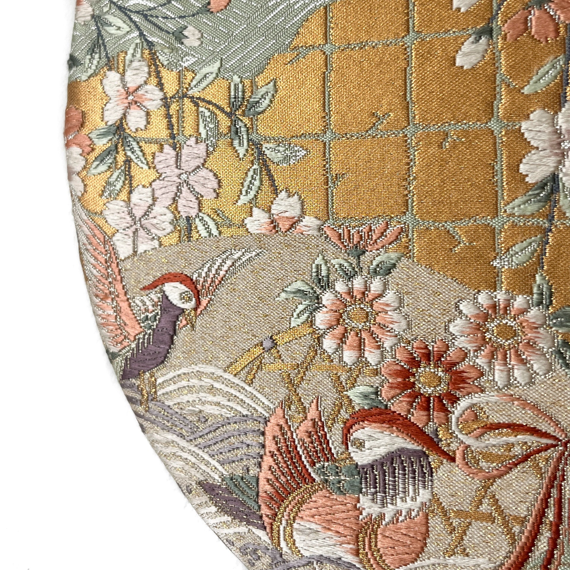 Woven from pure silk with intricate nishijin-ori techniques, the fabric features raised brocade and fine metallic threads that catch light from every angle. The surface offers a luxurious texture—smooth yet dimensional—highlighting each blossom and geometric line. Mounted on a sturdy circular wooden frame, this canvas is ready to hang and requires no additional framing, making it an elegant focal point for any space.