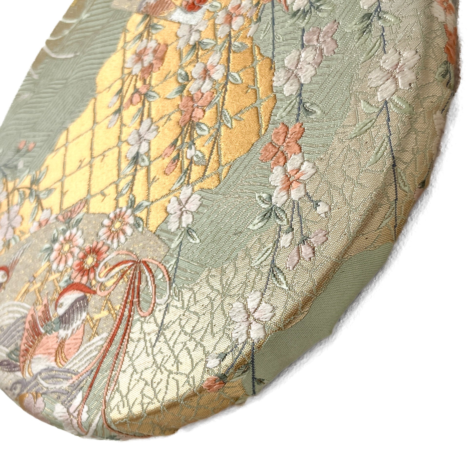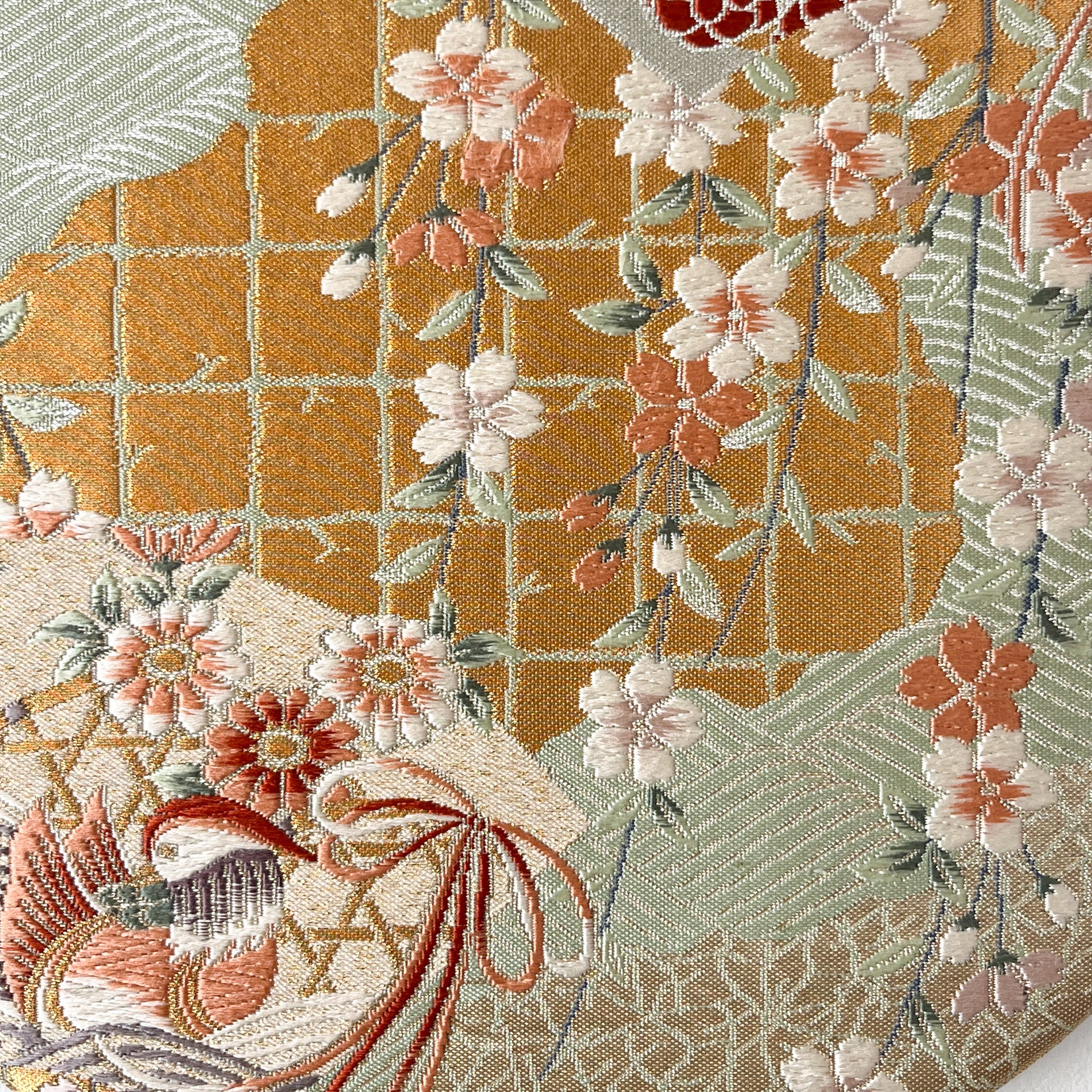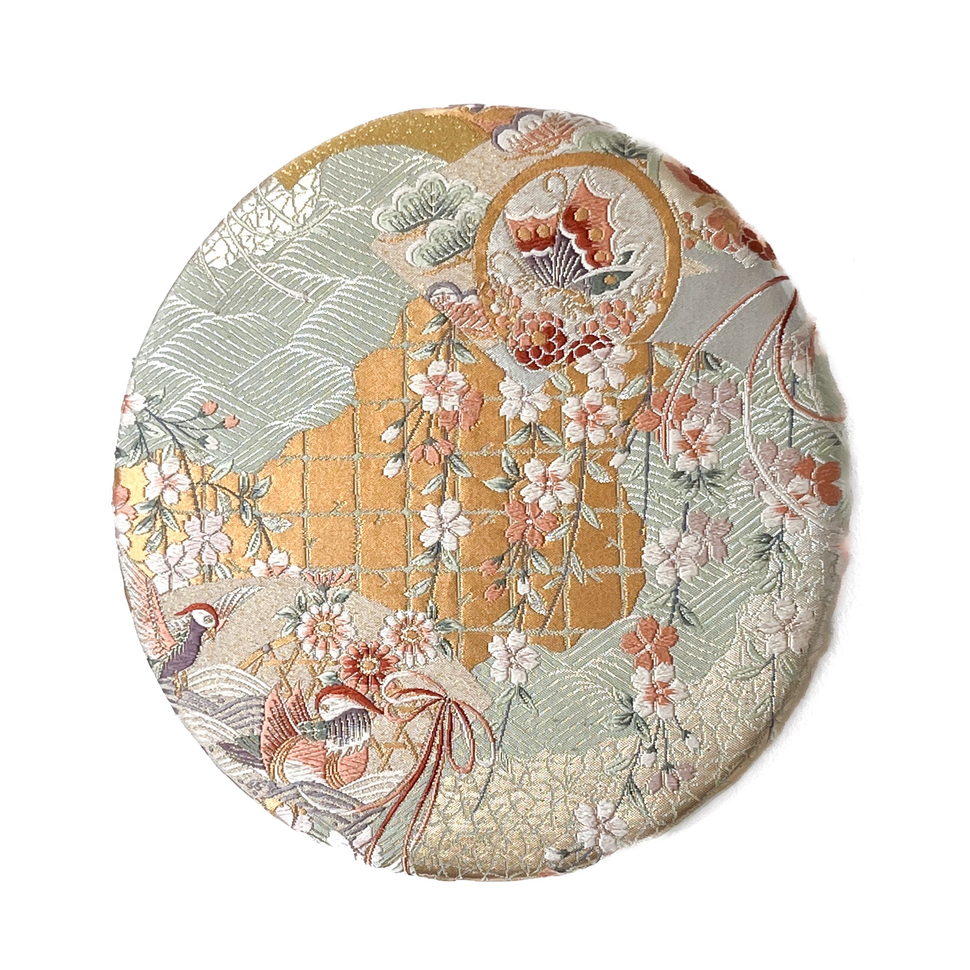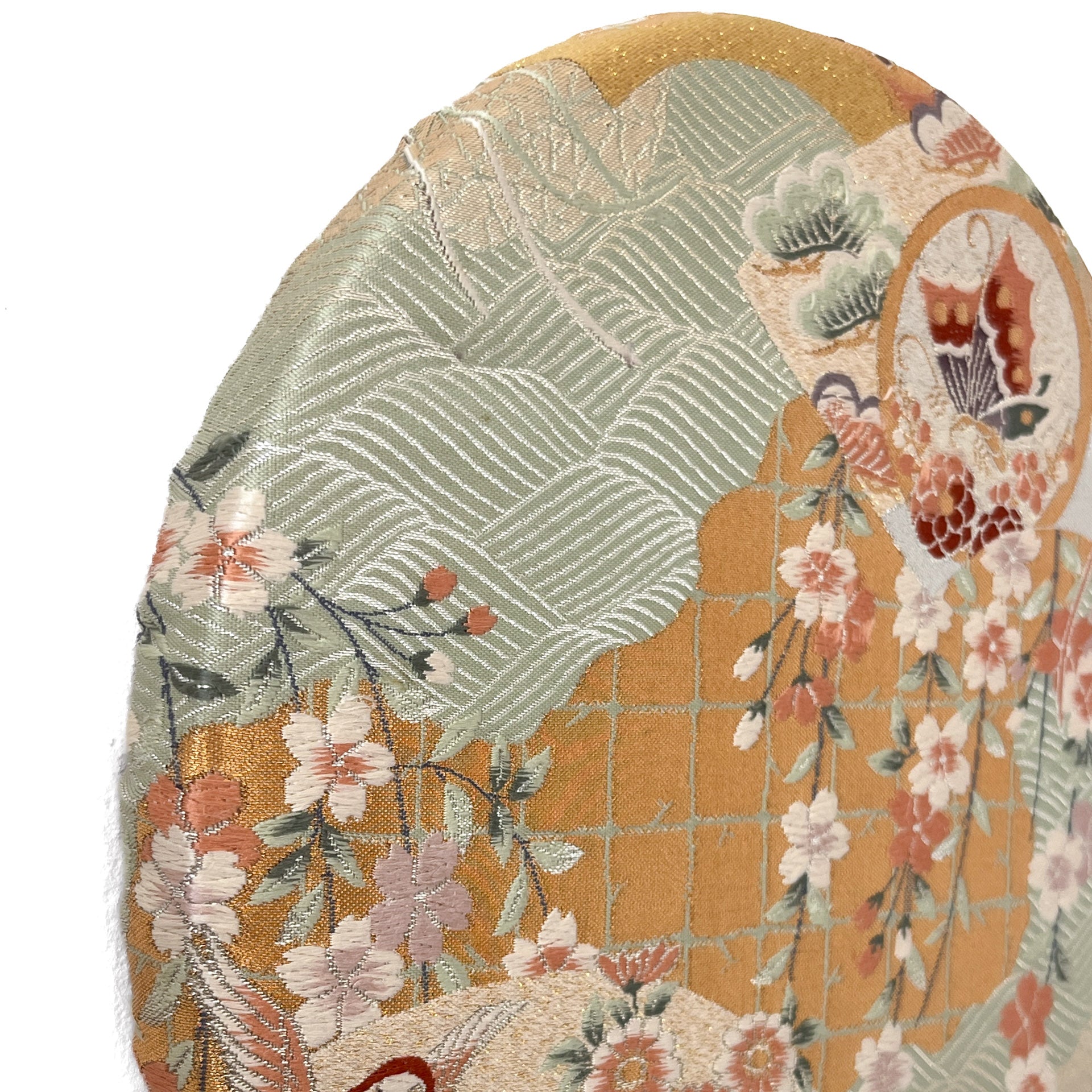 Woven from pure silk with intricate nishijin-ori techniques, the fabric features raised brocade and fine metallic threads that catch light from every angle. The surface offers a luxurious texture—smooth yet dimensional—highlighting each blossom and geometric line. Mounted on a sturdy circular wooden frame, this canvas is ready to hang and requires no additional framing, making it an elegant focal point for any space.