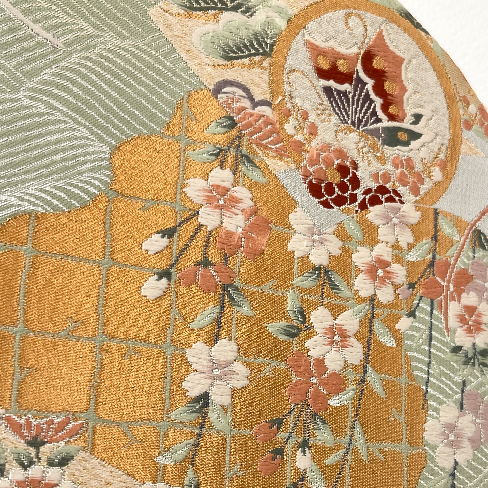 The fabric originates from a mid-Showa era (1950s–60s) formal obi once worn for celebratory occasions such as weddings and seasonal festivals. By transforming it into a canvas, ikasu preserves the spirit of joy and renewal while giving it a second life as sustainable art.