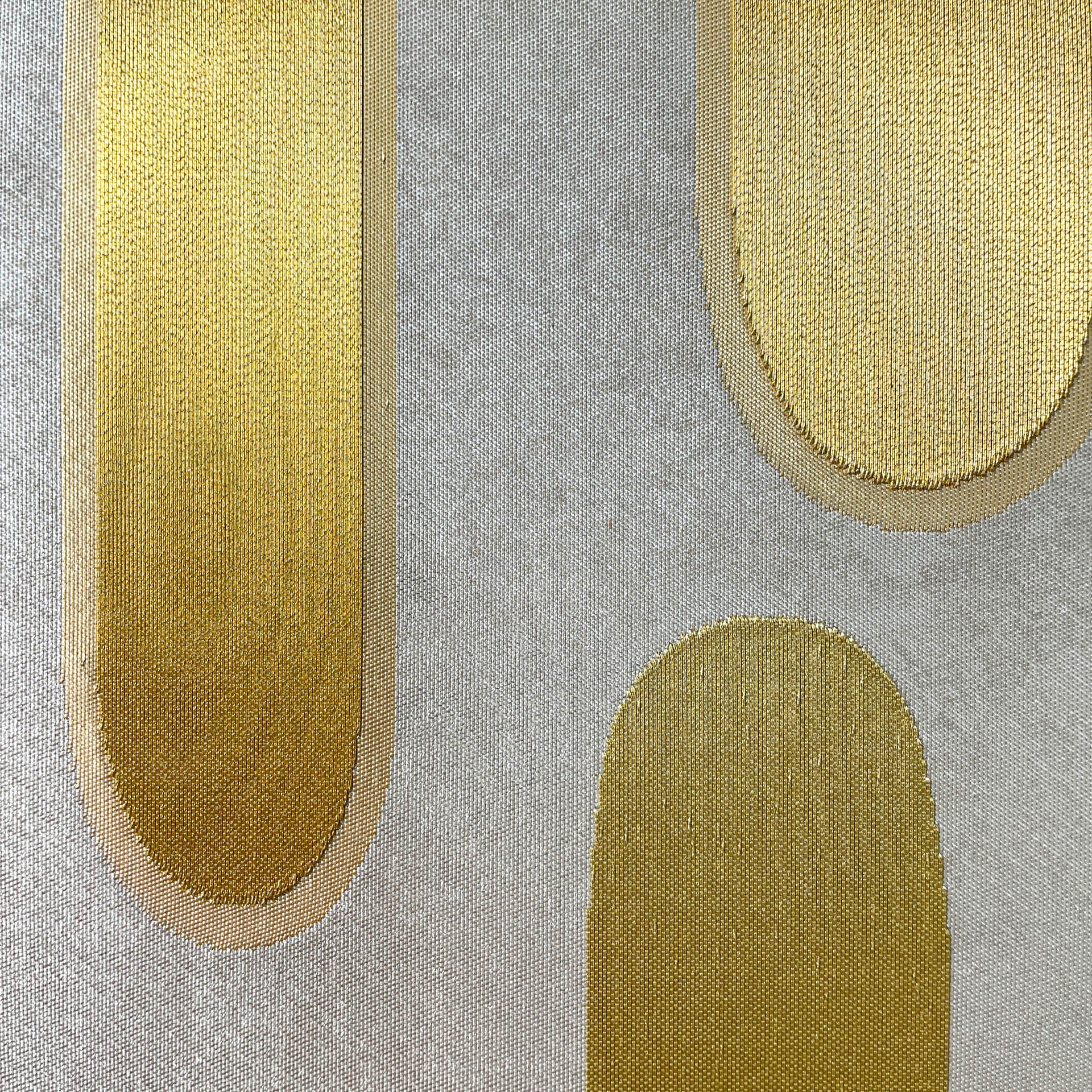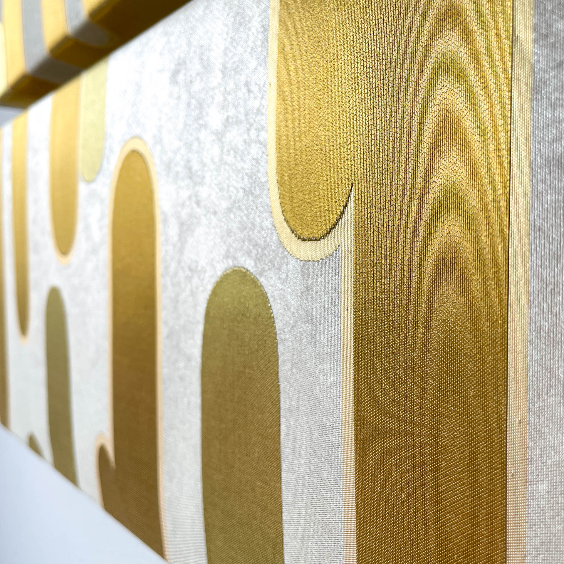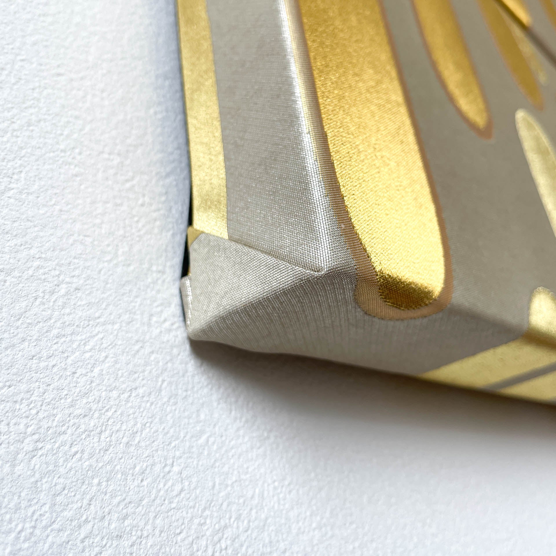 This weaving technique, known as "hikihaku," involves weaving ultra-thin foil into the weft of Nishijin brocade and Karaori brocade. By incorporating the foil into the fabric's ground weave, it achieves a subtle and refined gold or silver appearance without appearing excessively gilded.