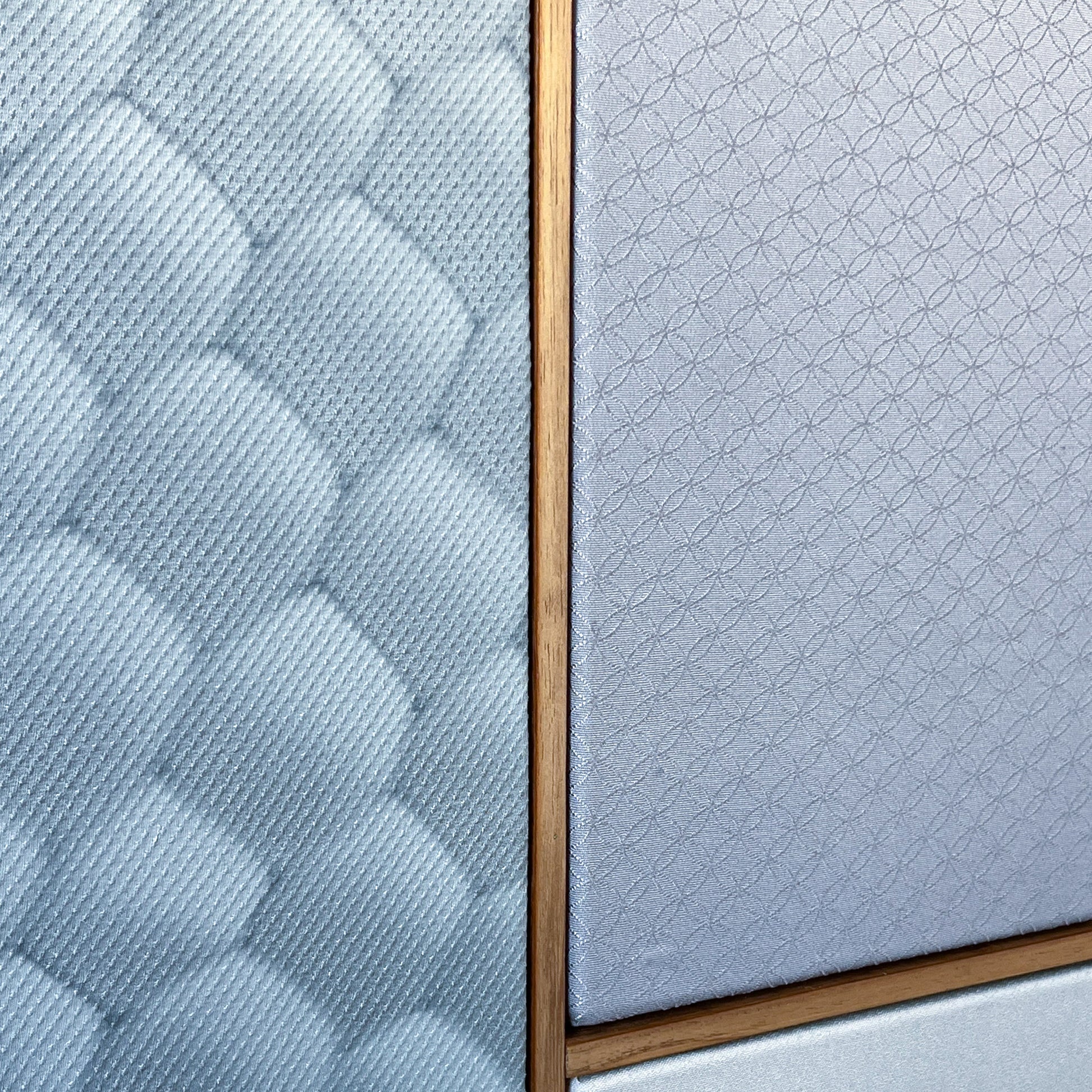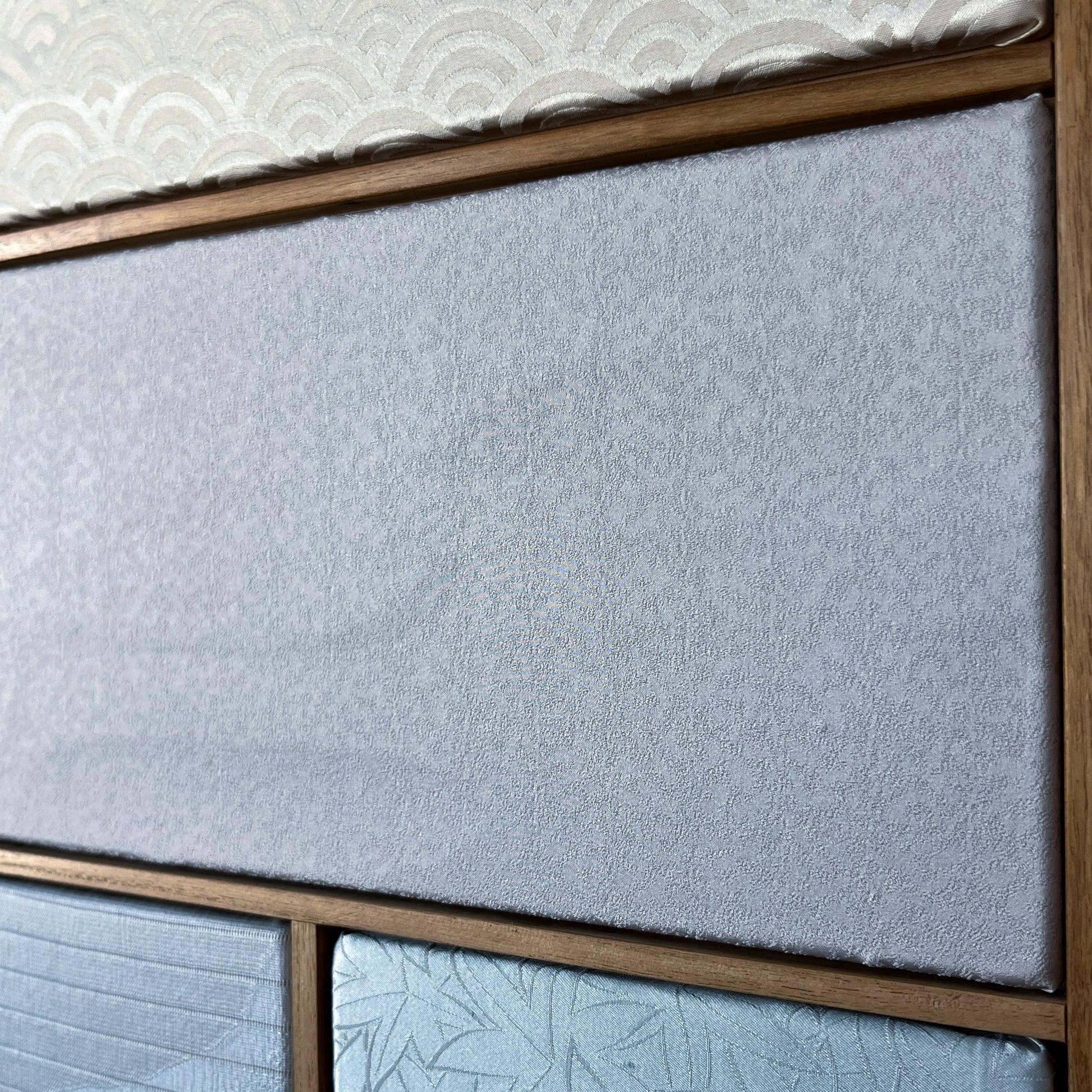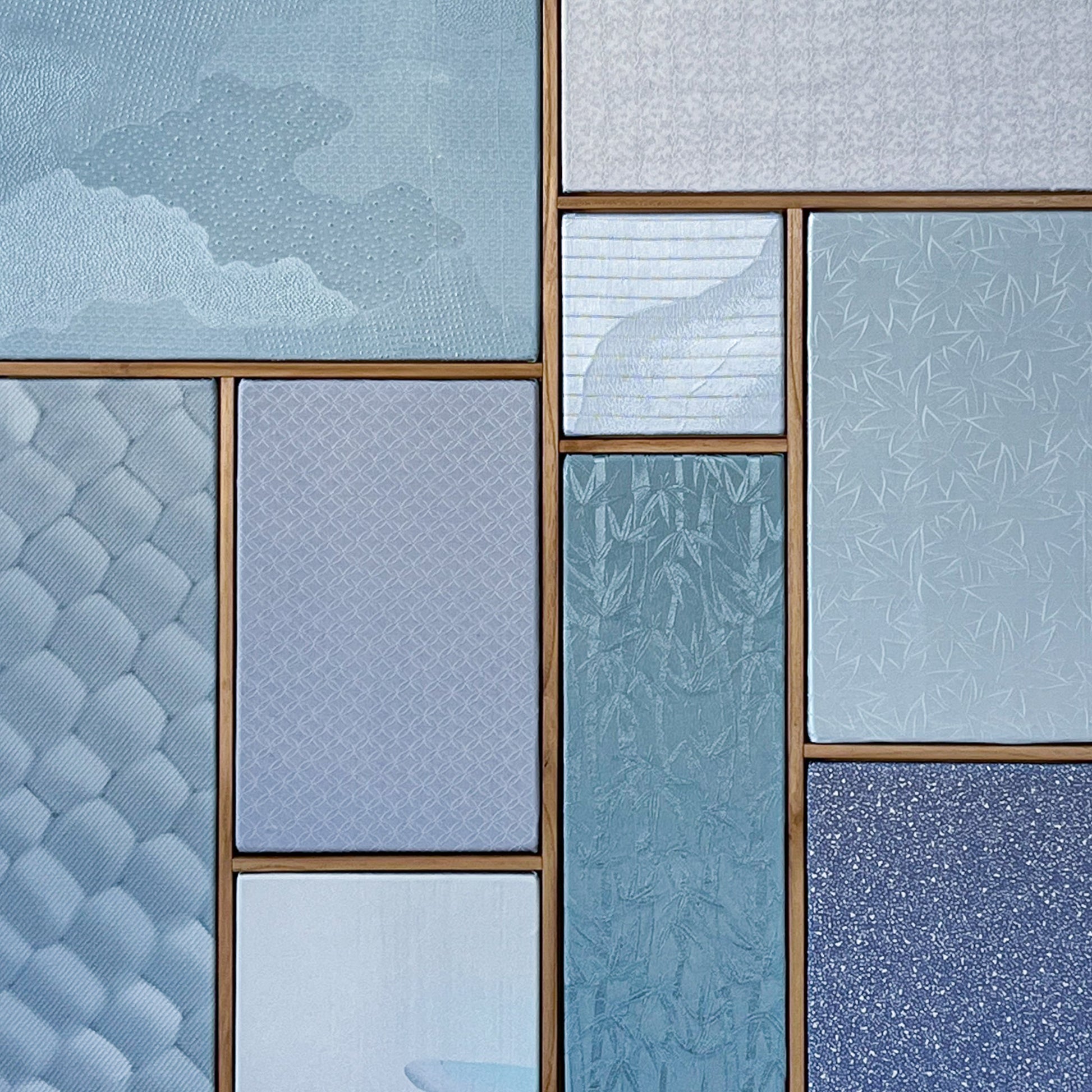 This artwork explores subtlety, atmosphere, and the quiet poetry of blue tones through a composition of vintage kimono textiles arranged in a structured, grid-like format.