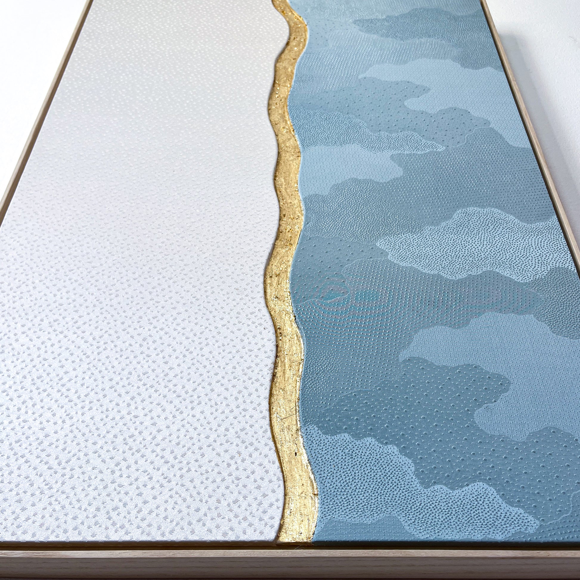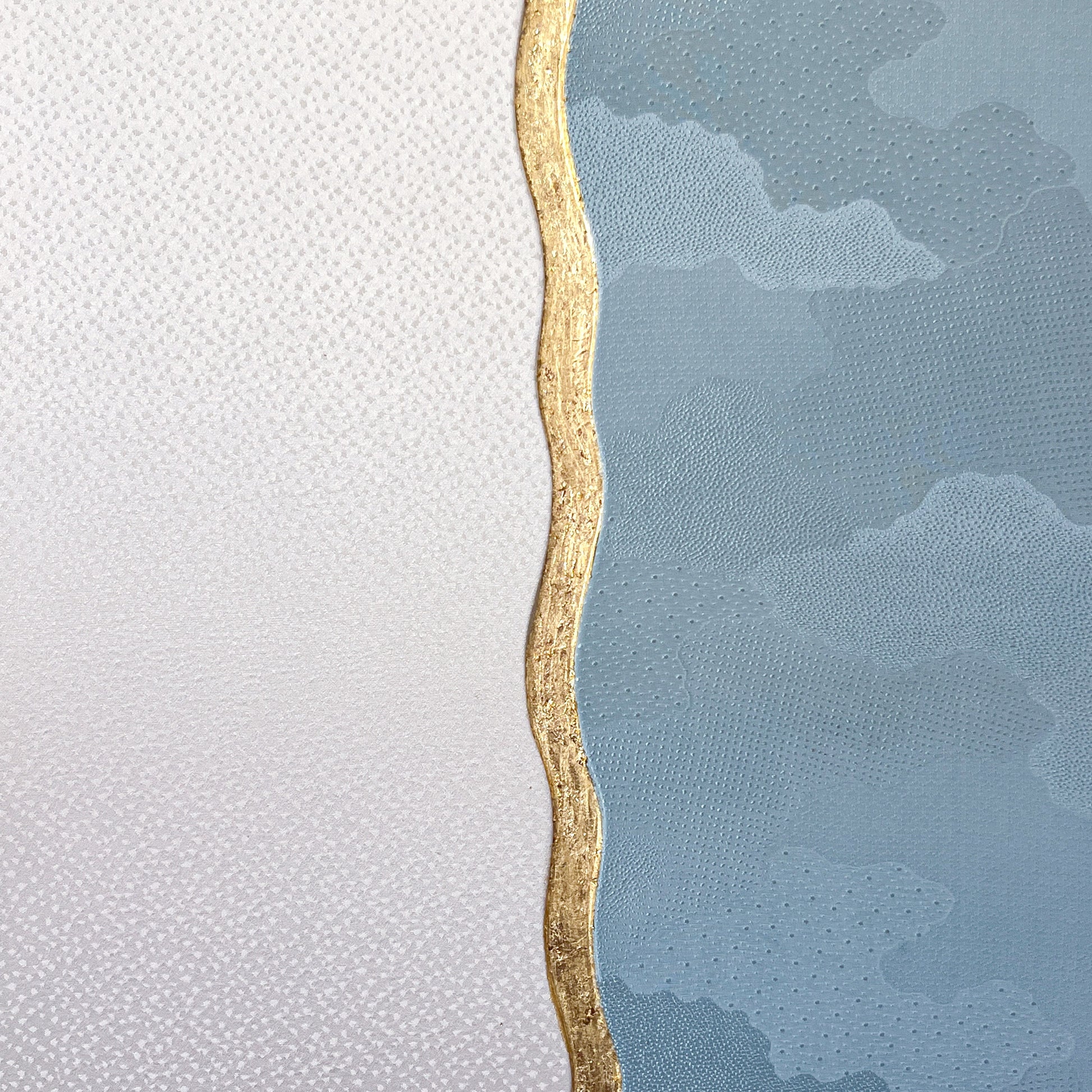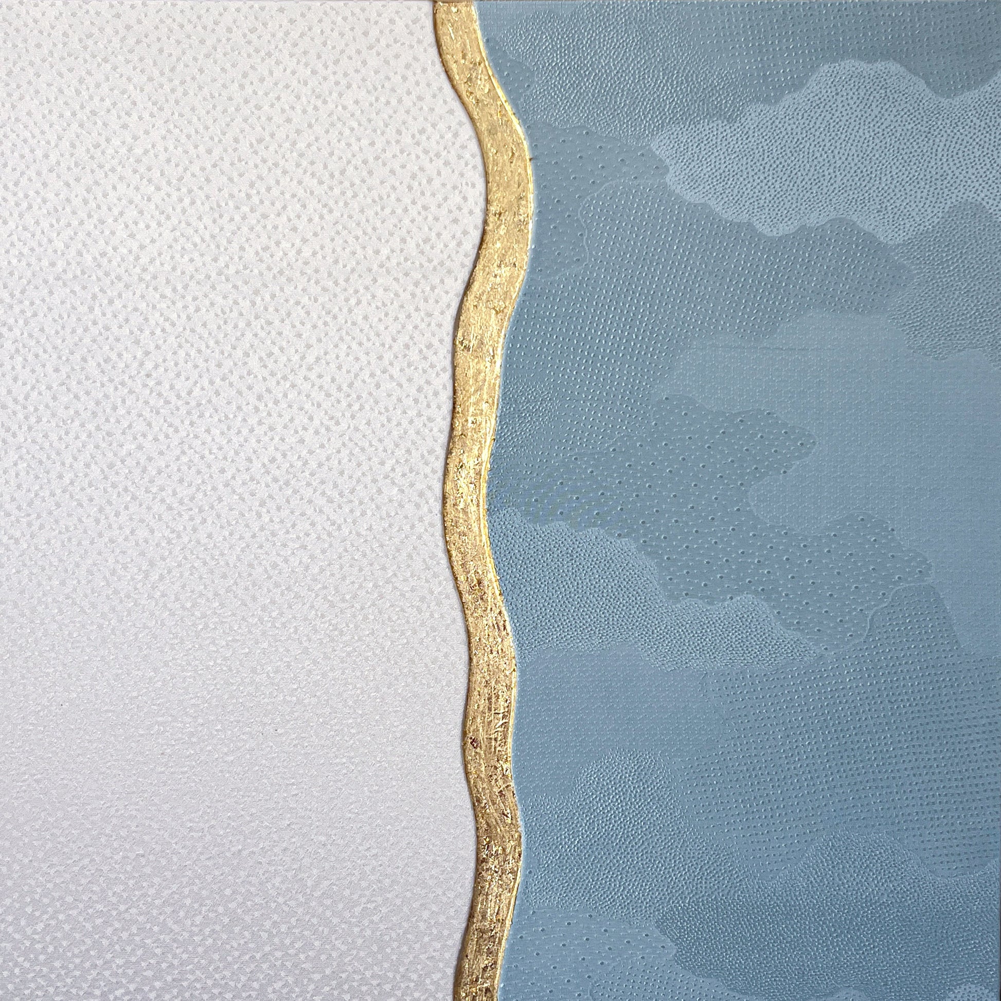 The flowing curved line dividing the composition is highlighted with hand-applied gold leaf. Rather than acting as a boundary, this shimmering line symbolizes transition and connection - the moment where winter air meets the open sky. Its organic movement reflects the rhythm of nature and introduces a contemporary artistic gesture inspired by traditional Japanese decorative techniques.
