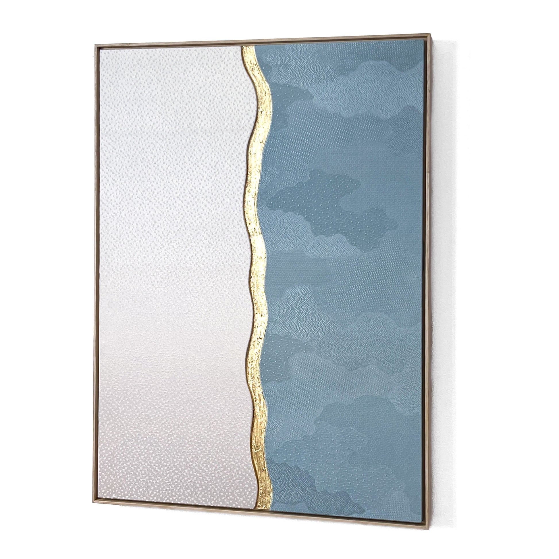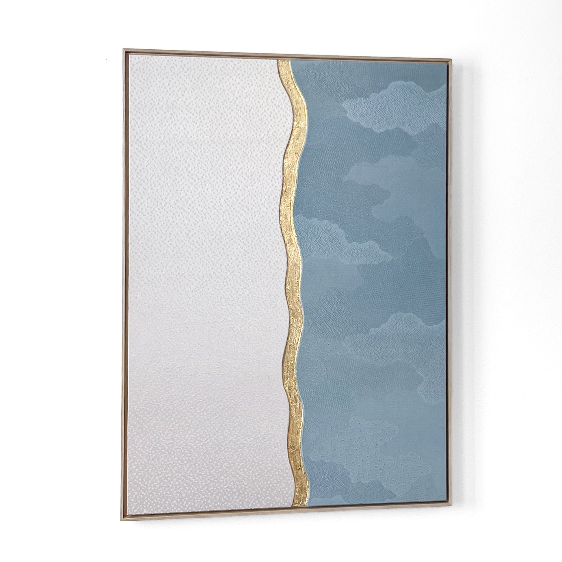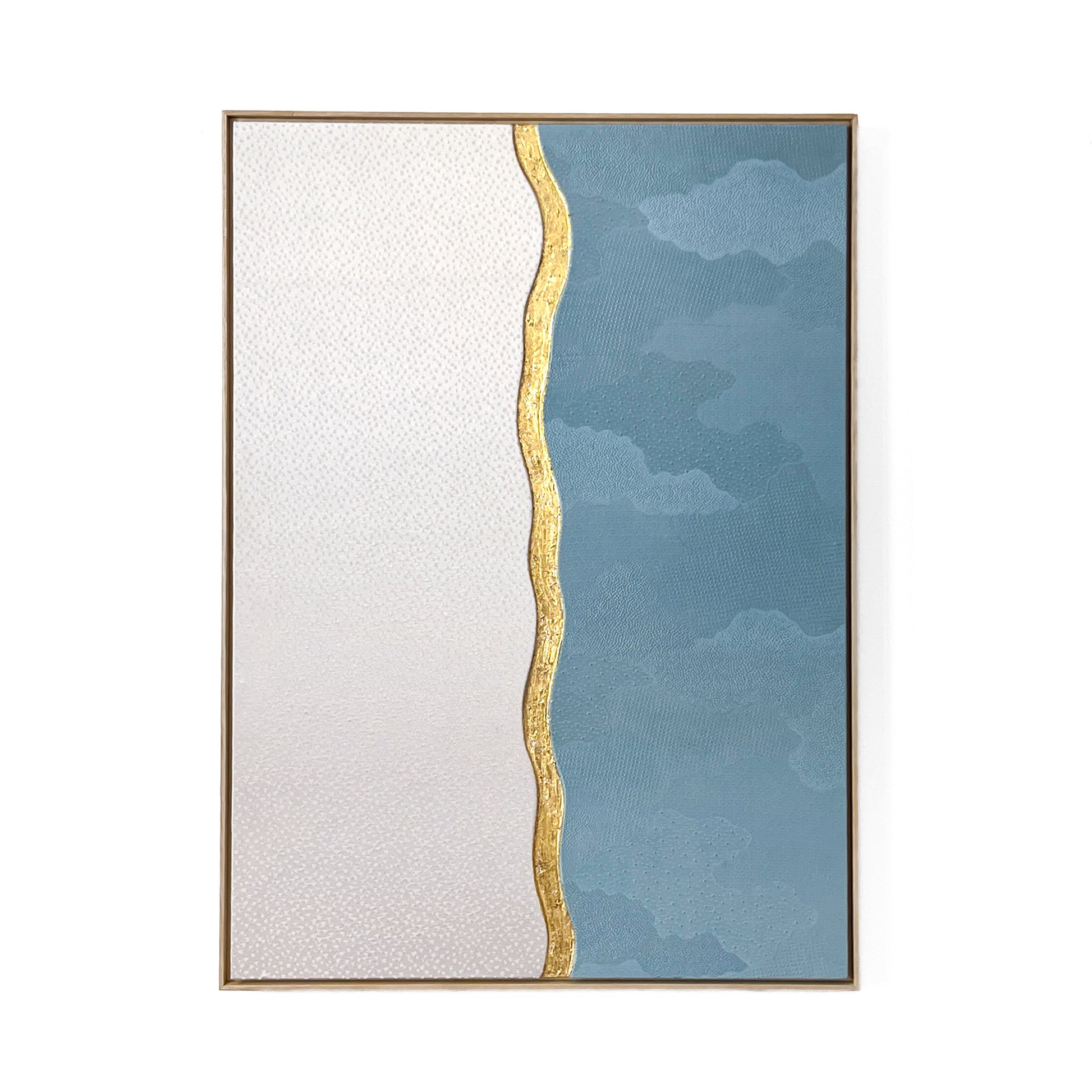 The flowing curved line dividing the composition is highlighted with hand-applied gold leaf. Rather than acting as a boundary, this shimmering line symbolizes transition and connection - the moment where winter air meets the open sky. Its organic movement reflects the rhythm of nature and introduces a contemporary artistic gesture inspired by traditional Japanese decorative techniques.