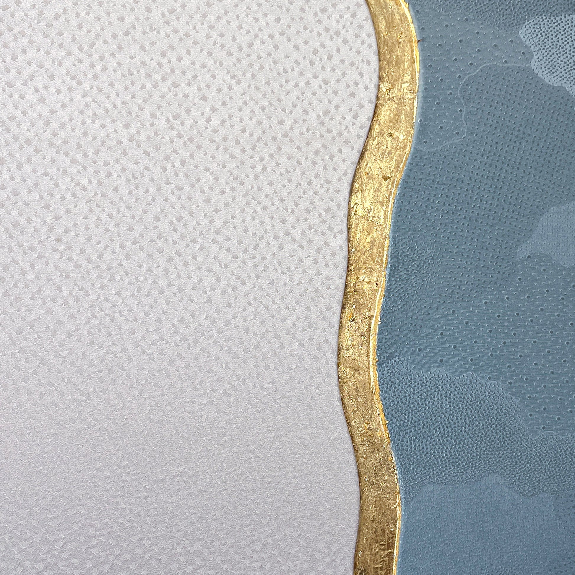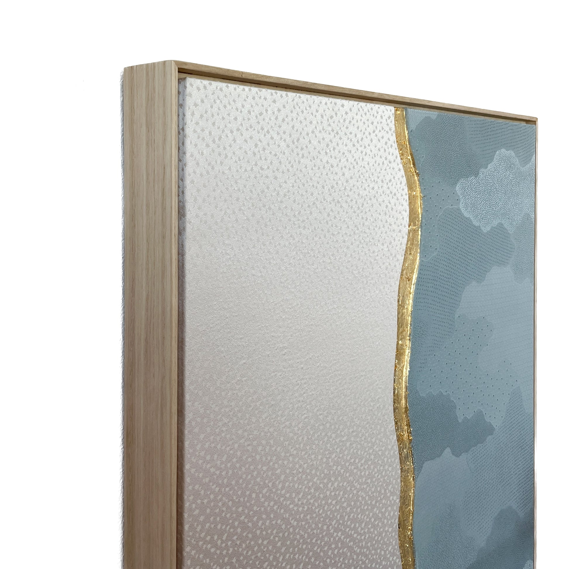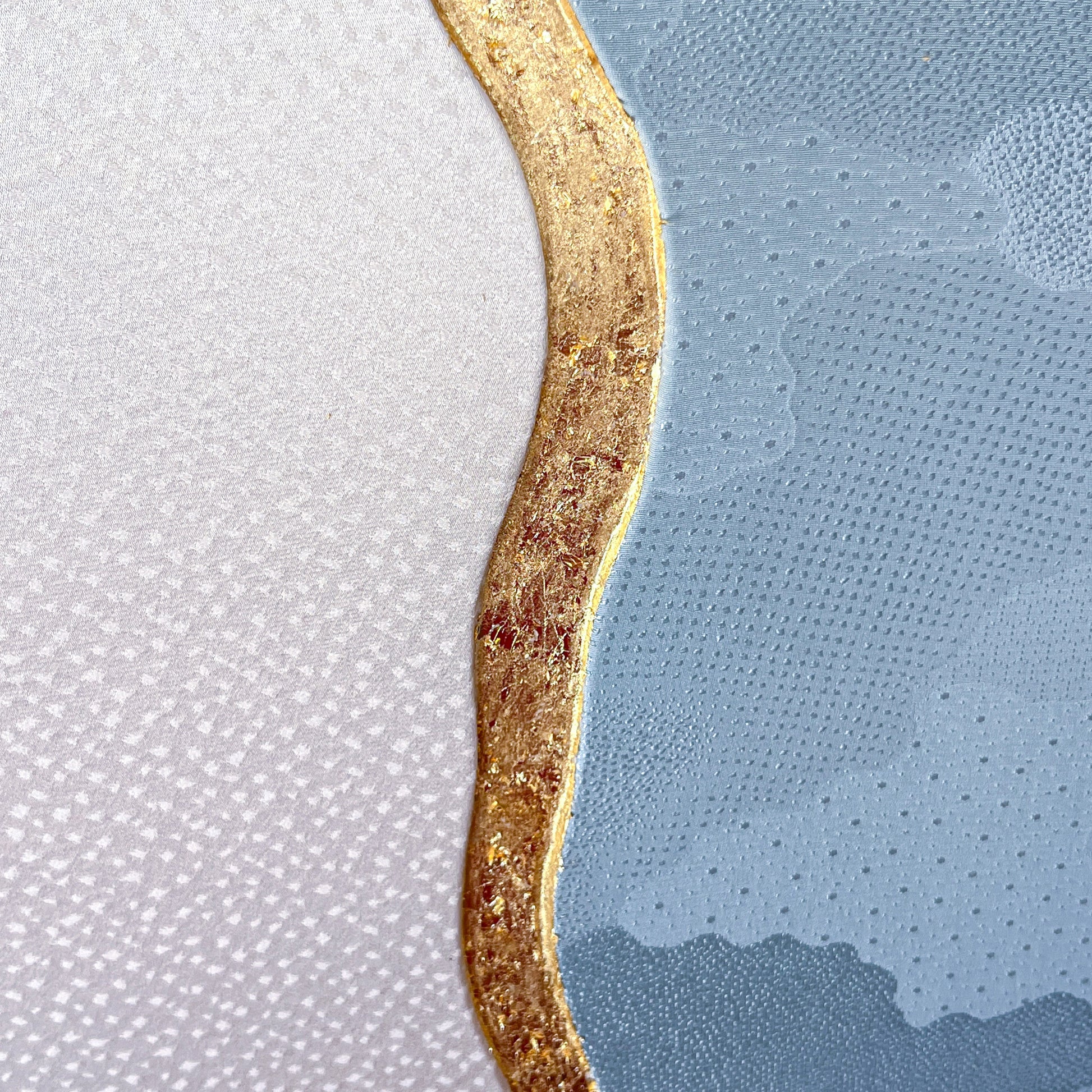 This artwork explores harmony through contrast, using two distinct vintage kimono textiles united within a single composition. On the left, a soft ivory silk reveals a delicate snow 地紋 (jimon) pattern. On the right, a serene blue textile carries an elegant cloud 地紋 (jimon) motif. Together they evoke a quiet landscape where sky and snowfall meet.