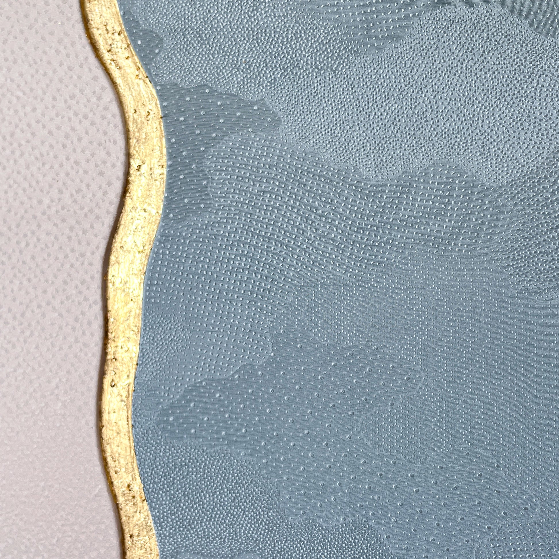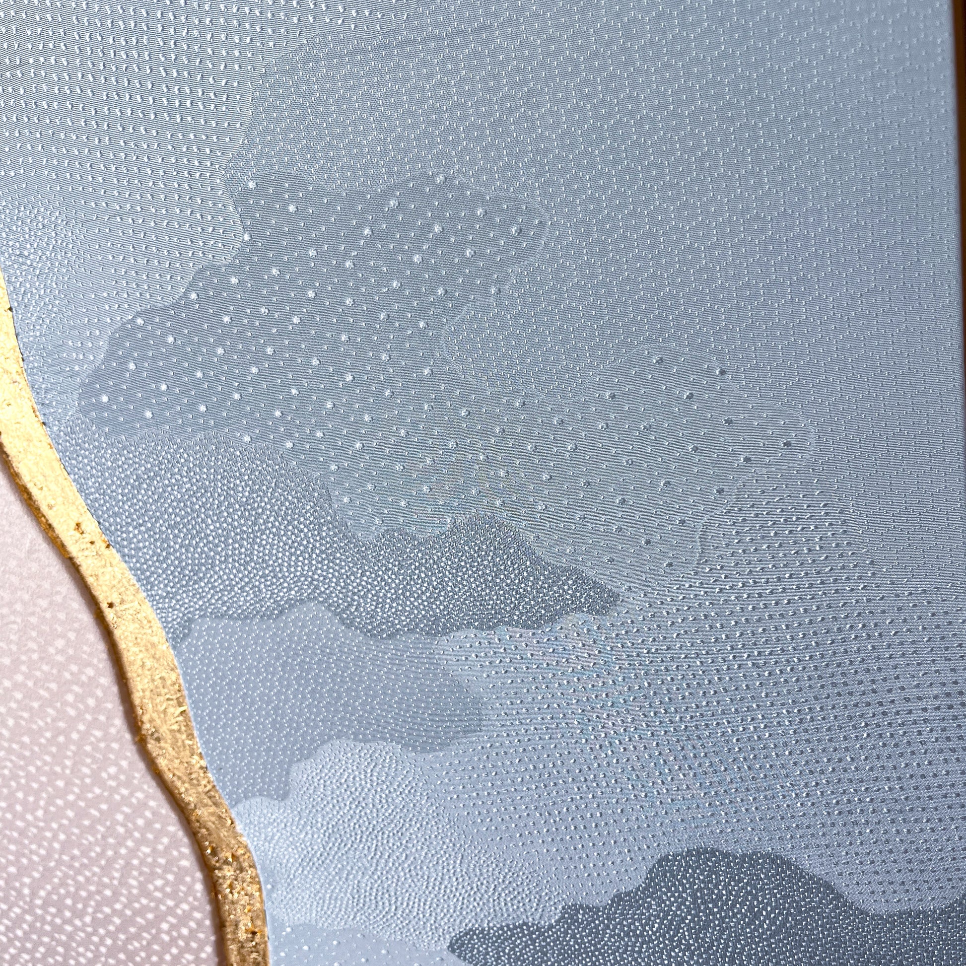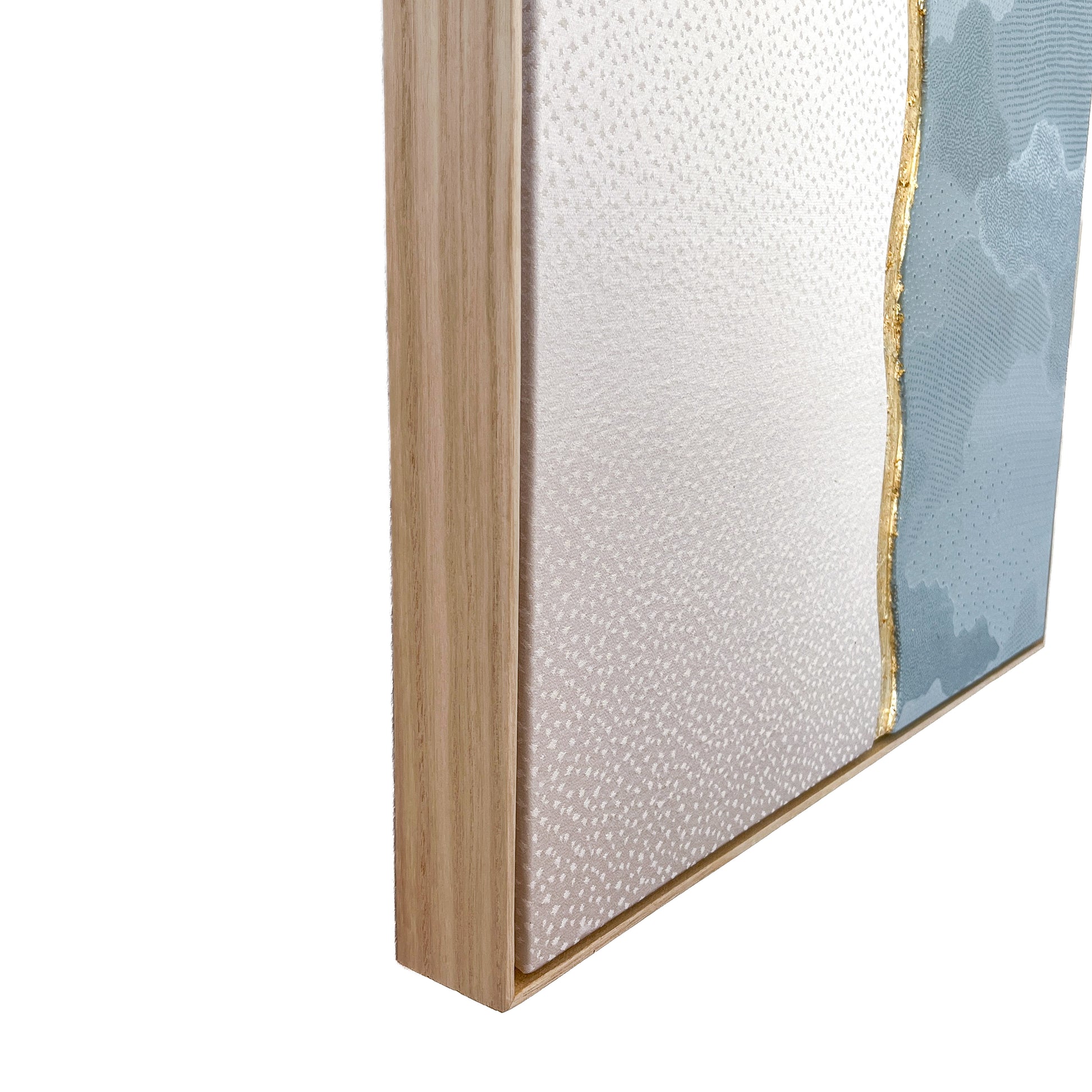 This artwork explores harmony through contrast, using two distinct vintage kimono textiles united within a single composition. On the left, a soft ivory silk reveals a delicate snow 地紋 (jimon) pattern. On the right, a serene blue textile carries an elegant cloud 地紋 (jimon) motif. Together they evoke a quiet landscape where sky and snowfall meet.