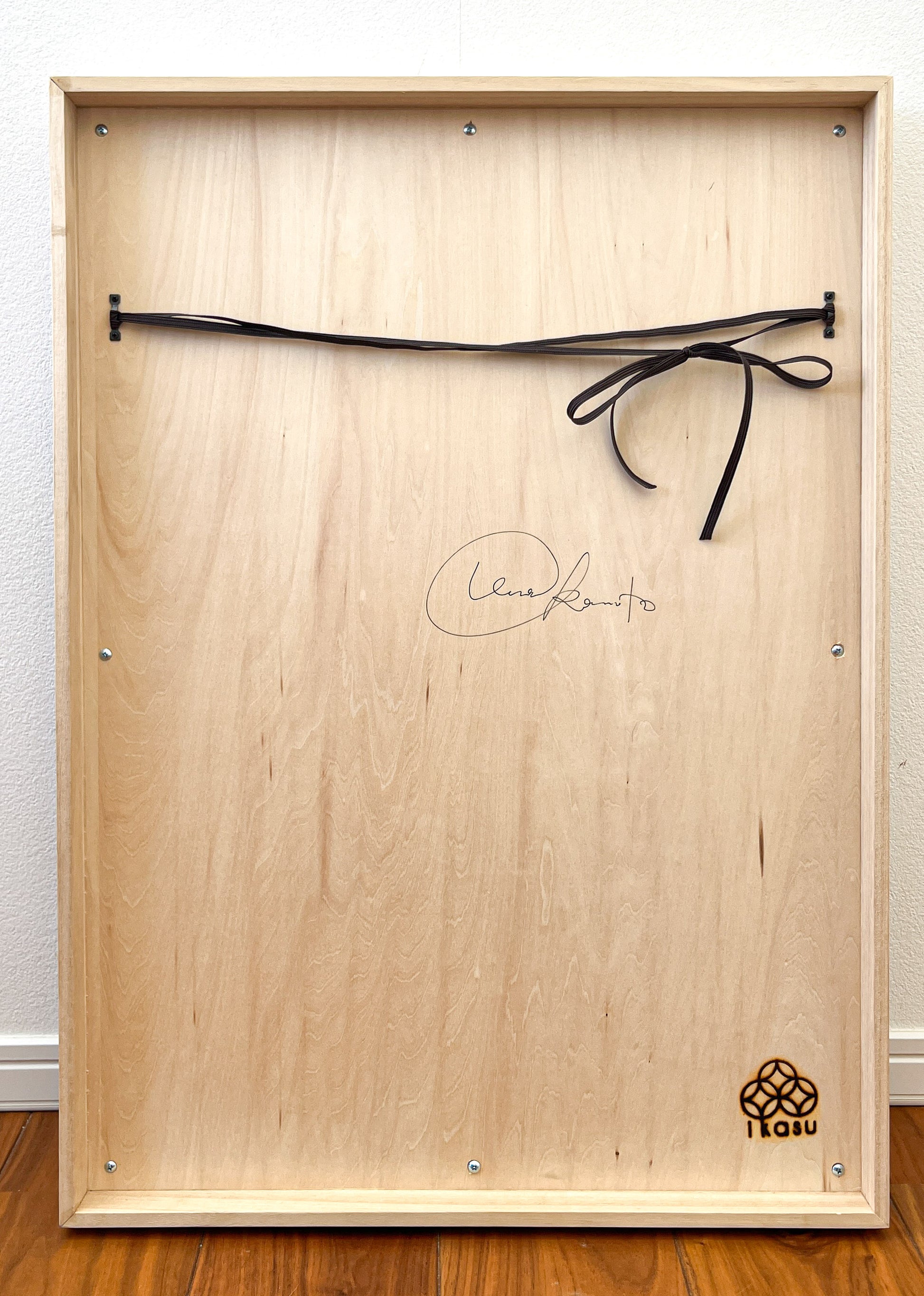 The artwork is framed in natural kiri (桐) paulownia wood. Traditionally used in Japan for storing precious textiles and artworks, kiri wood is valued for its lightness, durability, and resistance to humidity.