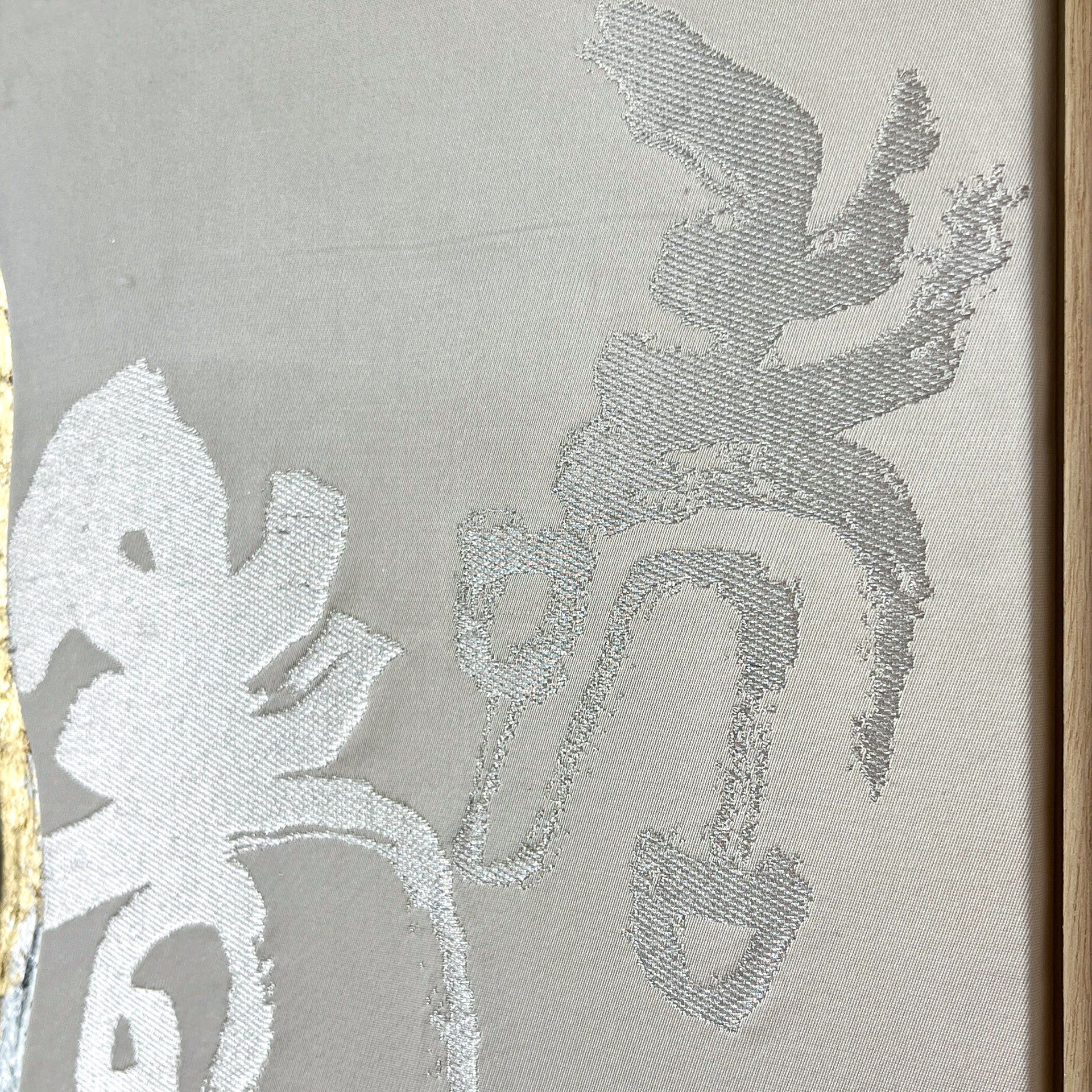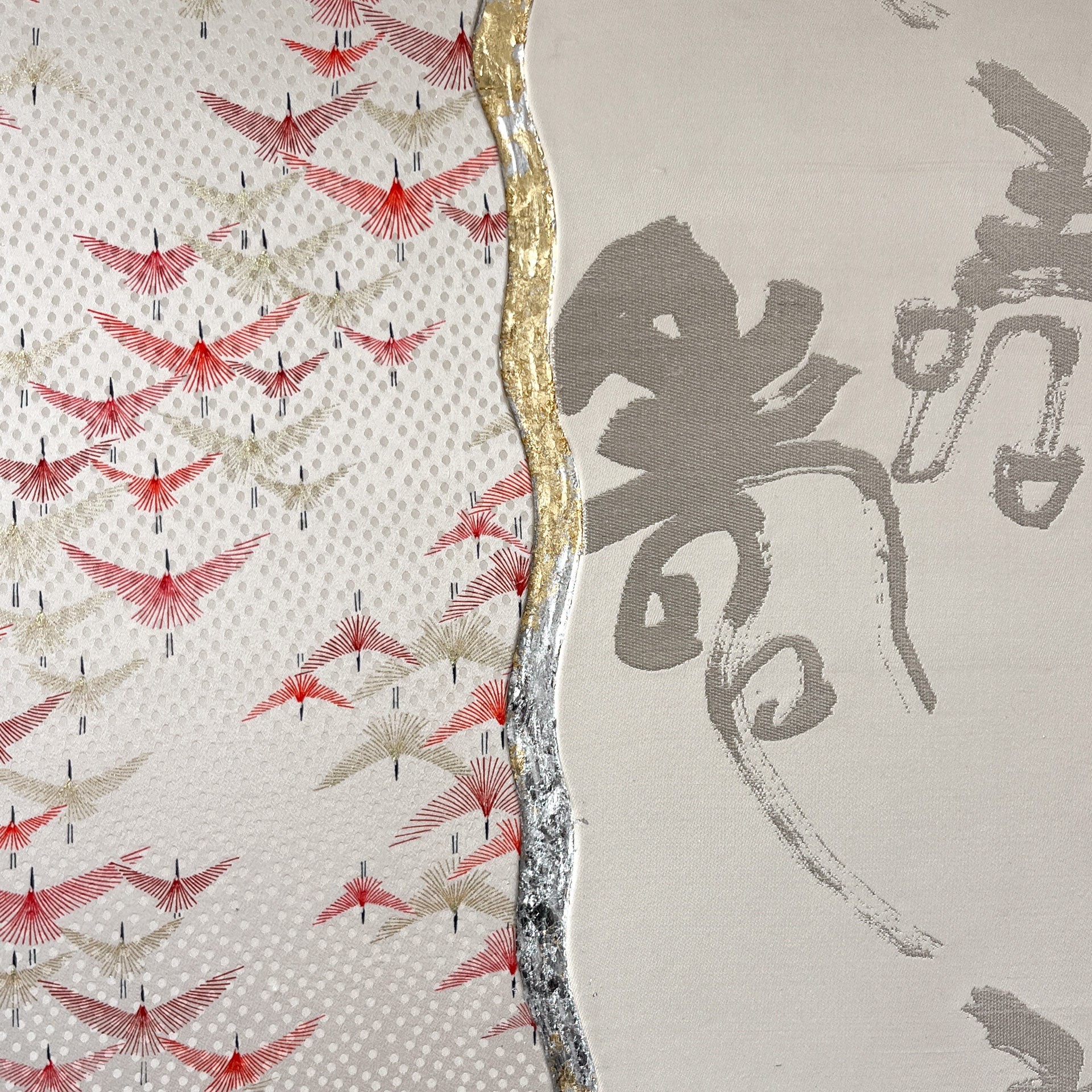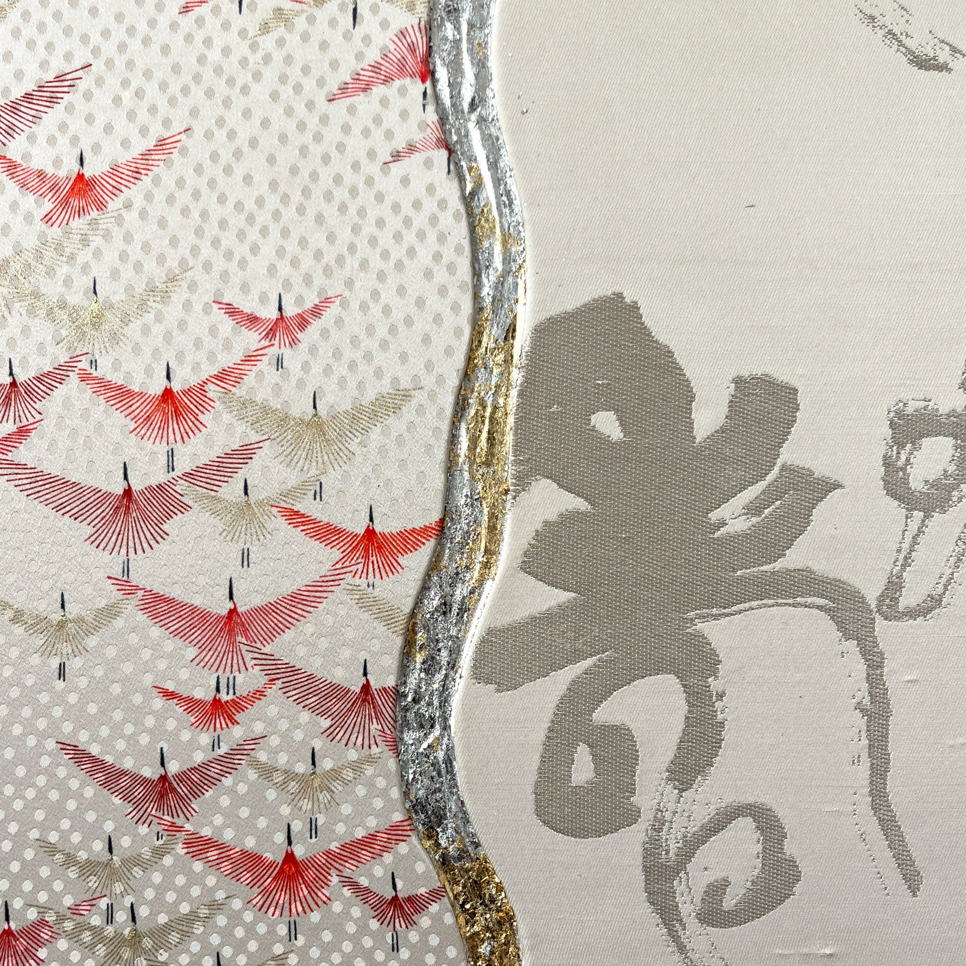 The piece uses the traditional Japanese concept of "kintsugi" - it "unites" the pieces of antique obi back together with silver leaf to give it a second wind as art work.