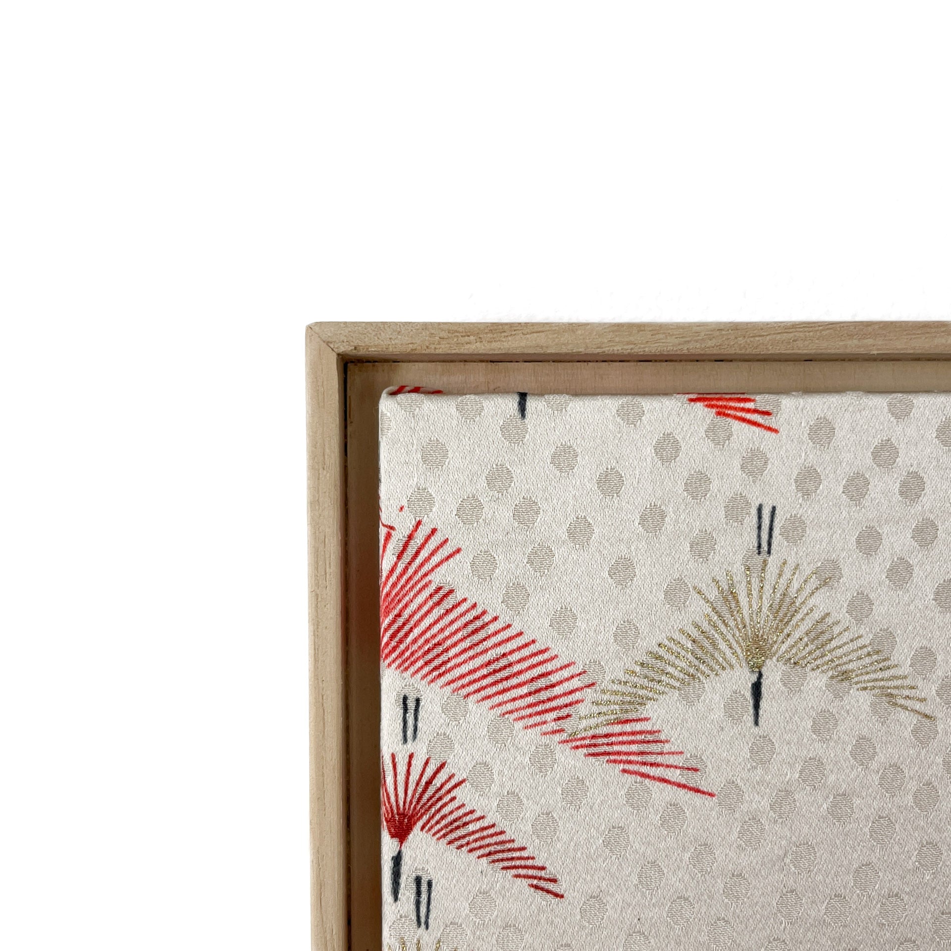 This artwork uses antique kimono fabric with cranes - symbol of longevity on the left side, and vintage obi (sash for kimono) fabric with woven word “Longevity” on the right, to express the wish for long life to its owner.