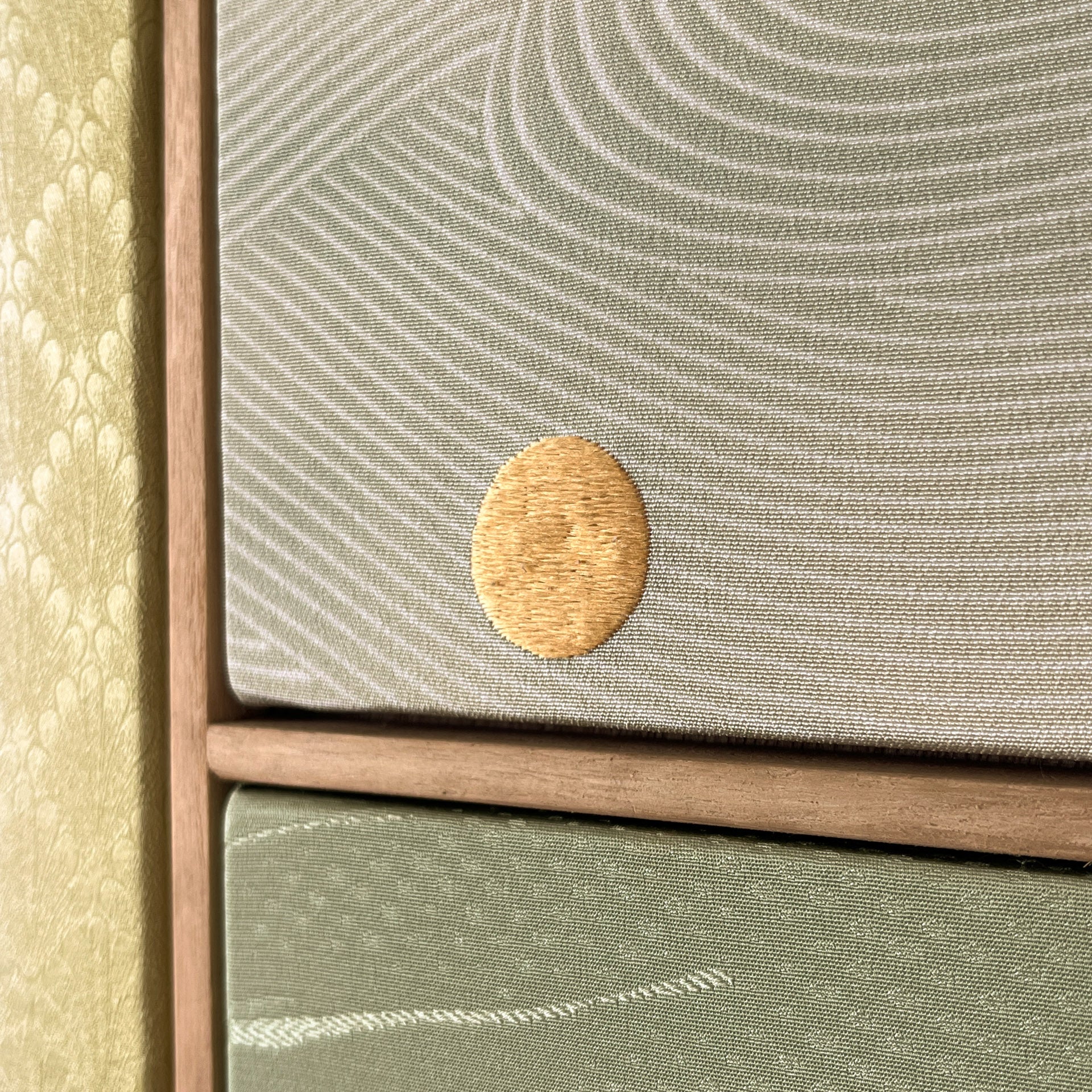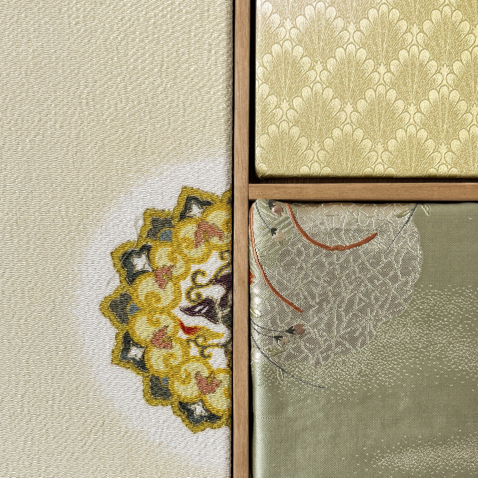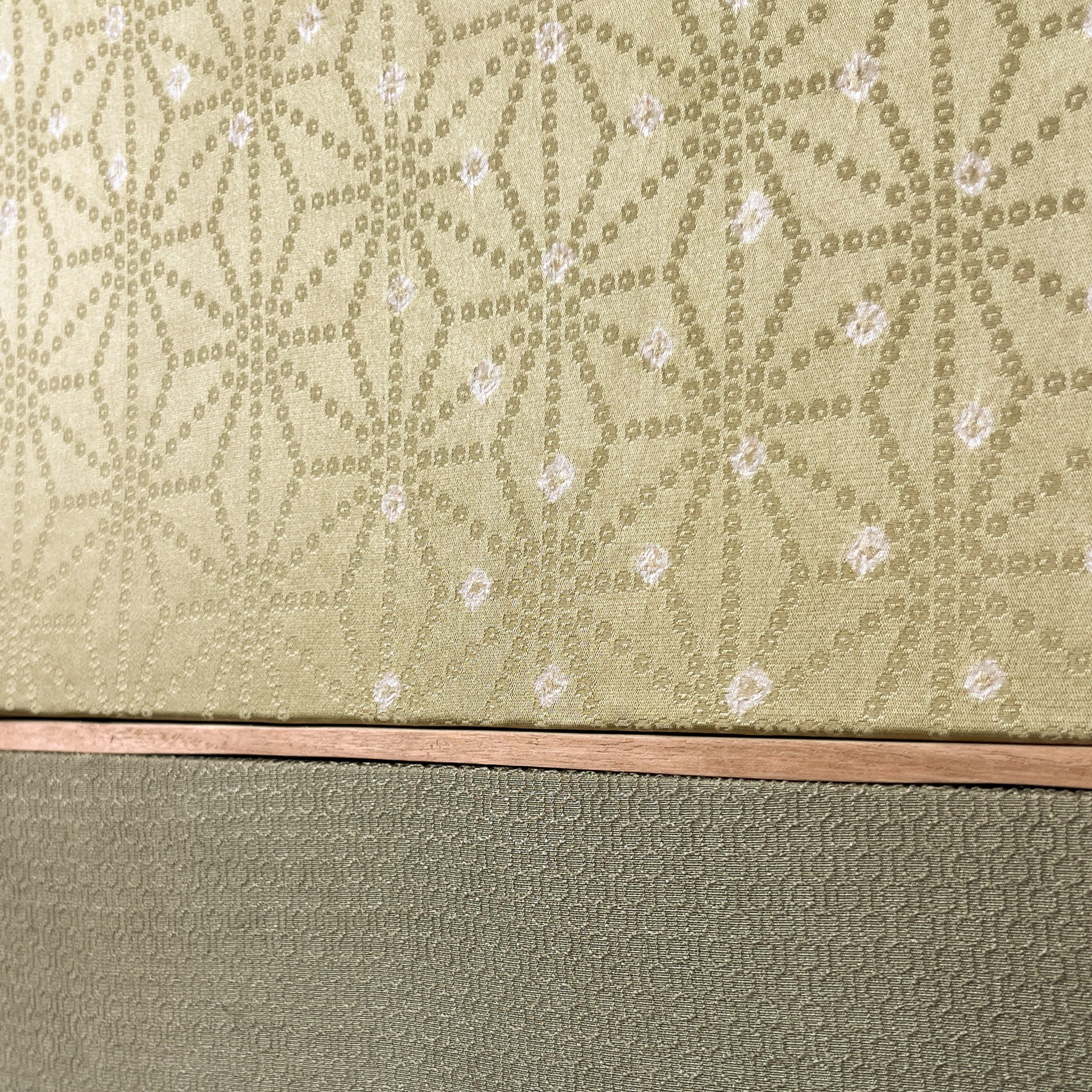 In this artwork, the aim was to capture the wide palette of green color commonly used in antique kimono. Traditional Japanese culture, represented by the kimono, and wood, an integral element of Japanese craftsmanship, were used to bring this vision to life.